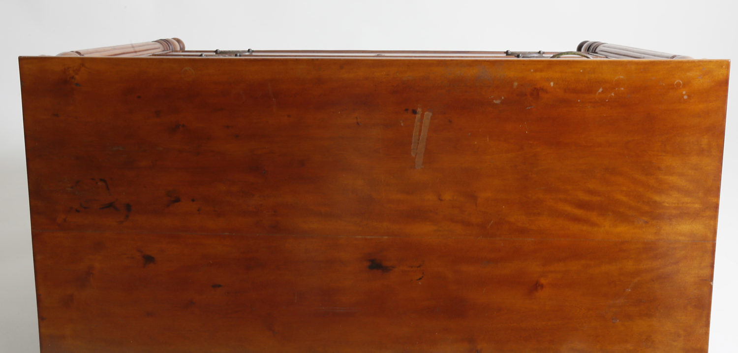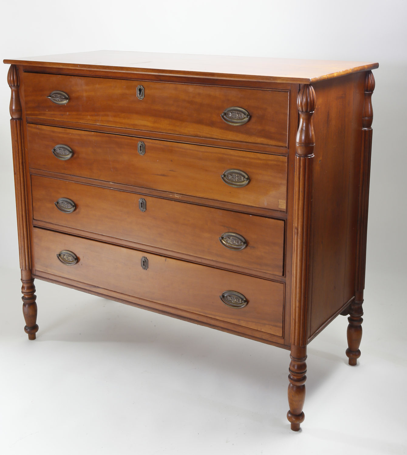 Early 19th Century Connecticut River Valley Cherry Chest of Drawers Consign Now DeptFurniture/Decorative ArtsSizeHeight 37 ½ in. Width 41 ½ in. Depth 18 ¾ in. Early 19th Century Connecticut River Valley Cherry Chest of Drawers, with outset three quarter carved reeded columns on turned legs, oval embossed brass pulls. Height 37 ½ in. Width 41 ½ in. Depth 18 ¾ in. Please note that this auction has ended. Click here for an overview of this auction.