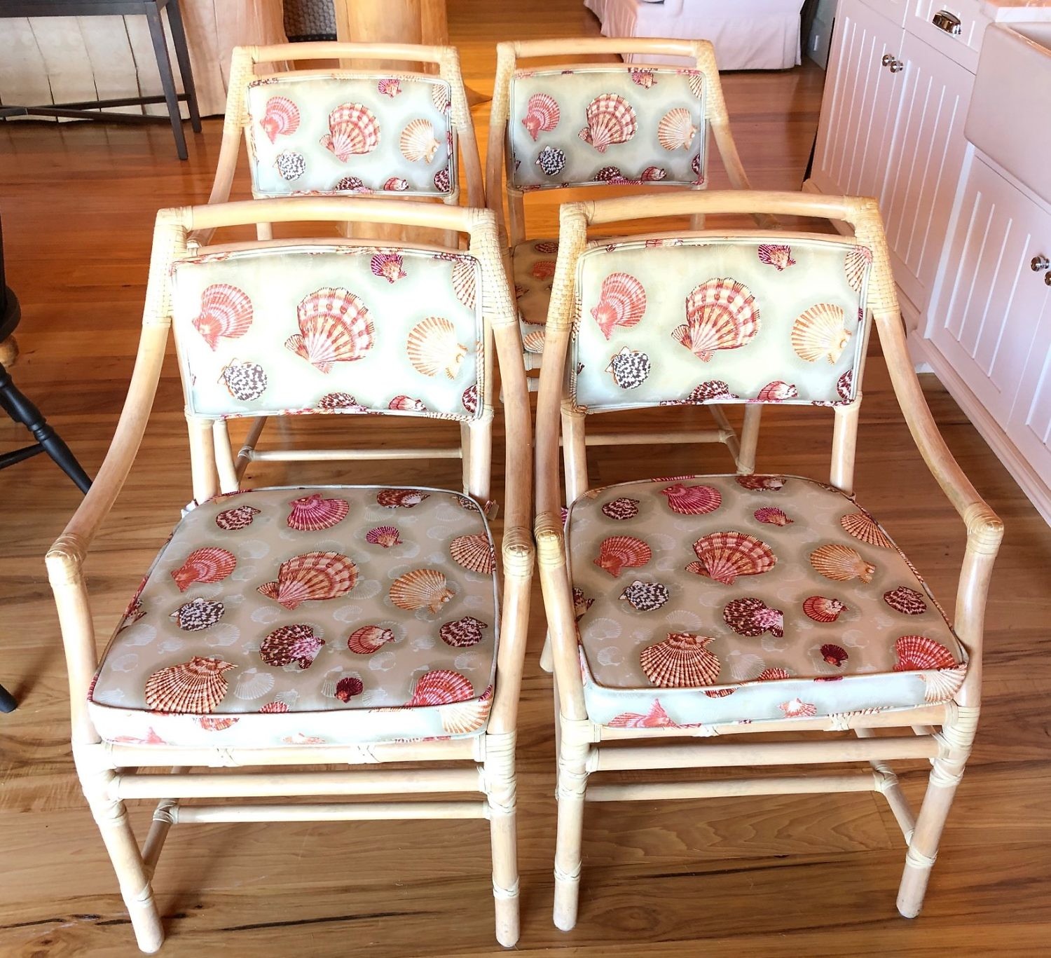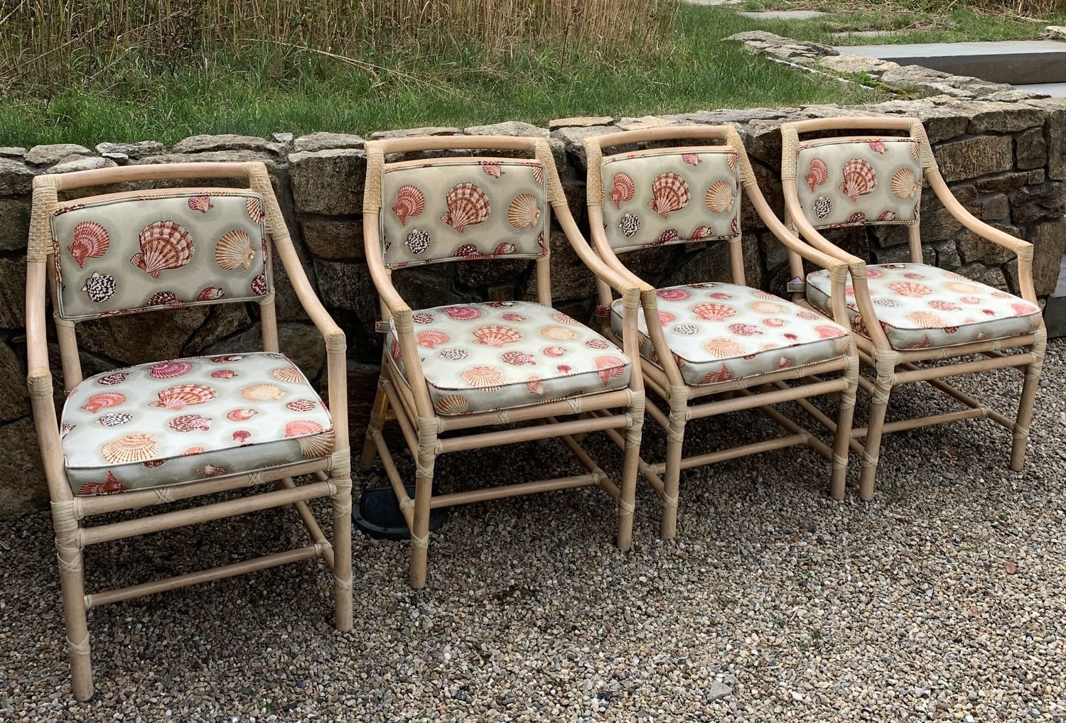 Four Seashell Upholstered Rattan Armchairs Consign Now DeptFurniture/Decorative ArtsSizeHeight 33 ¼ in. Width 20 ½ in. Seat Depth 19 in. Four Rattan Armchairs, 20th Century, with seashell upholstered backs and cushions Height 33 ¼ in. Width 20 ½ in. Seat Depth 19 in. Provenance: Estate of Jennie K. Scaife, Shawkemo Hills, Nantucket Please note that this auction has ended. Click here for an overview of this auction.