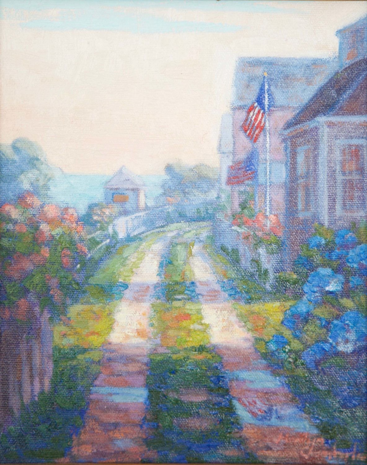 Marilyn Chamberlain Oil on Canvas “Sconset Flags“, signed lower right Marilyn Chamberlain, in molded gilt frame.