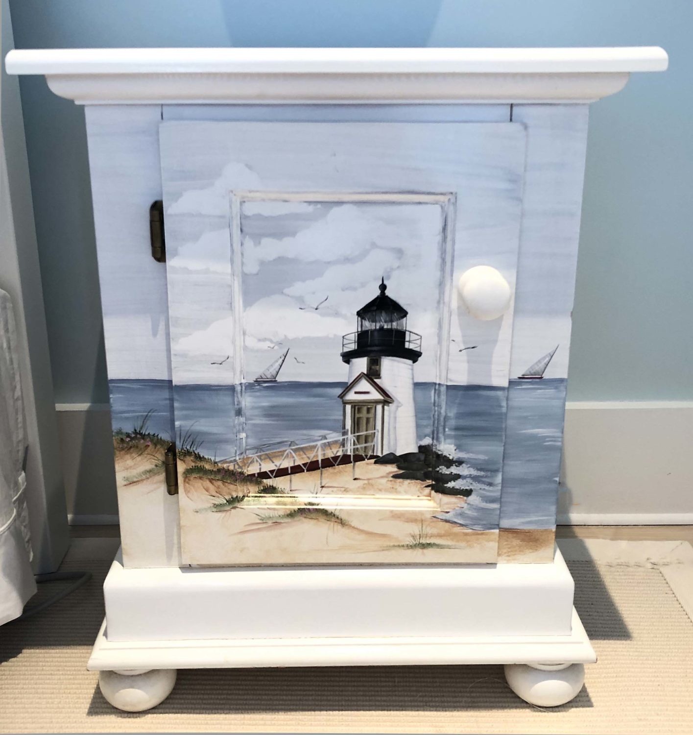 Pair of Lighthouse and Sailboat Decorated End-Table Cupboards, Consign Now DeptFurniture/Decorative ArtsSizeHeight 27 in. Width 22 in. Depth 16 in. Pair of Lighthouse and Sailboat Decorated End-Table Cupboards, with single door on turned bun feet Height 27 in. Width 22 in. Depth 16 in. Provenance: Estate of Jennie K. Scaife, Shawkemo Hills, Nantucket Please note that this auction has ended. Click here for an overview of this auction.