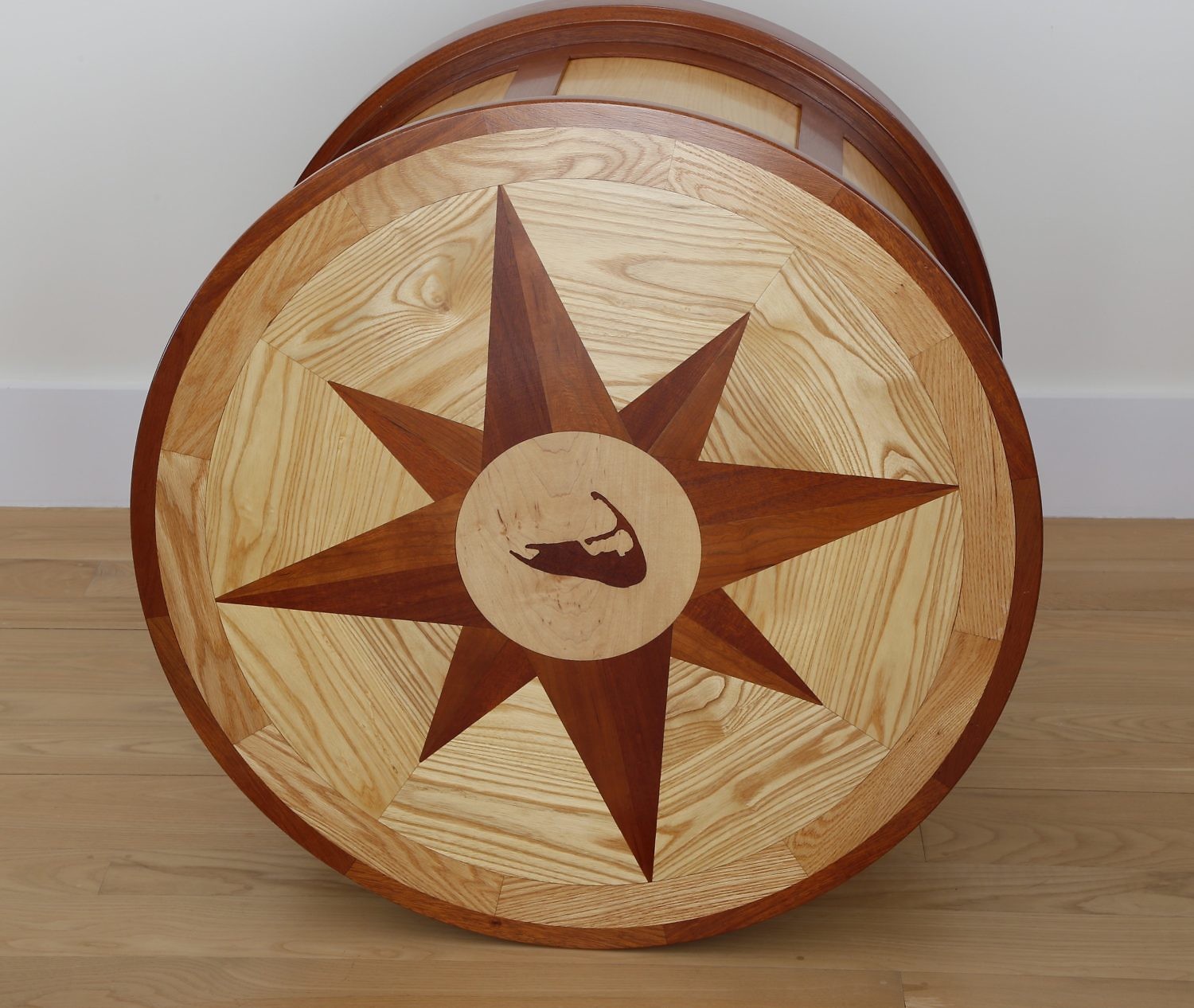 Peter Culbertson Custom Built Round Drum Shaped Nantucket Island Table, inlaid with star and Nantucket Island, crafted from tiger maple, mahogany and oak, signed upon the interior “Built by Peter M. Culbertson, 2004, Nantucket, Mass., finished by Daniel Keating”