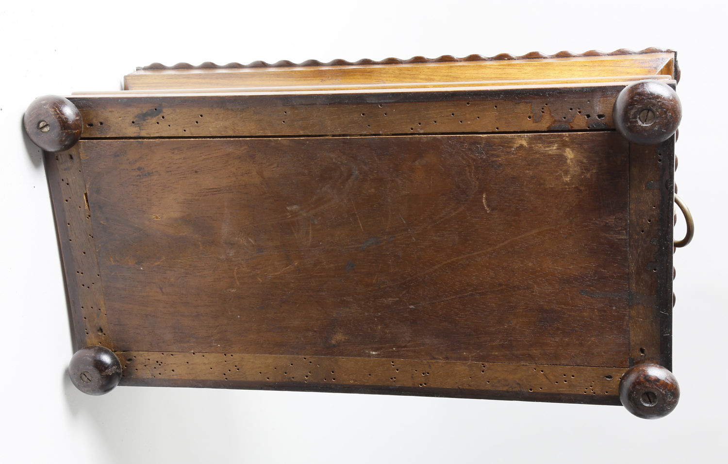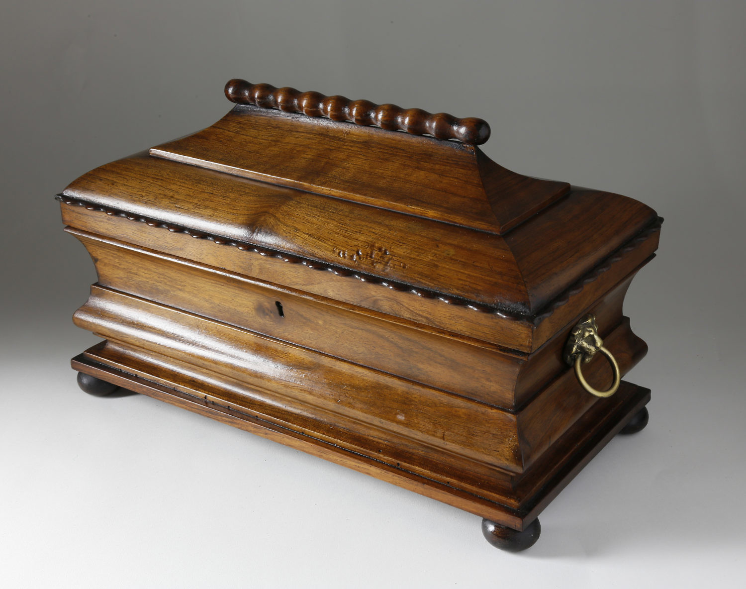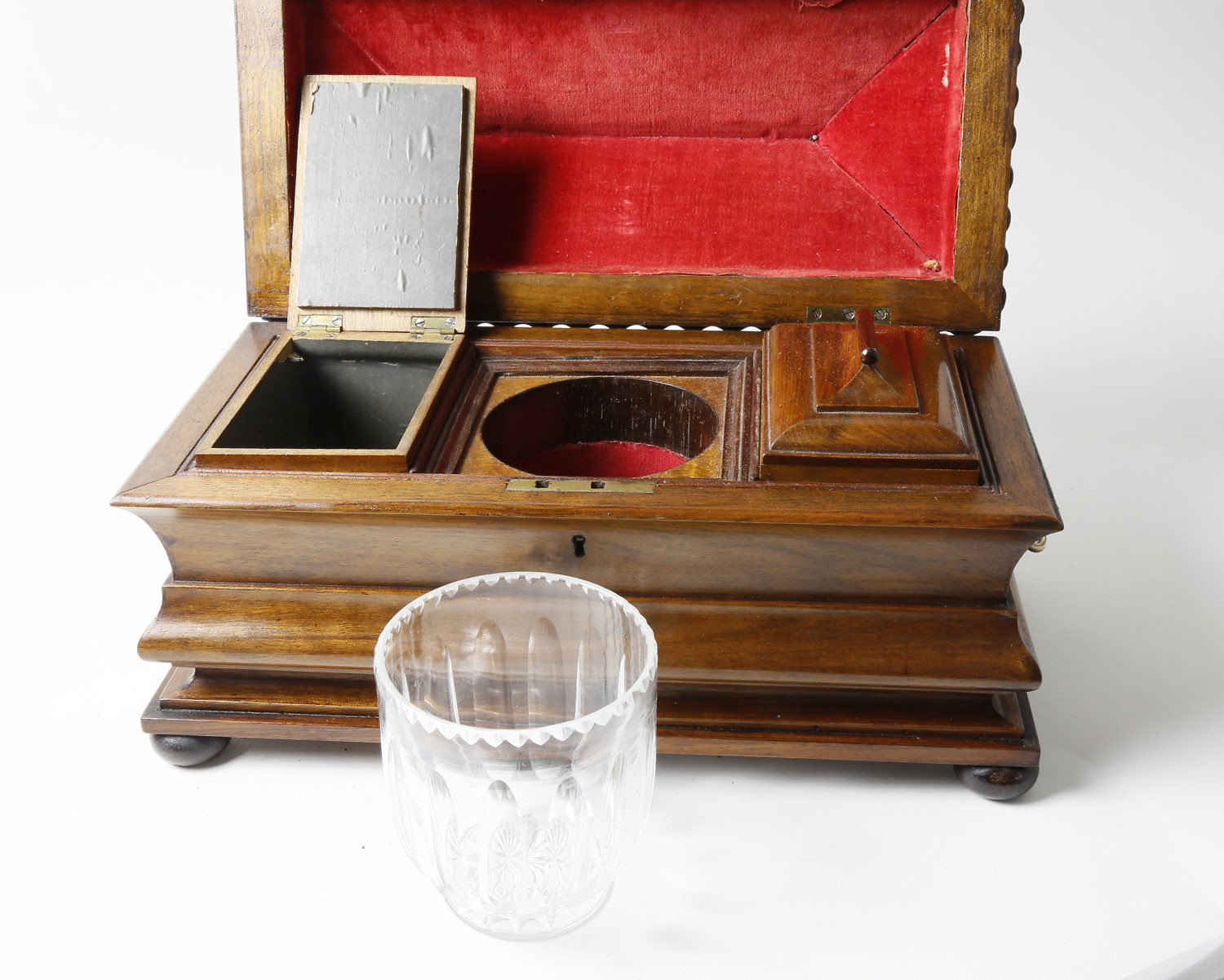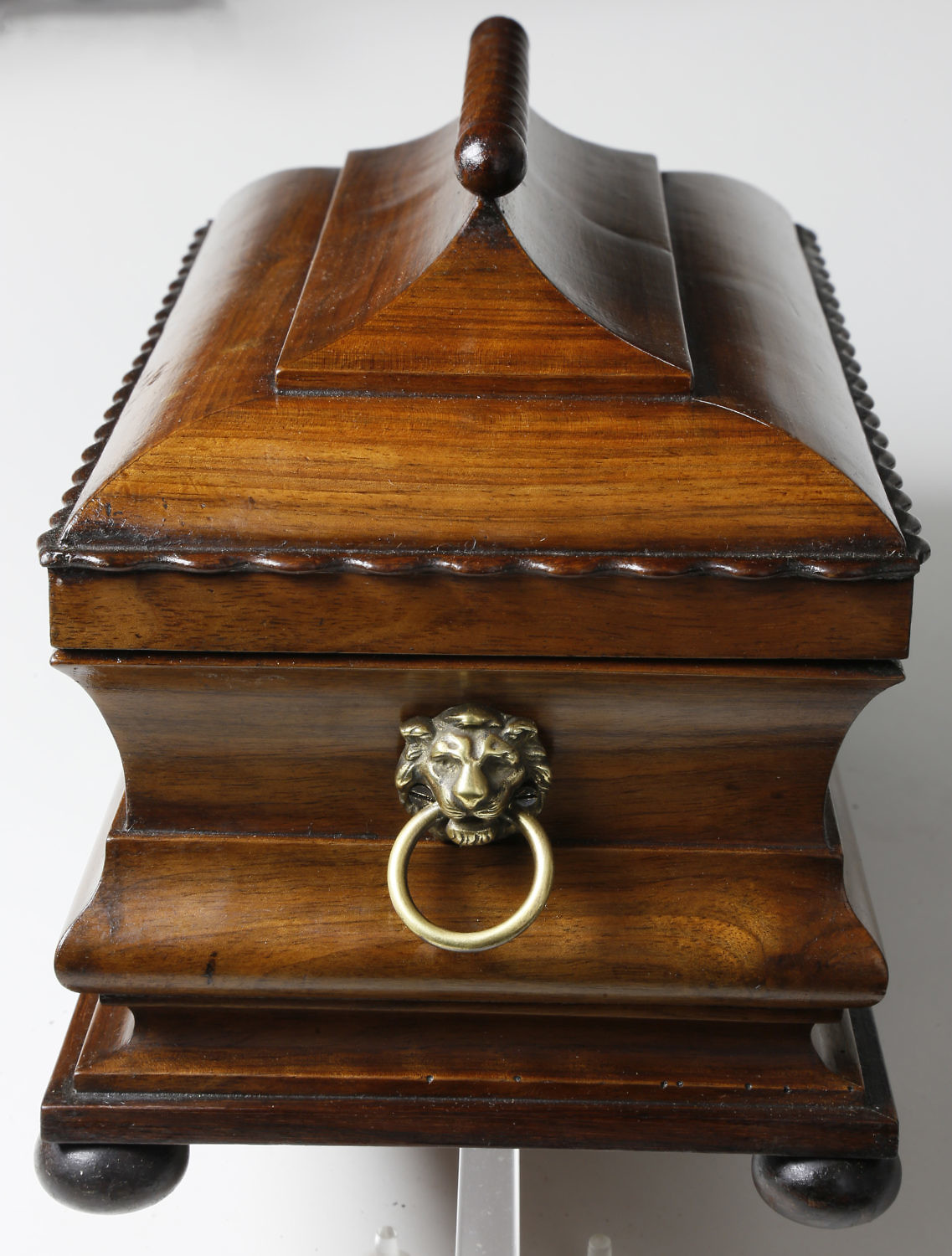Walnut Molded Tea Caddy, circa 1840, paneled hinged cover with applied scalloped edge and beaded ridge, on a conforming molded box on round feet and applied brass lion’s head with ring handles. The interior with two hinged covers mimicking the box design, flanking a crystal mixing bowl.