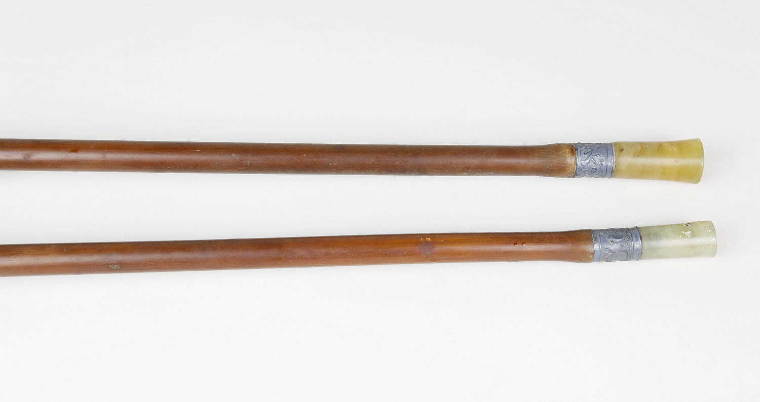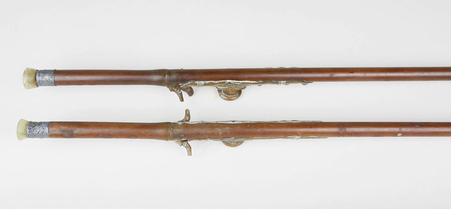 Two Antique Chinese Opium Pipes, 19th Century Consign Now DeptAsian Arts/China Trade, Decorative ArtsSizeLengths 22 ¼ in. and 21 ½ in. Two Antique Chinese Opium Pipes, 19th Century, with bamboo shafts and hardstone mixed metal and precious stone mountings, brass figural Buddha and incised character decorated tampers. Lengths 22 ¼ in. and 21 ½ in. Please note that this auction has ended. Click here for an overview of this auction.
