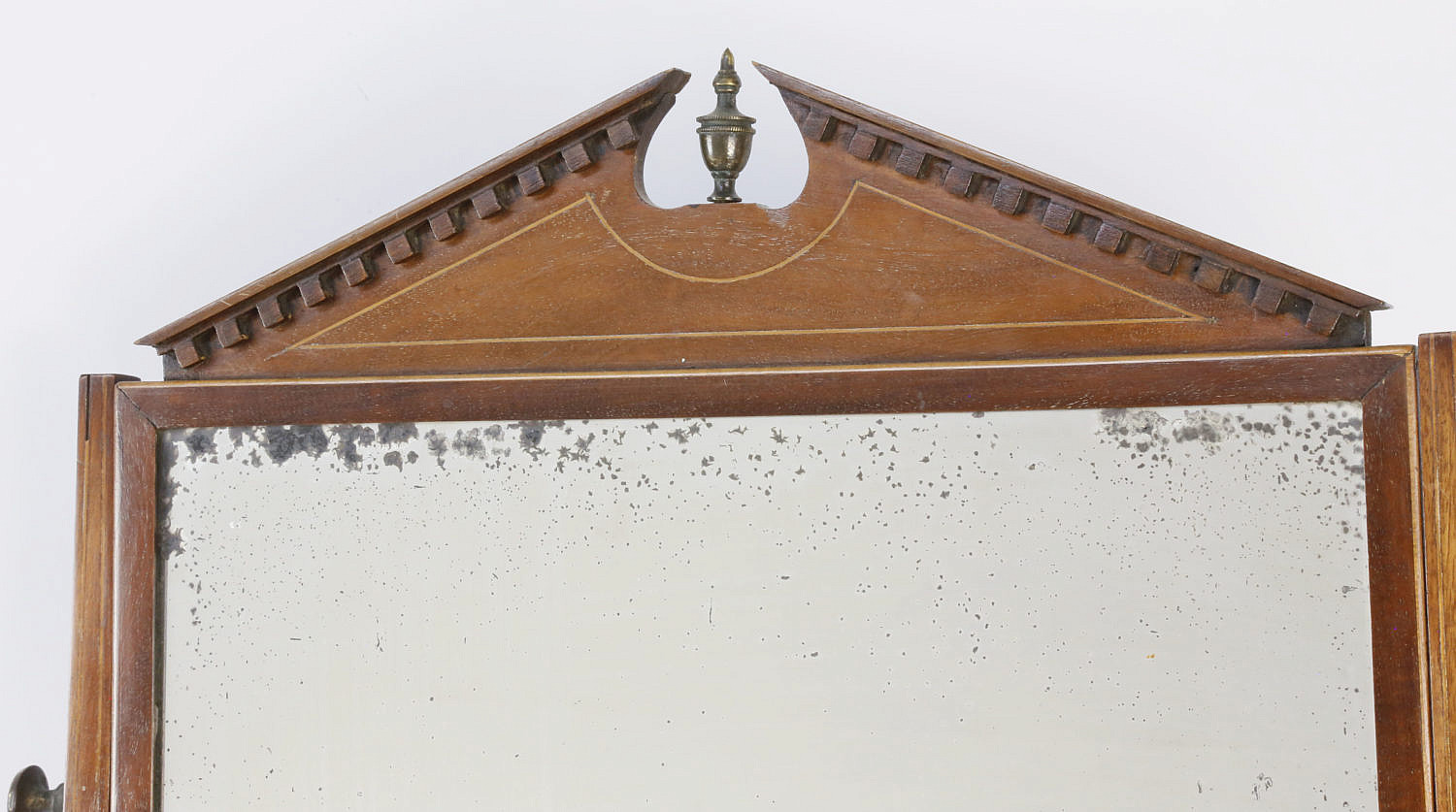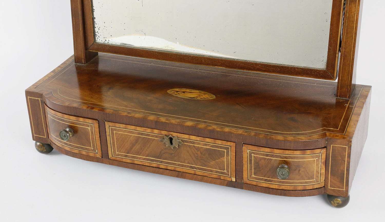 Georgian Inlaid Mahogany Dressing Mirror, early 19th Century Consign Now DeptDecorative Arts, FurnitureSizeHeight 28 in. Width 20.5 in. Depth 9 in. Georgian Inlaid Mahogany Dressing Mirror, early 19th Century, with peak pediment and brass finial, cross banding and line inlaid drawers, shell inlay on top surface, on bun feet Height 28 in. Width 20.5 in. Depth 9 in. Please note that this auction has ended. Click here for an overview of this auction.
