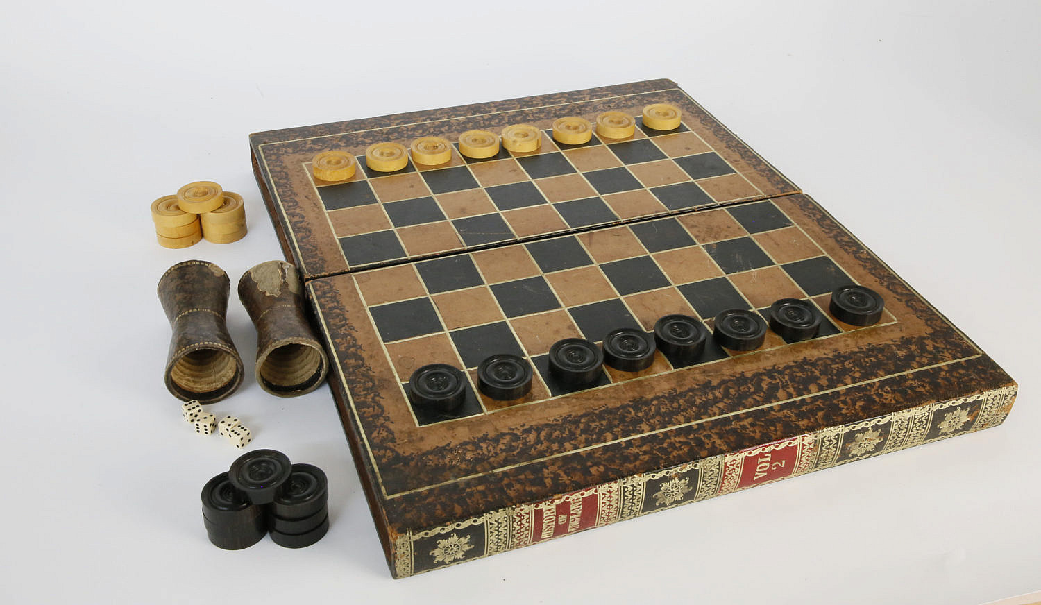 Leather Bound Faux Books Game Box, Checkers and Backgammon Consign Now DeptDecorative ArtsSize14.5 in. x 9 in. x 2.75 in. 18 in. open Leather Bound Faux Books Game Box, Checkers and Backgammon, 19th Century, with carved wood checkers (30 pieces), 4 dice and 2 dice cups 14.5 in. x 9 in. x 2.75 in. 18 in. open Please note that this auction has ended. Click here for an overview of this auction.