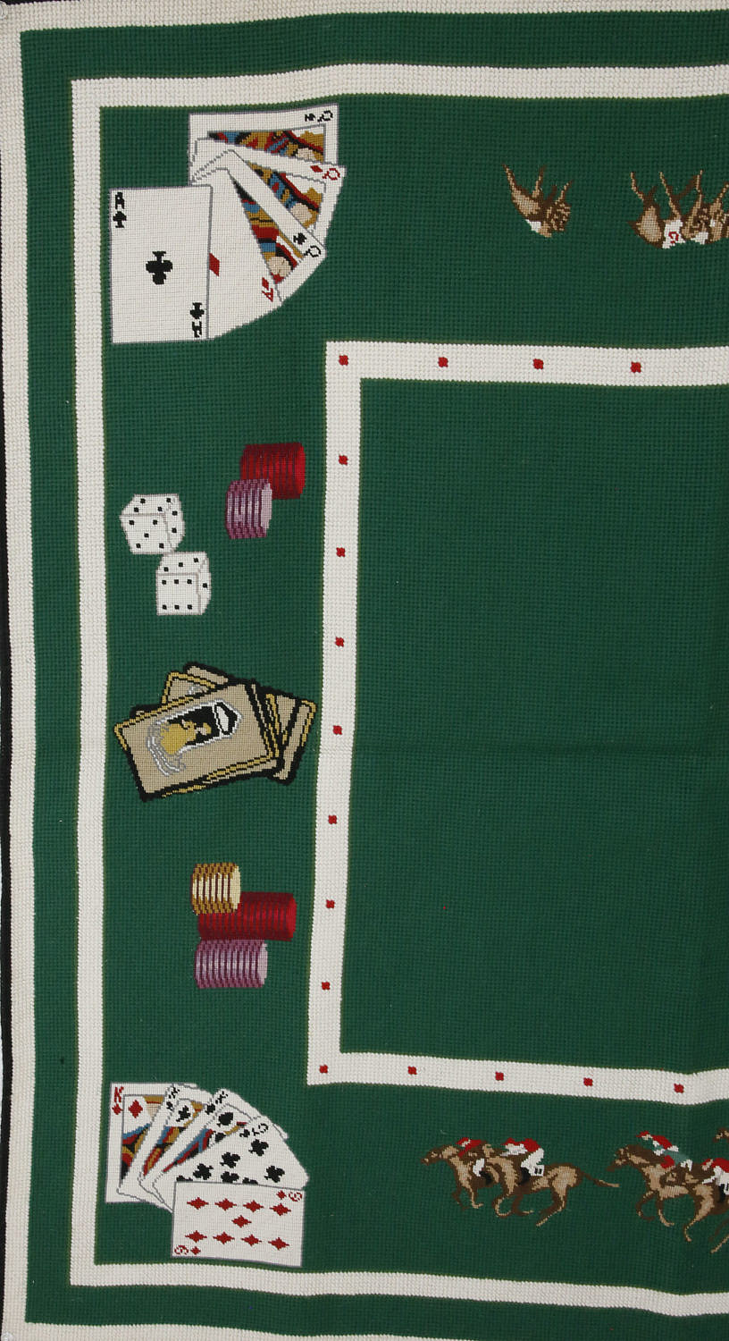 Needlepoint Bridge Table Cover Consign Now DeptDecorative Arts, Furniture/Decorative ArtsSize32.5 in. x 32.5 in. Needlepoint Bridge Table Cover, with fanned cards depicted in each corner and horses with jockeys along the border 32.5 in. x 32.5 in. Please note that this auction has ended. Click here for an overview of this auction.