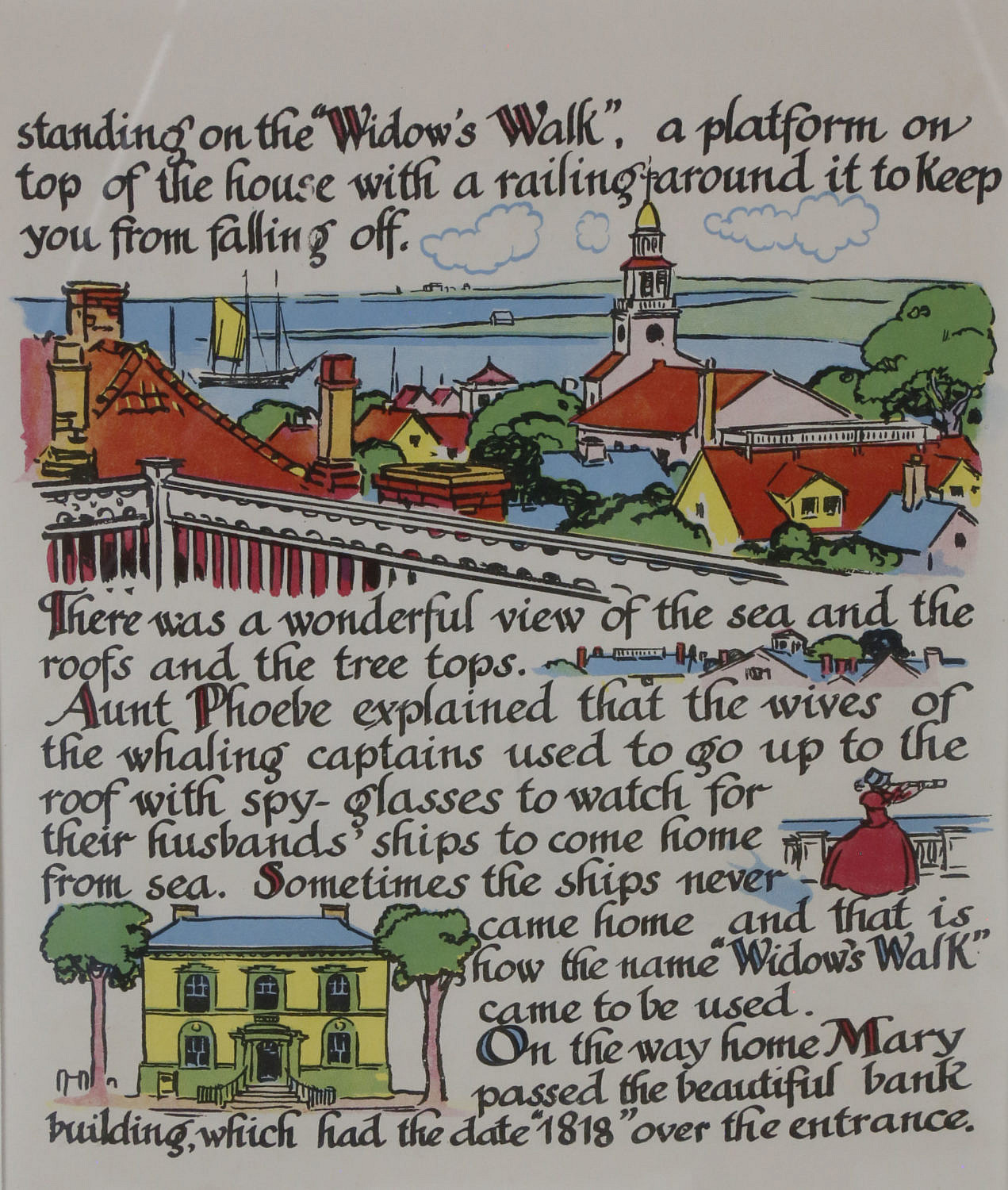 Set of Six Framed Tony Sarg’s “Mary and Freckles in Nantucket” Color Illustrated Book Plates