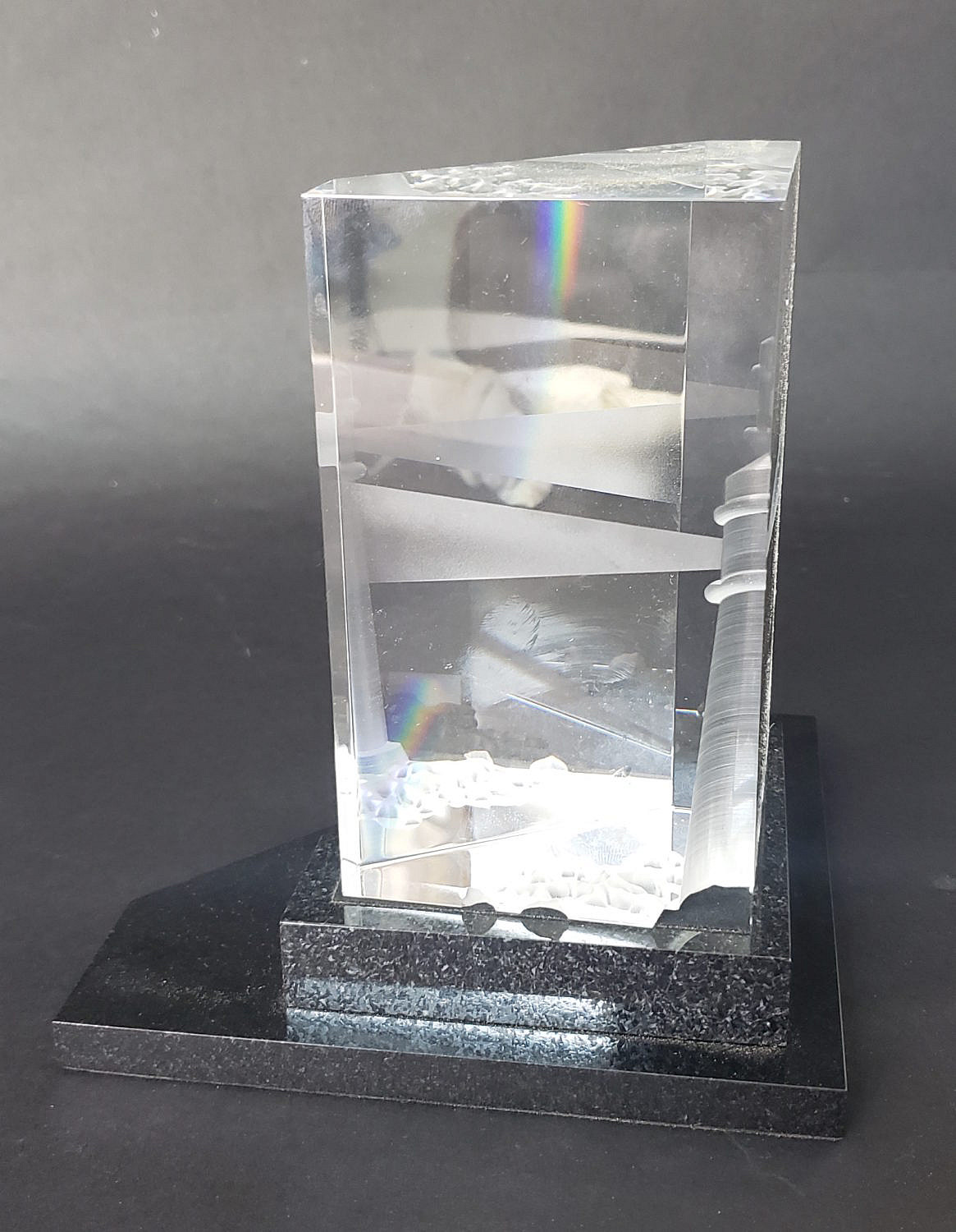 Signed Steuben Clear Crystal, “Beacon of Light”, Lighthouse Sculpture, designed by Eric Hilton, signed upon the base, with marble plinth base, care booklet and felt bag.