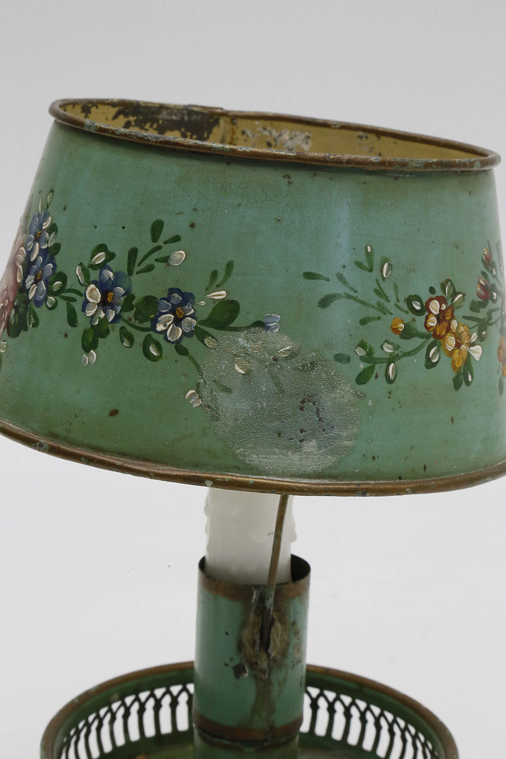 French Tole Candlestick Boudoir Lamp, 19th Century Consign Now DeptDecorative ArtsSizeHeight 9.5 in. Width 6.5 in. French Tole Candlestick Boudoir Lamp, 19th Century, hand painted floral shade, pierced galley drip pan and three gilt paw feet, electrified Height 9.5 in. Width 6.5 in. Please note that this auction has ended. Click here for an overview of this auction.