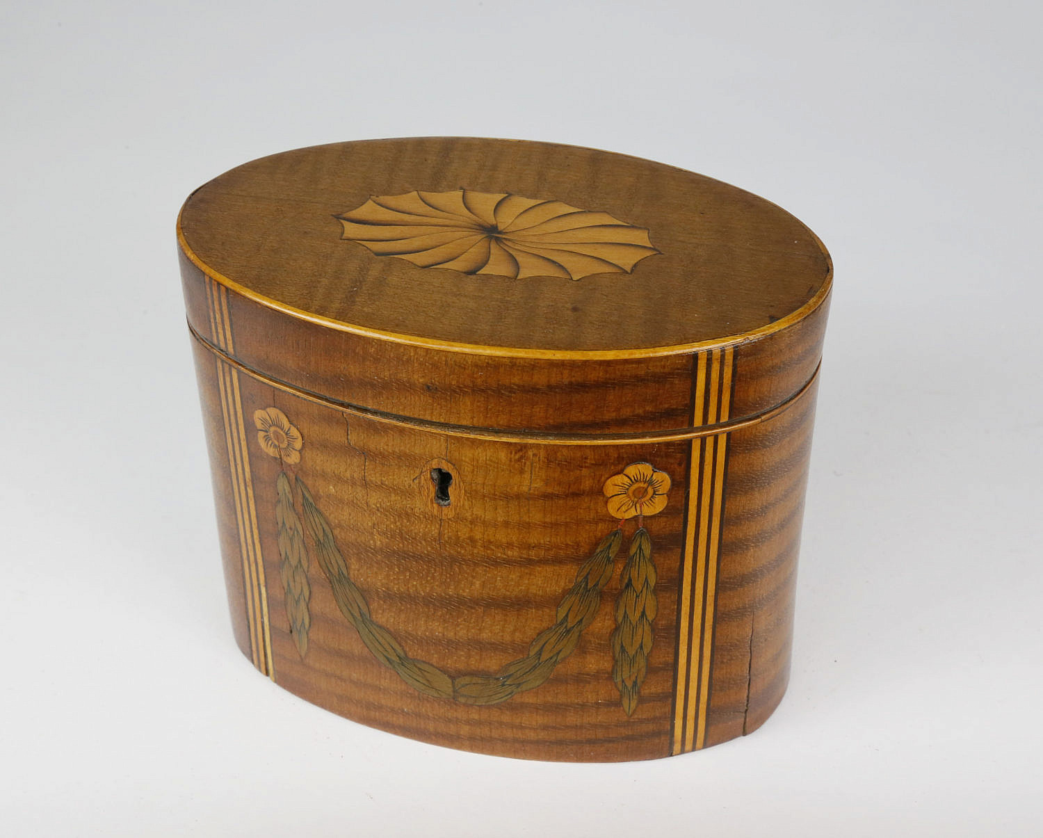 Oval Inlaid Tea Caddy, early 19th Century Consign Now DeptCollections, Decorative ArtsSizeHeight 4.5 in. Width 5.25 in. Depth 3.25 in. Oval Inlaid Tea Caddy, early 19th Century, figured maple, poplar, and bell-flower swag and oval fan inlays Height 4.5 in. Width 5.25 in. Depth 3.25 in. Please note that this auction has ended. Click here for an overview of this auction.