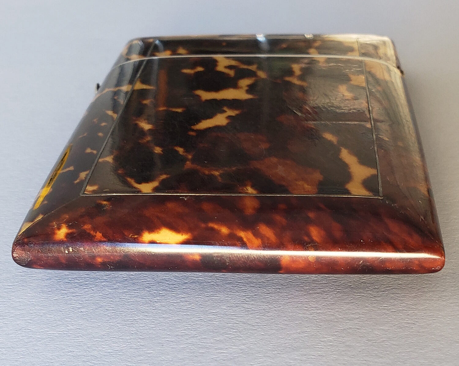 19th Century English Regency Tortoiseshell Card Holder, a hinged top exposing an interior storage compartment, with blank sterling silver name plate and line inlay.
