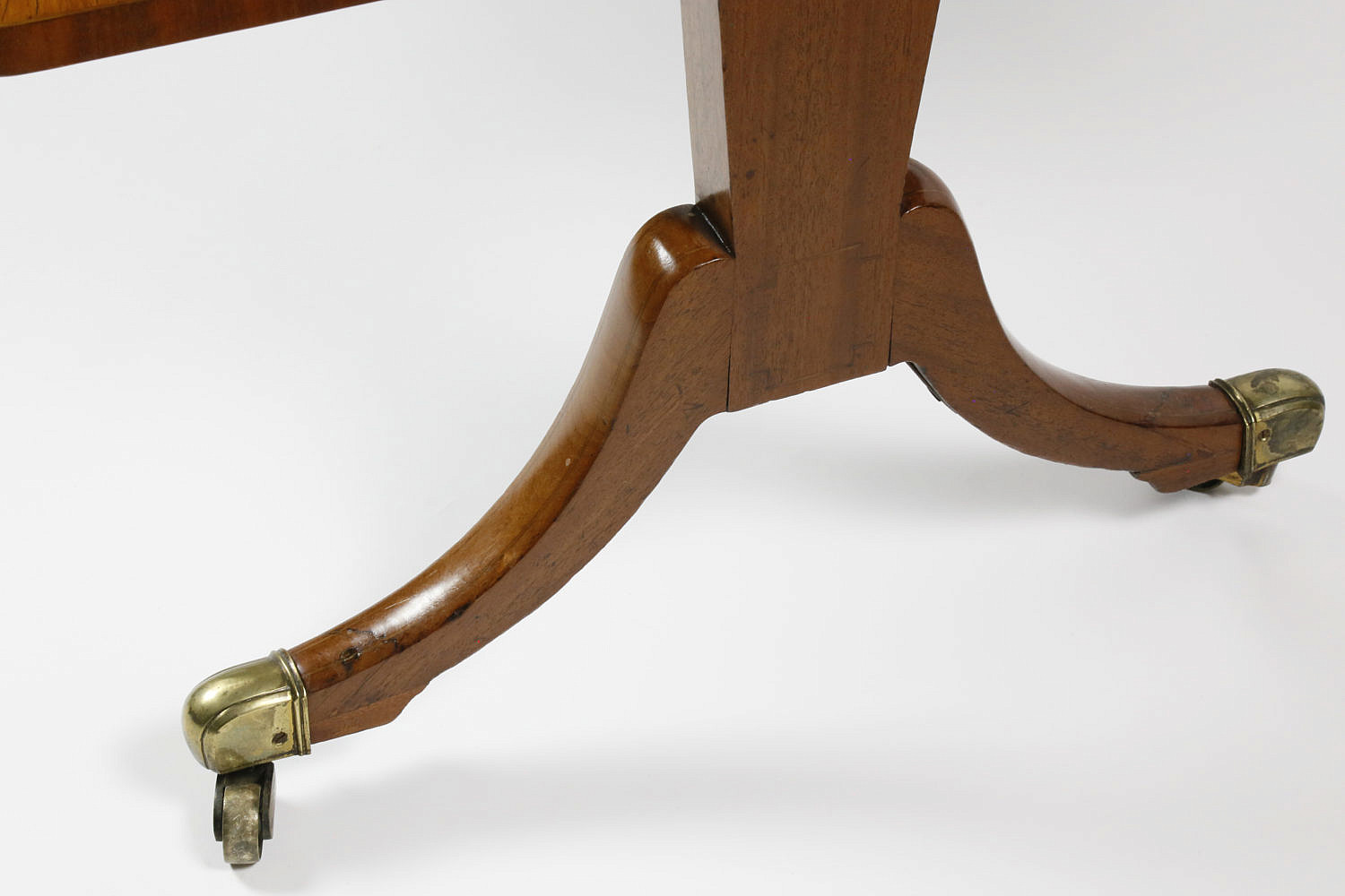 English Regency Mahogany and Satinwood Sofa Table, circa 1820, oblong top cross banded in satinwood with end drop-leaves over two frieze drawers and corresponding “dummy” drawers; raised on tapered end standards with hipped sabre legs in brass shoes on casters.