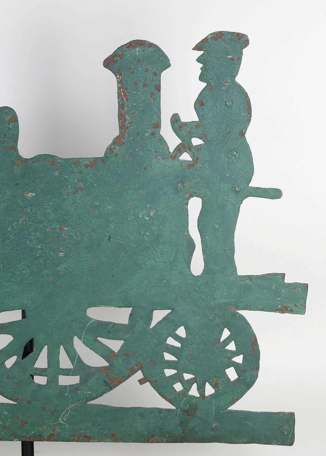 Sheet Iron Steam Train Weathervane, 19th Century Consign Now DeptAmericana and Folk Arts, Collections, Decorative ArtsSizeHeight 21 in. Width 24 in. Sheet Iron Steam Train Weathervane, 19th Century, green painted surface with riveted iron strap reinforcement, on a contemporary iron stand. Height 21 in. Width 24 in. Please note that this auction has ended. Click here for an overview of this auction.