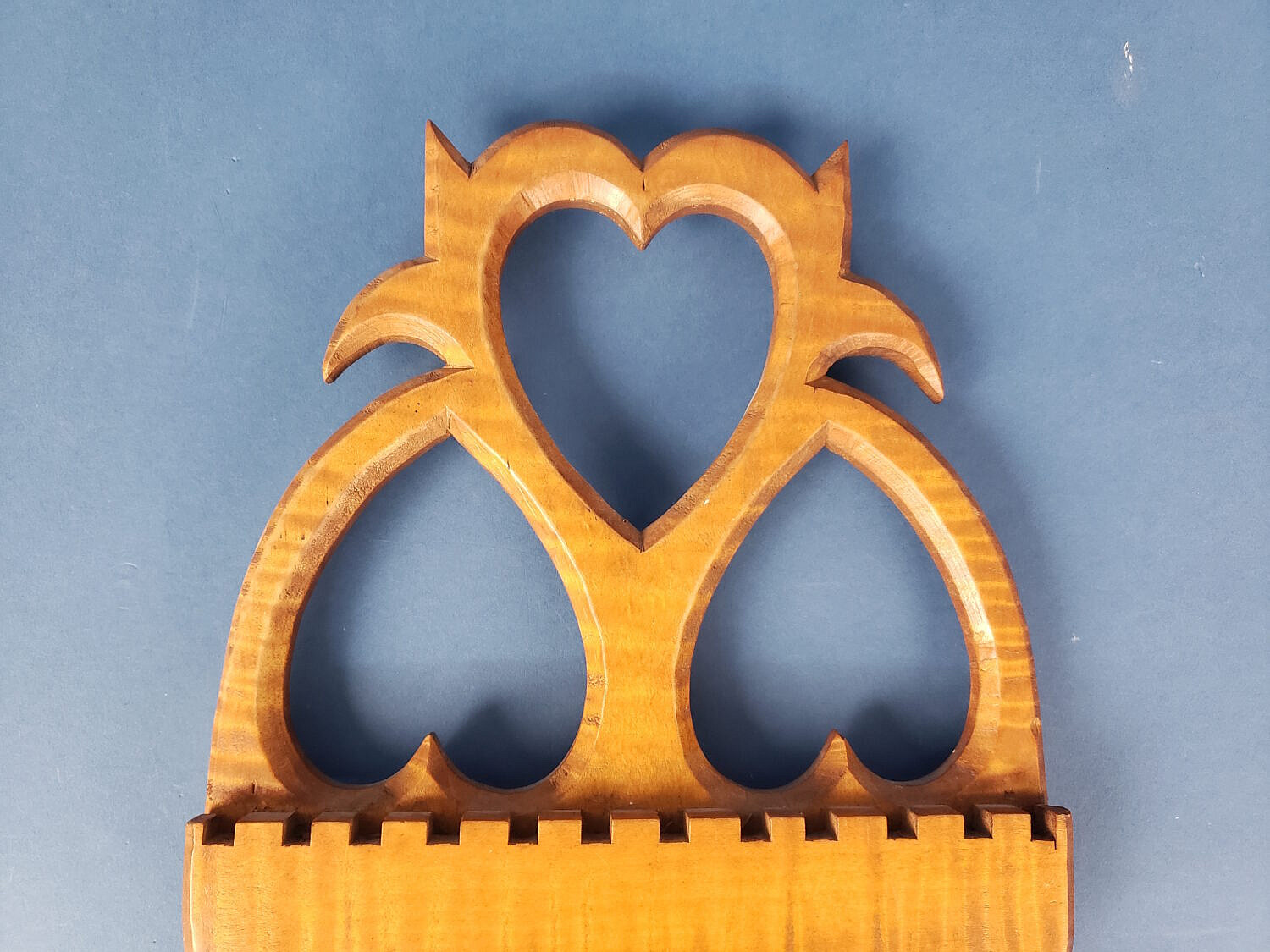Vintage Eldred Wheeler Tiger Maple Mirror, with heart shaped cutouts and dentil molding and makers label on reverse.