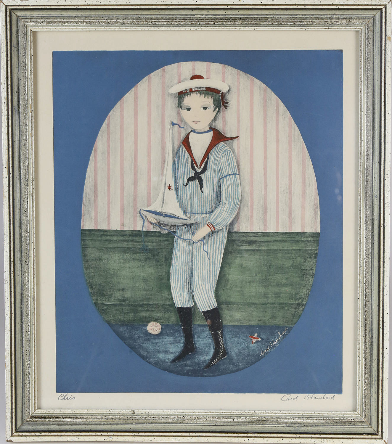 Carol Blanchard Pencil Signed Print of a Young Sailor Boy, “Chris” Consign Now DeptDecorative Arts, Fine ArtsSize12 in. x 10 in. Overall 15 in. x 13 in. Carol Blanchard Pencil Signed Print of a Young Sailor Boy, “Chris”, signed lower left, matted and framed 12 in. x 10 in. Overall 15 in. x 13 in. Please note that this auction has ended. Click here for an overview of this auction.
