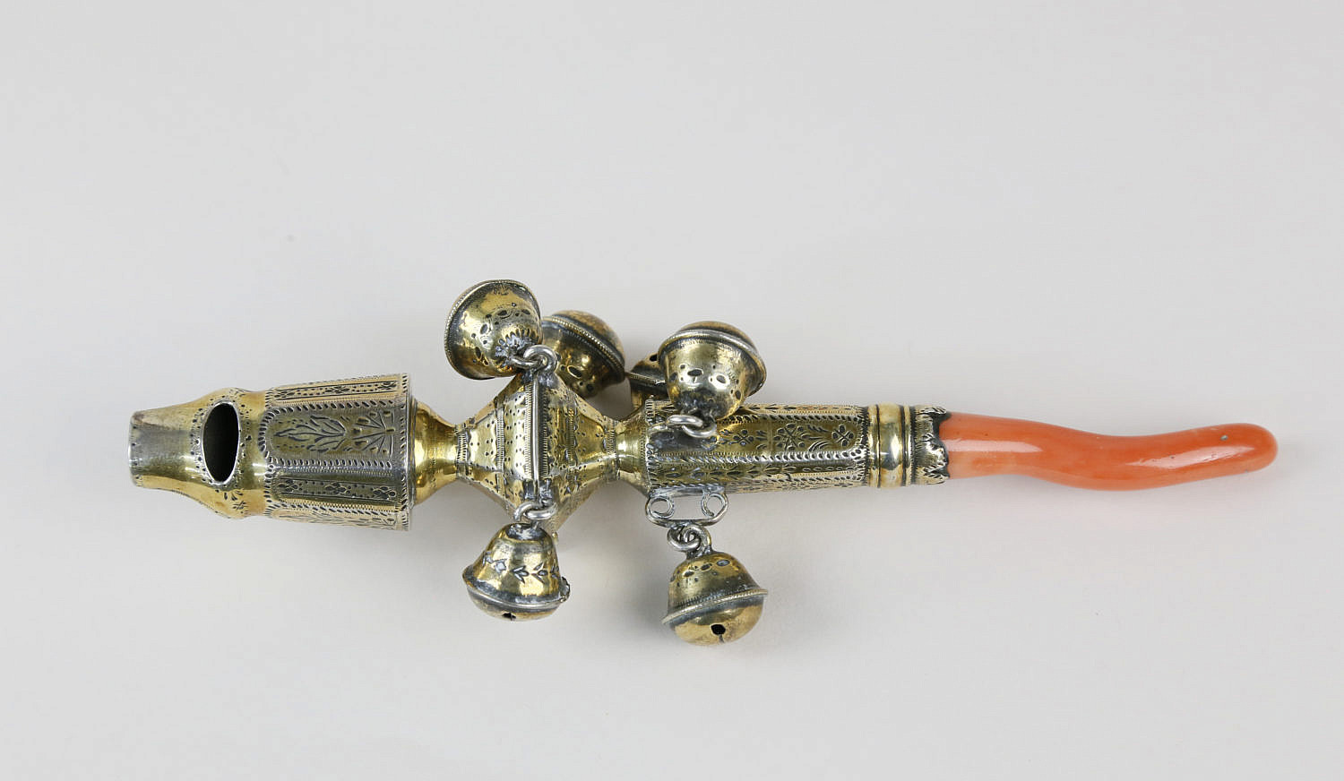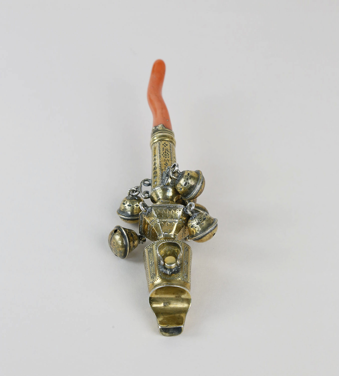 English Silver-Gilt and Coral Baby Rattle, late 18th century, indistinct maker’s mark WT, possibly William Turton, of squared baluster form, attached with two rows of four bells (two detached), terminating in a whistle and coral teether, bright cut engraved with stylized foliate motifs with ring attachment