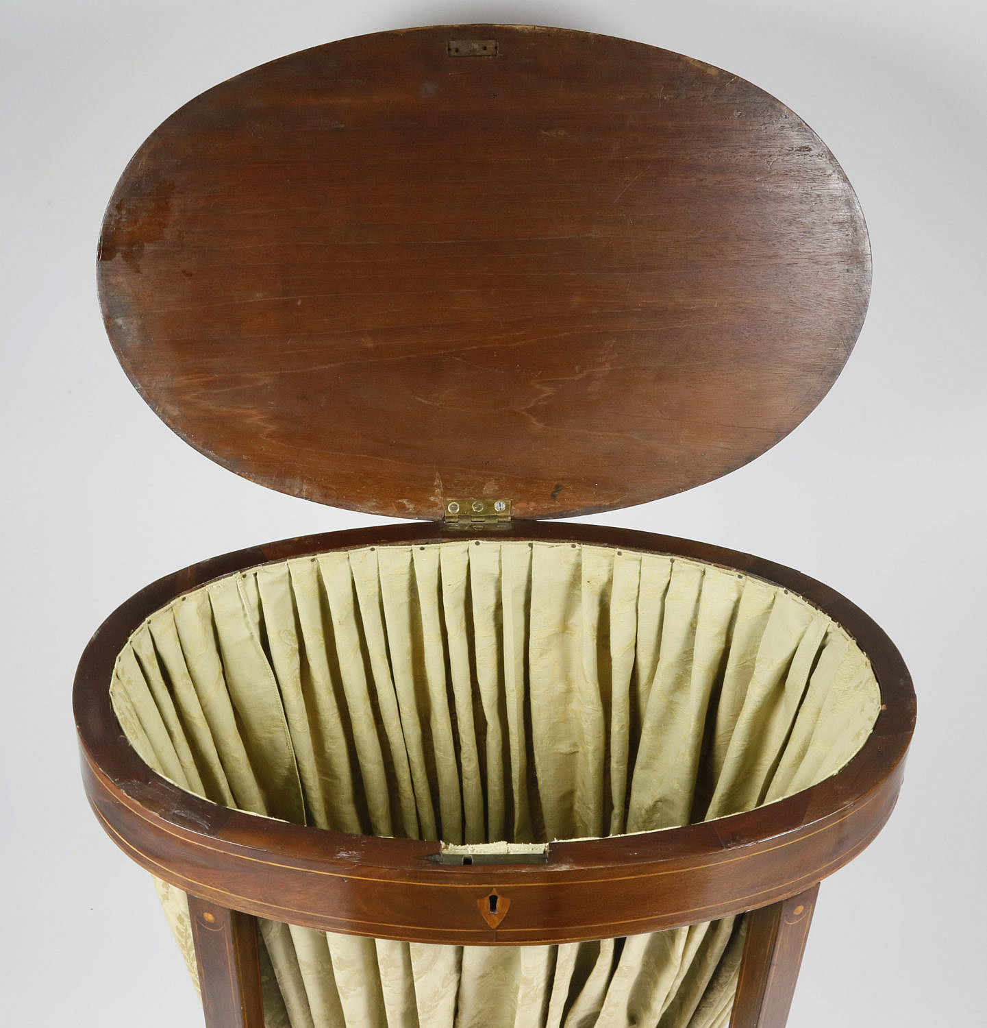 George III Inlaid Mahogany Oval Sewing Table, circa 1800, the hinged top surfaced with applied ink and watercolor on paper decoration depicting a mural, idyll with shepherdess within concentric borders of flowering vinery and opens to provide access to pendent work-bag on square tapered legs joined by delicately turned x-stretcher