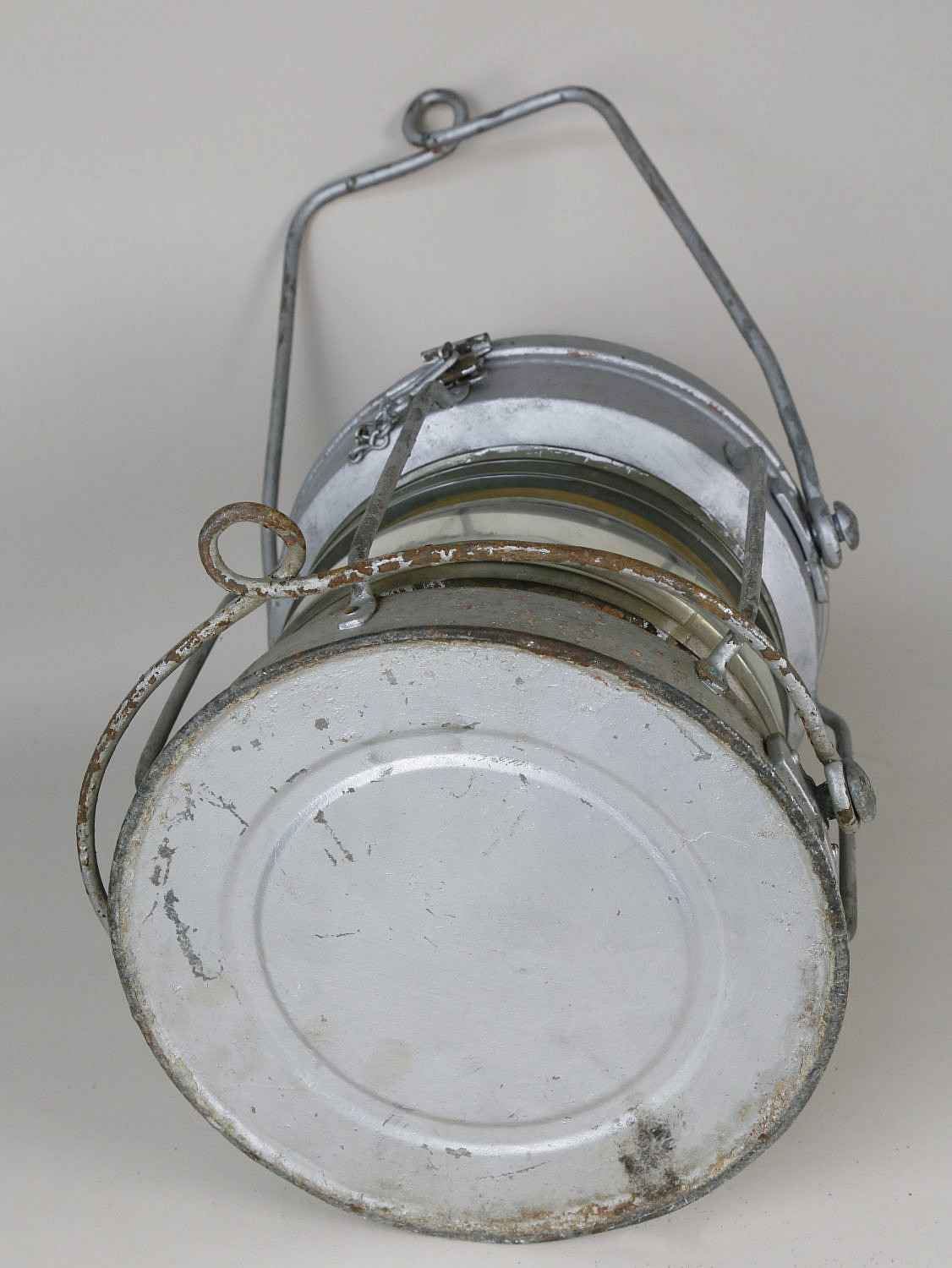 Glasgow, Scotland Masthead Lantern Light, silver paint over galvanized steel, clear glass lens, with attached Glasgow, Scotland manufacturer’s tag.