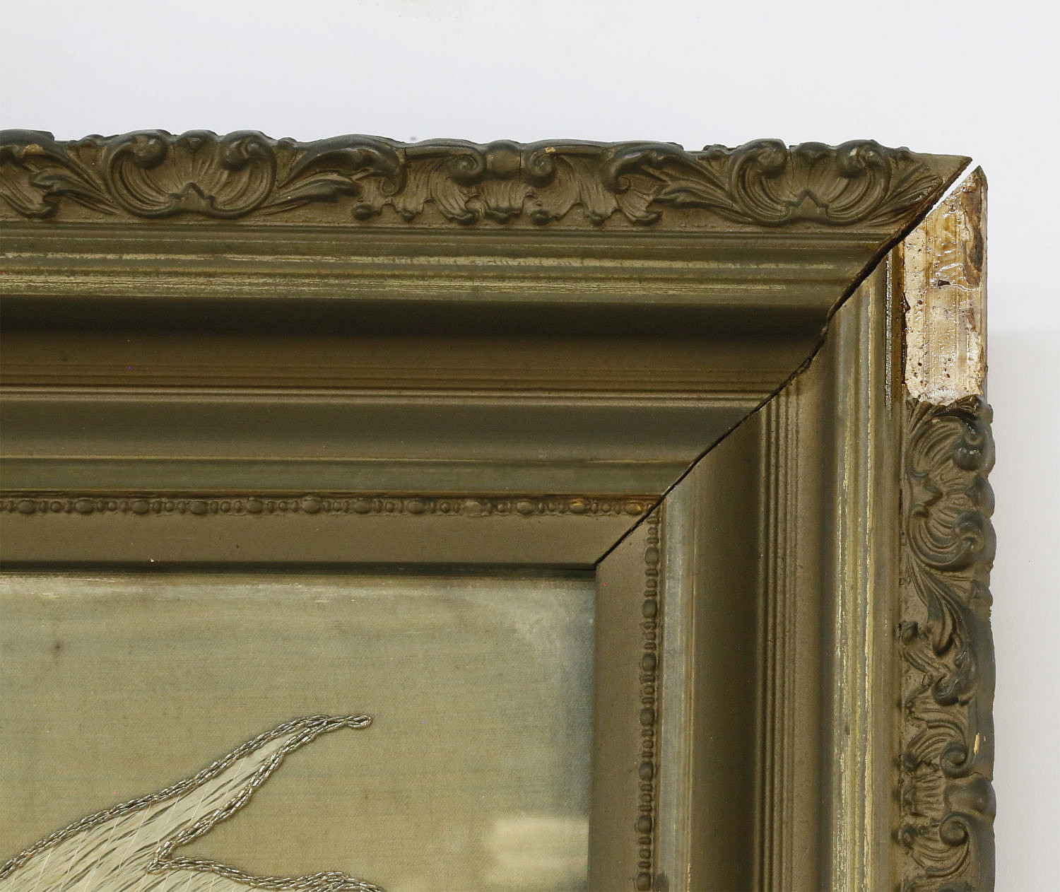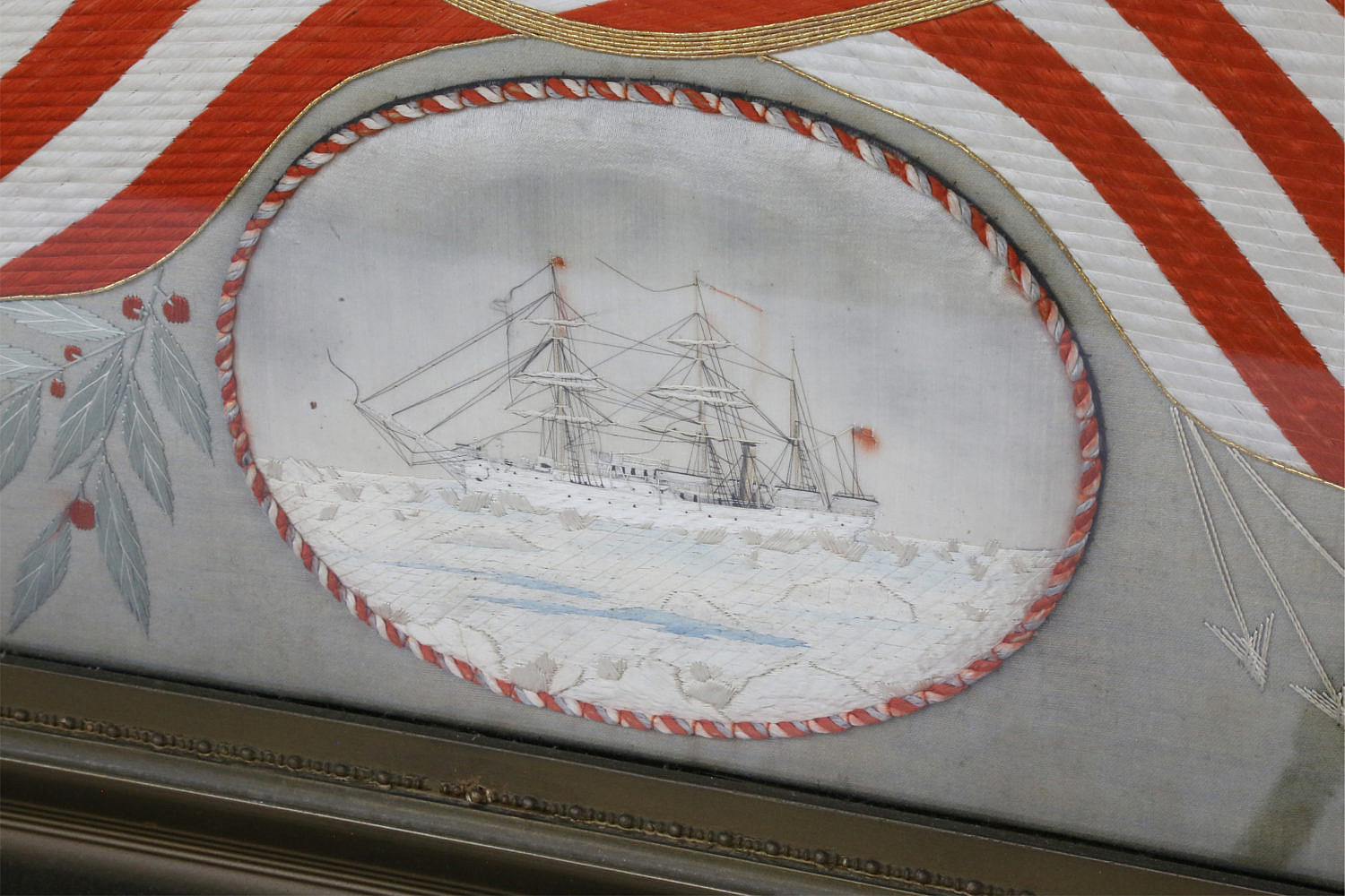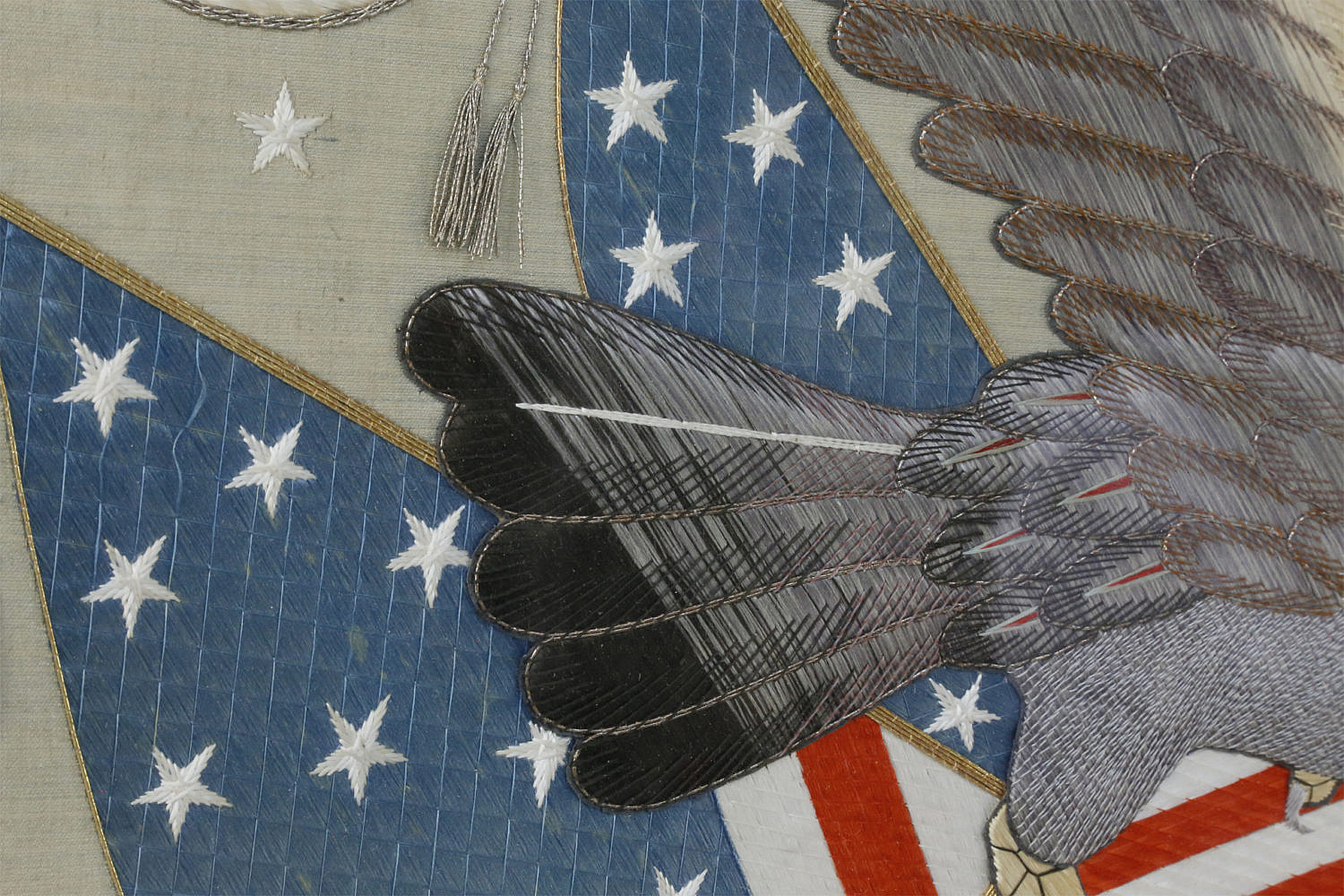 Large Chinese Silk and Metal Wrapped Thread Embroidery, 1st quarter of the 20th Century, depicting a portrait of a flying eagle with Federal shield, 3 flags, 13 stars and banner, all above a finely engraved cartouche of a 3-mast ship. In original molded gesso frame.