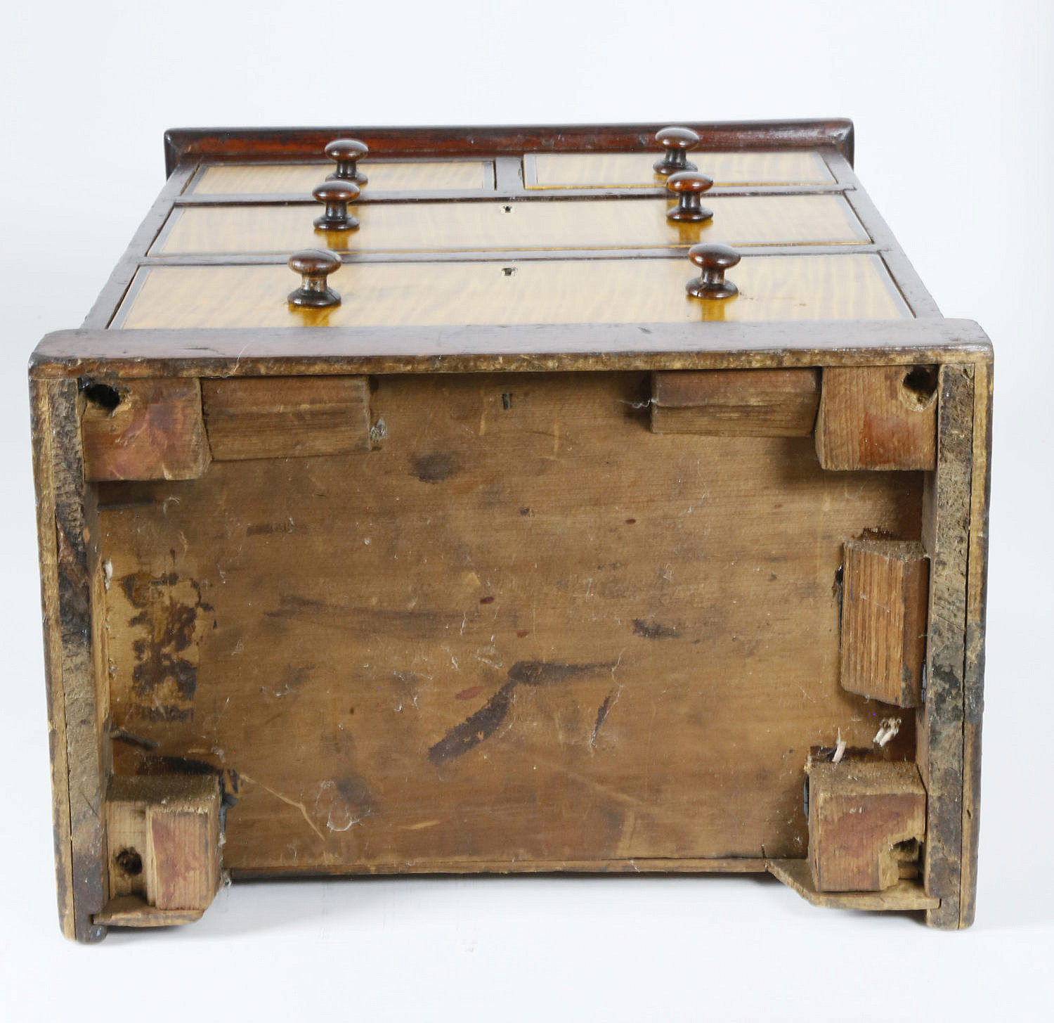 Miniature Mahogany and Tiger Maple Chest of Four Drawers, circa 1830 Consign Now DeptCollections, Furniture, Furniture/Decorative ArtsSizeHeight 4 in. Width 13 in. Depth 9 in. Miniature Mahogany and Tiger Maple Chest of Four Drawers, circa 1830, configured two over two drawers, wood knob pulls Height 4 in. Width 13 in. Depth 9 in. Please note that this auction has ended. Click here for an overview of this auction.