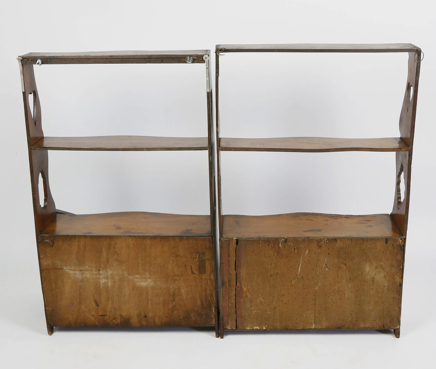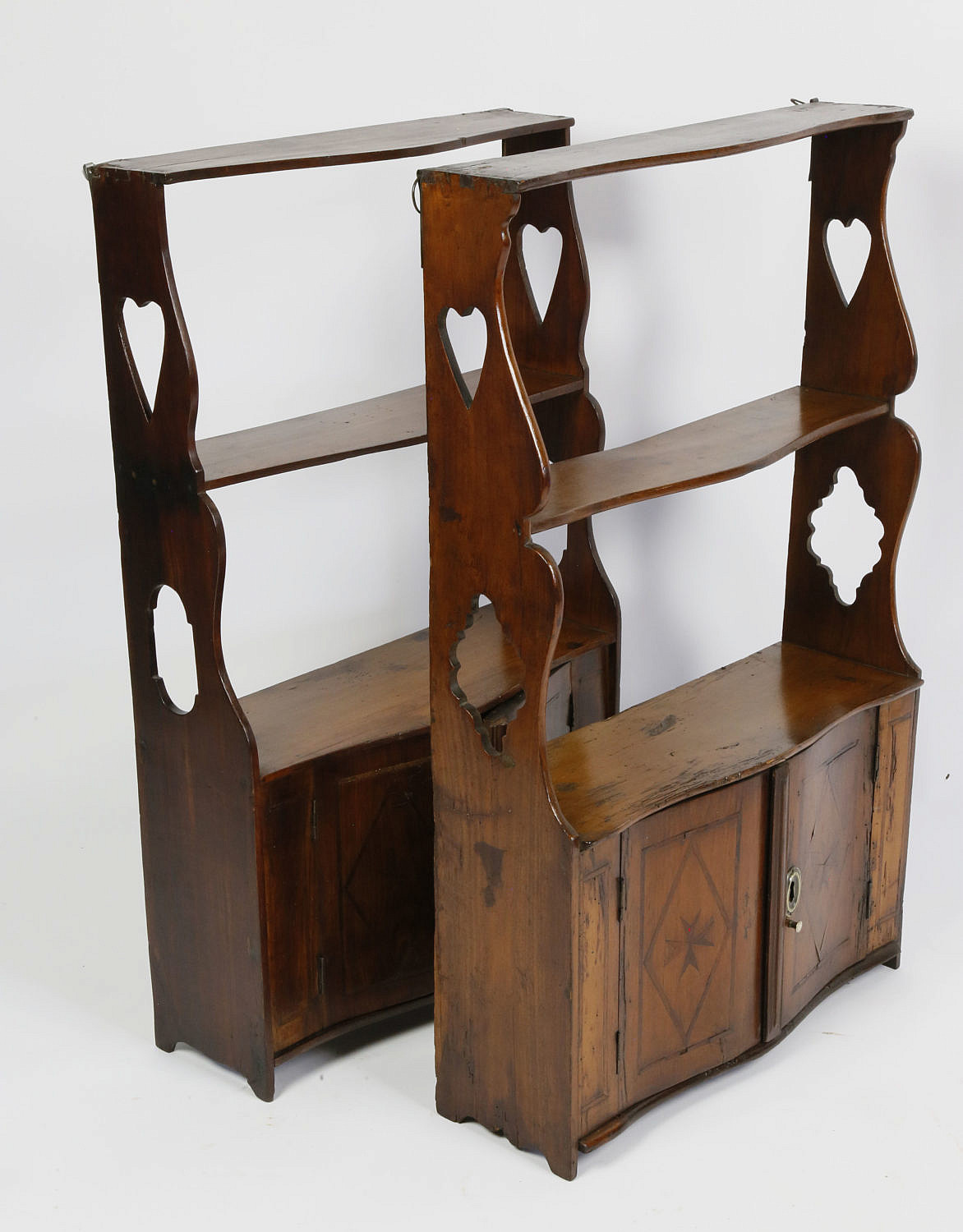 Near Pair of Cherry Hanging Shelves, 19th century Consign Now DeptDecorative Arts, Furniture/Decorative ArtsSizeHeight 29.5 in. Width 18.5 in. Depth 30 in. Near Pair of Cherry Hanging Shelves, 19th century, with fine wood inlays, scribed doors and brass escutcheons Height 29.5 in. Width 18.5 in. Depth 30 in. Please note that this auction has ended. Click here for an overview of this auction.