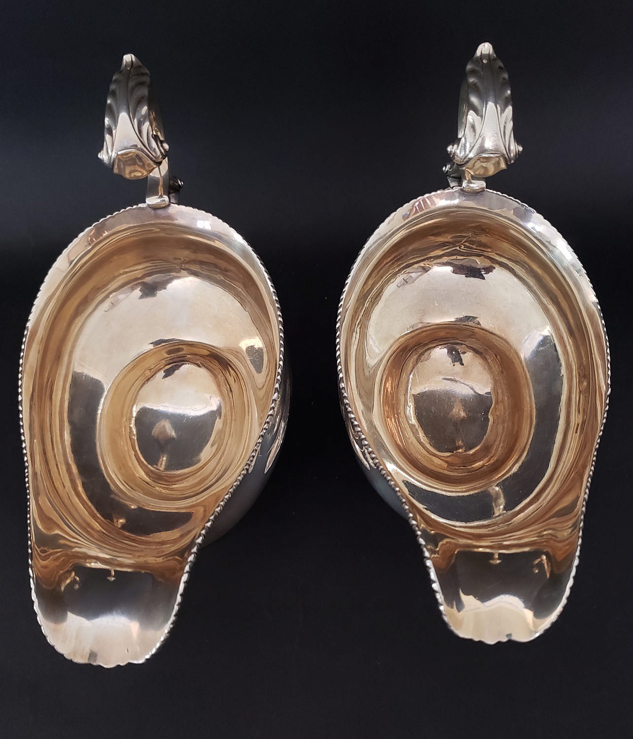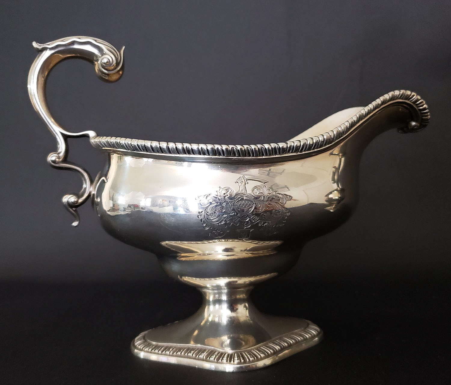 Pair George III Sterling Silver Sauce Boats, London, 1772-1773 Consign Now Dept20th Century Design, Collections, Decorative Arts, SilverSizeHeight 6.5 in. Length 8.25 in. Total Weight 29.2 Troy oz. Pair George III Sterling Silver Sauce Boats, London, 1772-1773, shaped oval with enleafed open scroll handle, pedestal base, gadrooned rim, foot engraved crest, maker’s marks erased/rubbed down. Height 6.5 in. Length 8.25 in. Total Weight 29.2 Troy oz. Please note that this auction has ended. Click here for an overview of this auction.