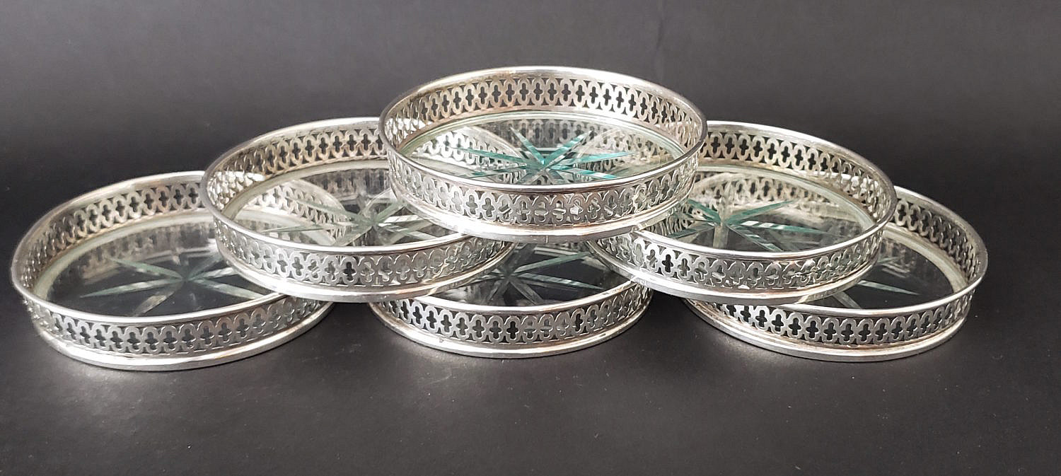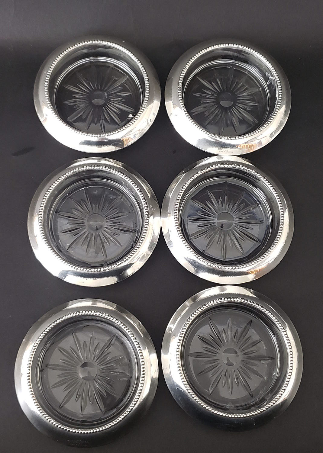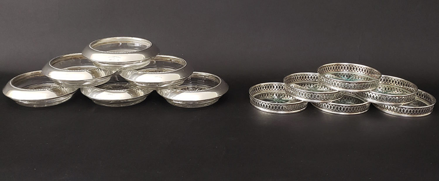 Six Frank M. Whiting & Co. and Six International Sterling Silver Coasters, pierced, stippled and cut crystal construction. The pierced coasters each marked, “International Sterling” and the stippled coasters each marked, “Frank M. Whiting & Co Sterling 04 PAT PENDING”