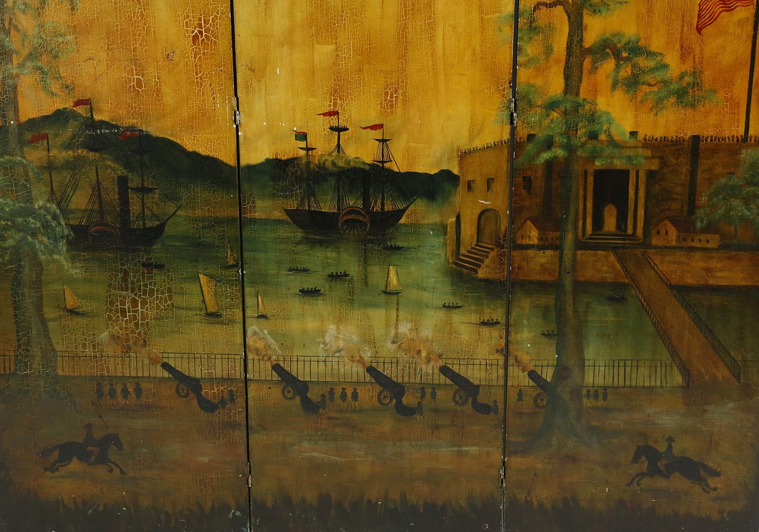 Vintage 1920s Hand Decorated Three Panel Room Divider Consign Now DeptDecorative Arts, Fine ArtsSizeHeight 67.5 in. Width 53.5 in. Vintage 1920s Hand Decorated Three Panel Room Divider, with large hand painted battle scene with ships, cannon, soldiers and large fort flying American flag Height 67.5 in. Width 53.5 in. Please note that this auction has ended. Click here for an overview of this auction.