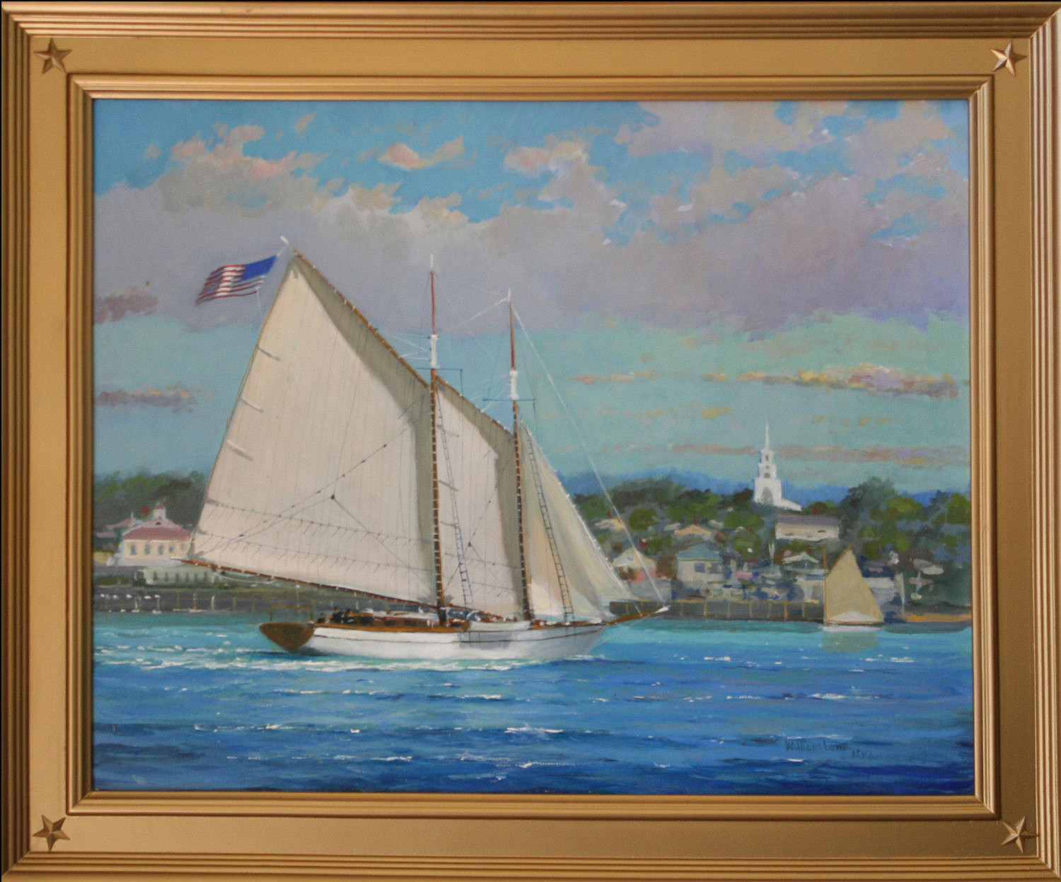 William W. Lowe (American b. 1940) Oil on Canvas “Sailing Past the Nantucket Yacht Club”, depicting sailing in Nantucket Harbor, signed lower right William Lowe, ASMA, in gilt frame embellished with stars
