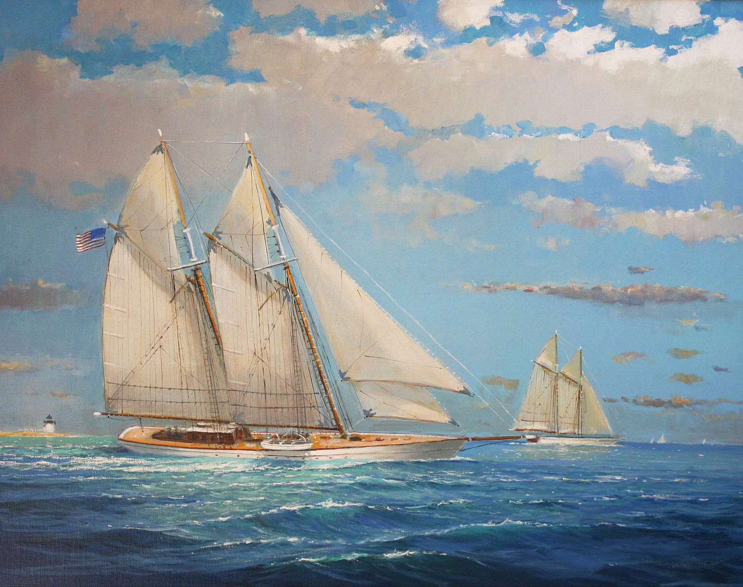 William Lowe (American b. 1940) Oil on Linen “Schooners Exiting Nantucket Harbor”, signed lower right William Lowe, ASMA, in gilt frame
