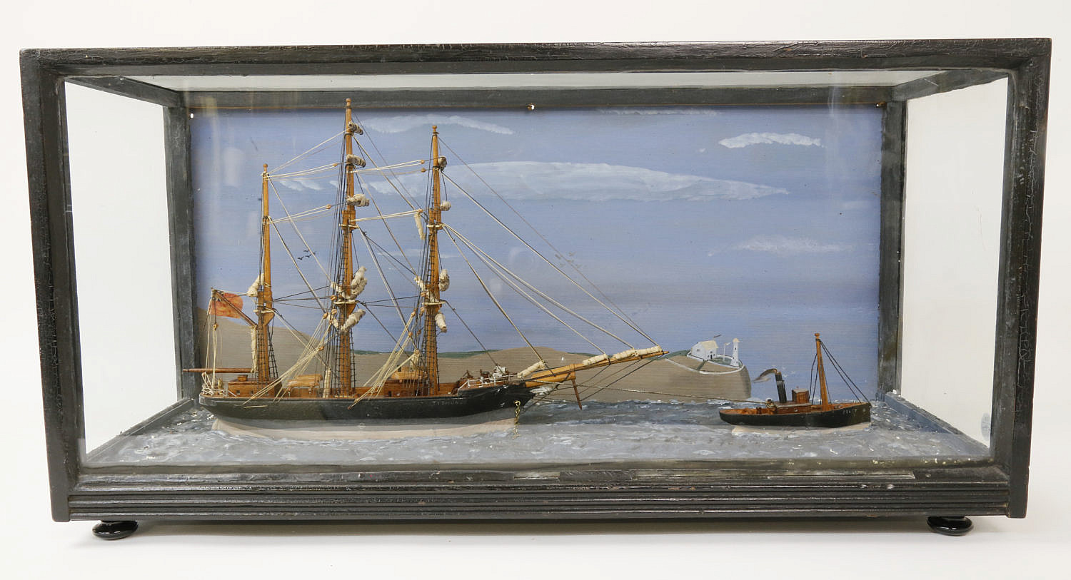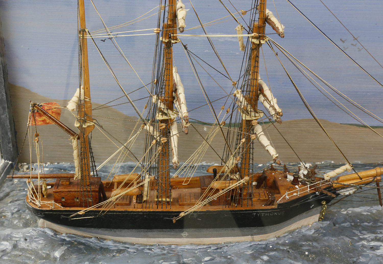 Diorama of the British Ship Tythonus, circa 1920 Consign Now DeptDecorative Arts, Furniture/Decorative Arts, Maritime ArtsSizeHeight 12 ½ in. Length 24 ¾ in. Width 9 ¾ in. Diorama of the Ship Tythonus, circa 1920, 3-masted wood ship with furled sails flying the British flag, being towed past a headland out to sea by a steam engine tugboat. Height 12 ½ in. Length 24 ¾ in. Width 9 ¾ in. Please note that this auction has ended. Click here for an overview of this auction.