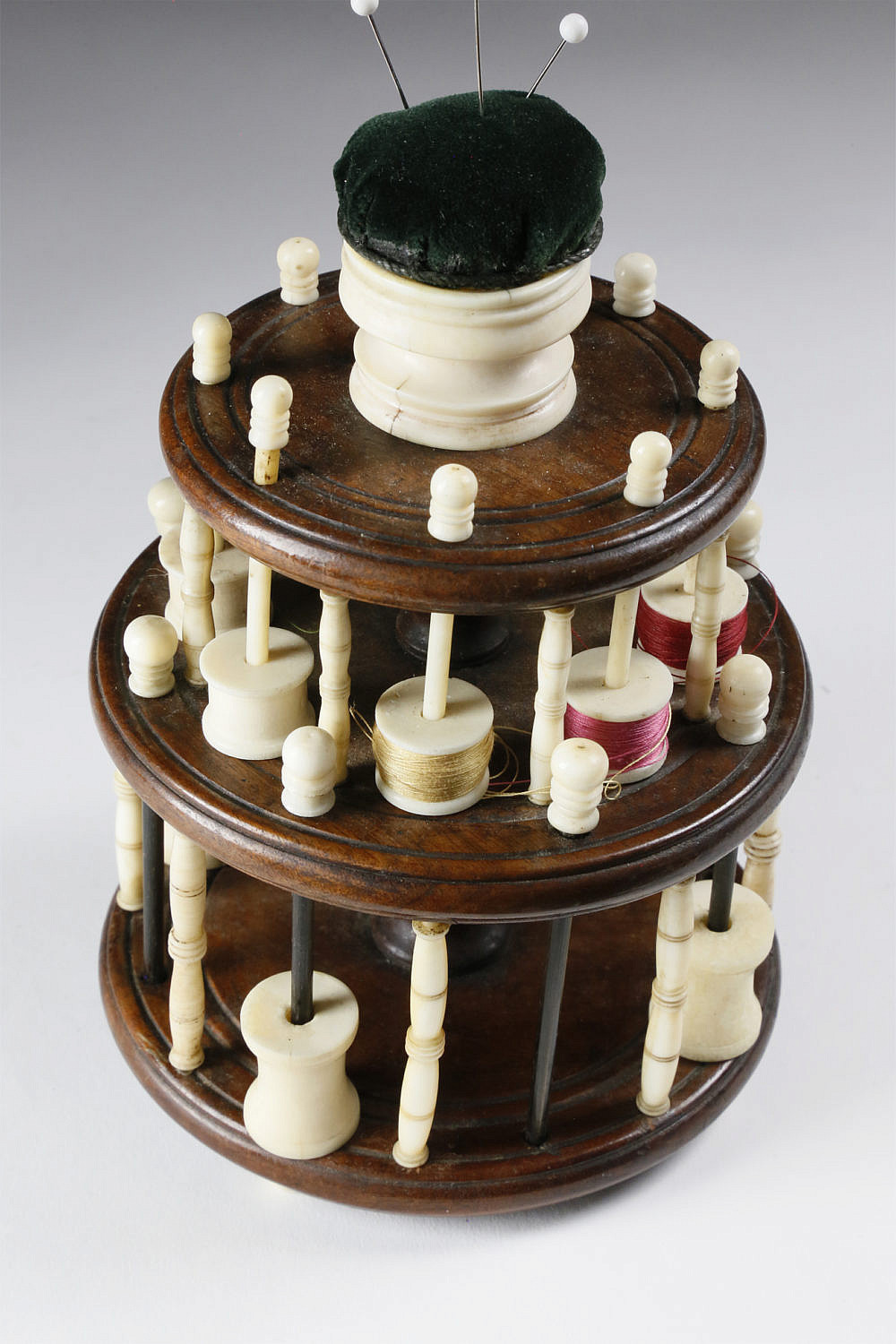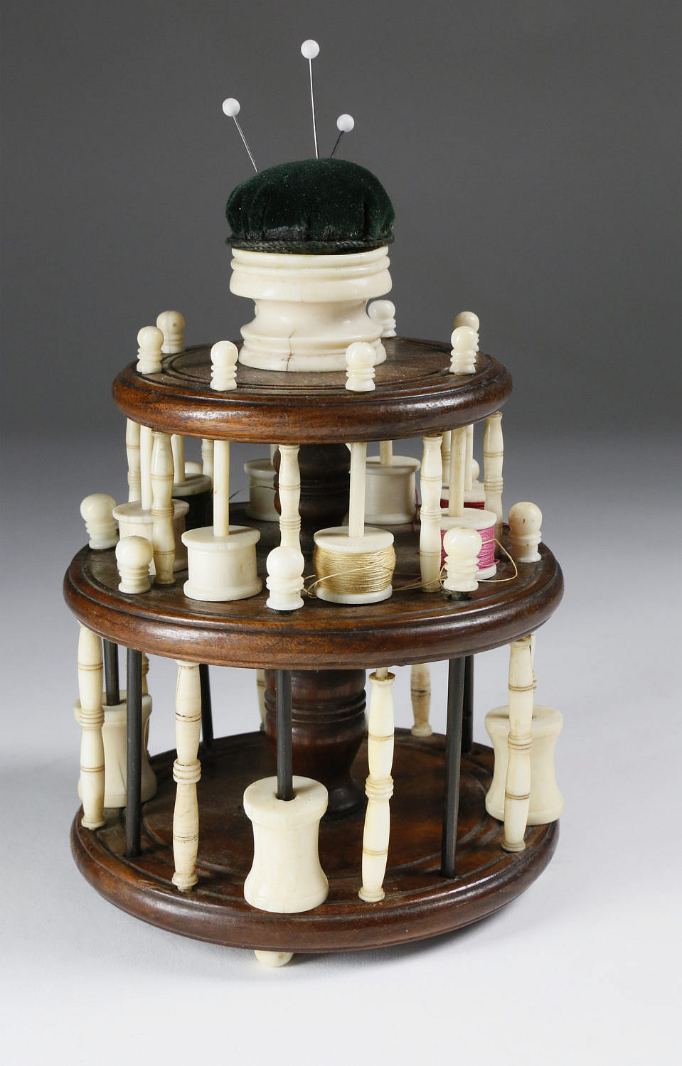 Nantucket Made Sewing Thread Spool Caddy, circa 1850 Consign Now Dept19th Century Scrimshaw, Decorative ArtsSizeHeight 7 in. Diameter 4 ½ in. Nantucket Made Sewing Thread Spool Caddy, circa 1850, turned whale ivory cup pin cushion atop a circular 3-tier scribed wood stand with 8 ivory and 8 baleen spool pegs, 16 turned, scribed and polychromed supports, 12 ivory spools on 4 ball feet. Height 7 in. Diameter 4 ½ in. Please note that this auction has ended. Click here for an overview of this auction.