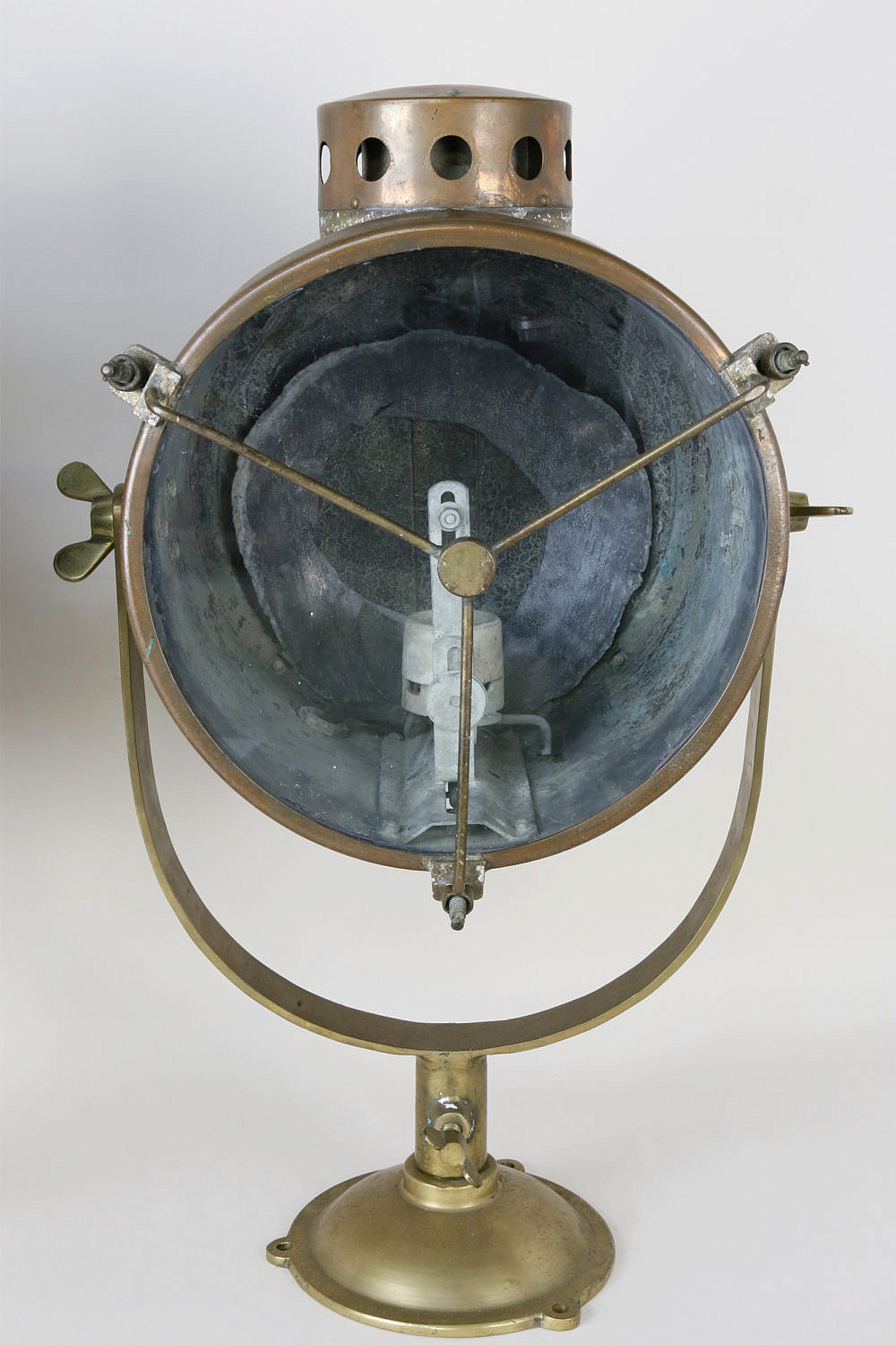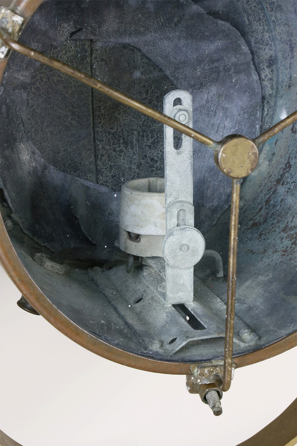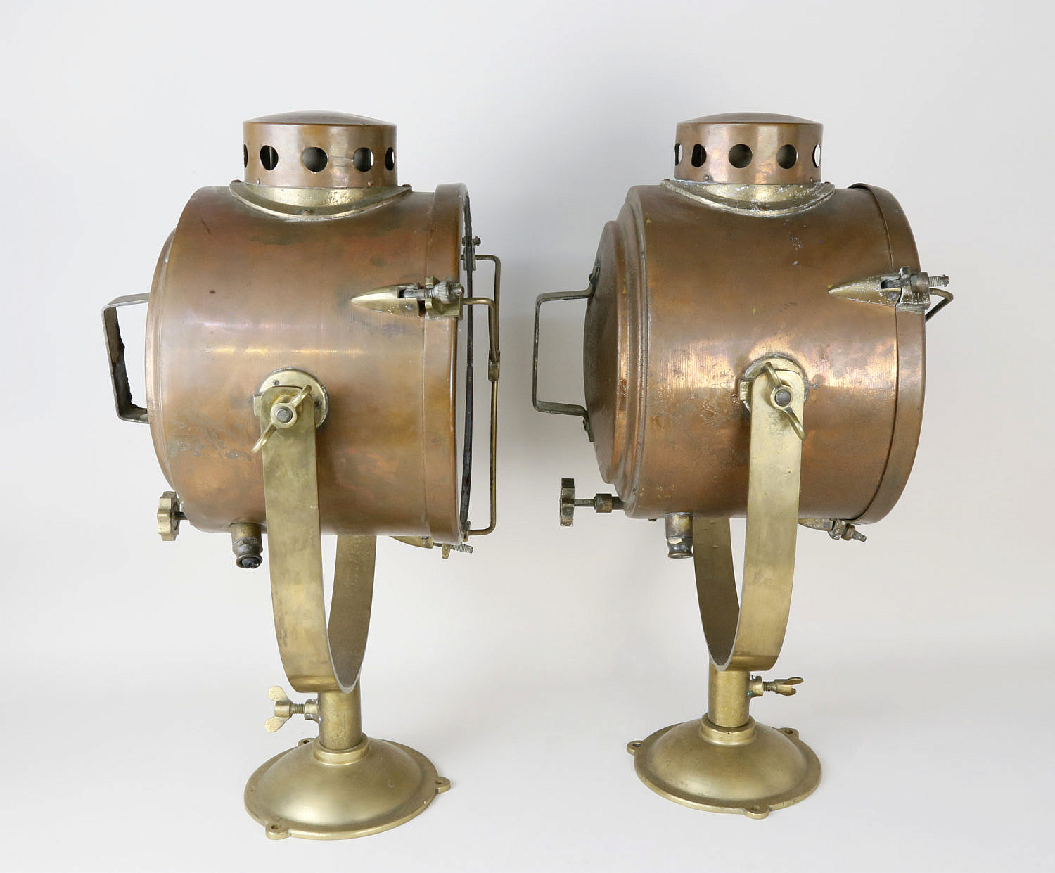 Pair of Copper and Brass Ship’s Spotlights, early 20th Century, on fully adjustable brass trunnion deck mounts, brass lens protectors, and electric socket bulb holders.