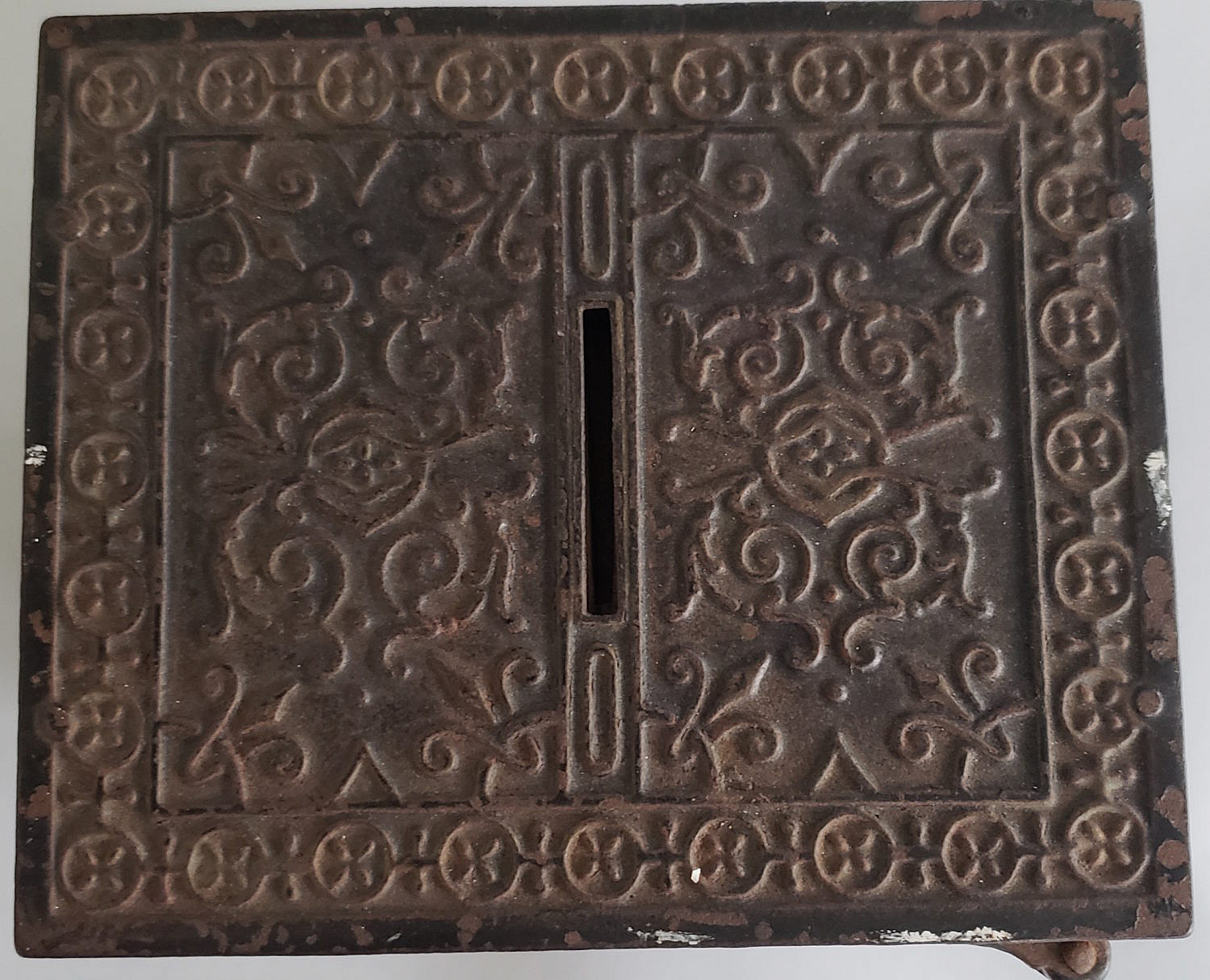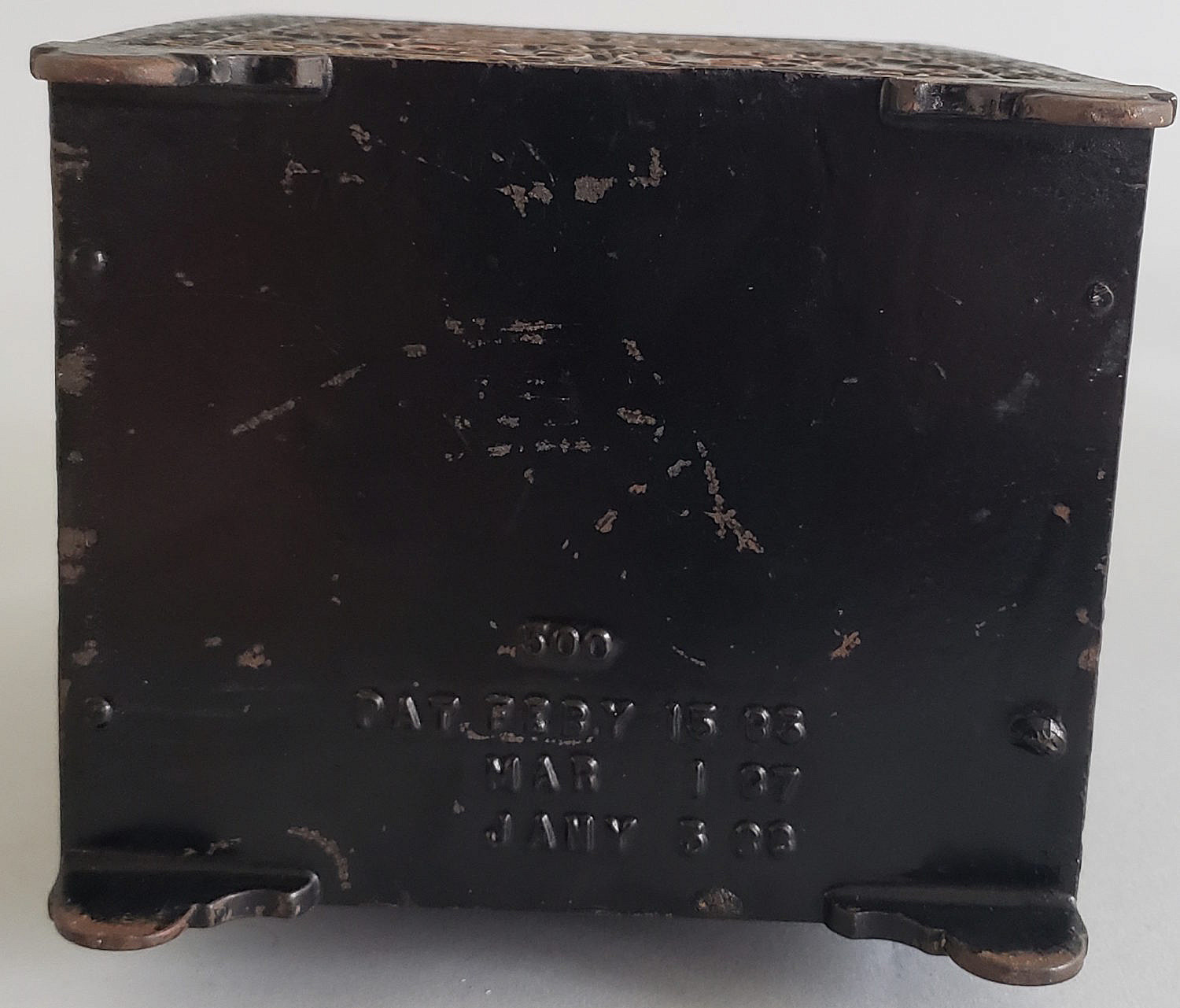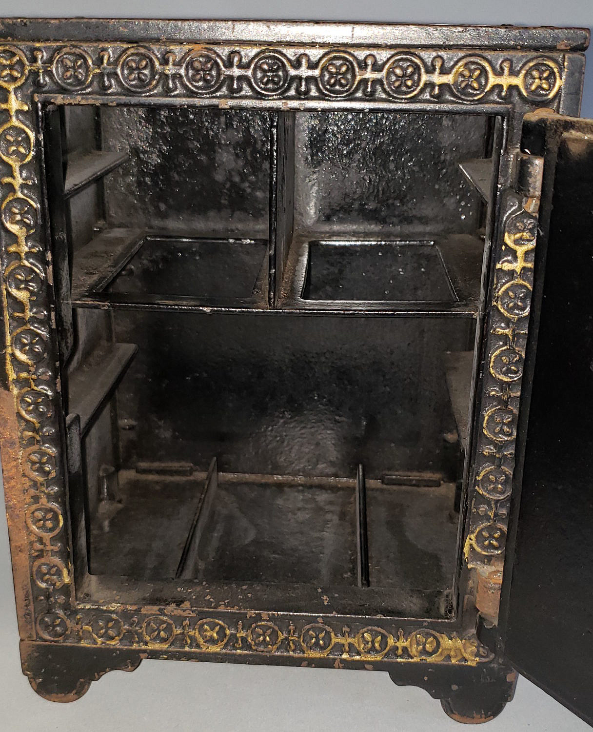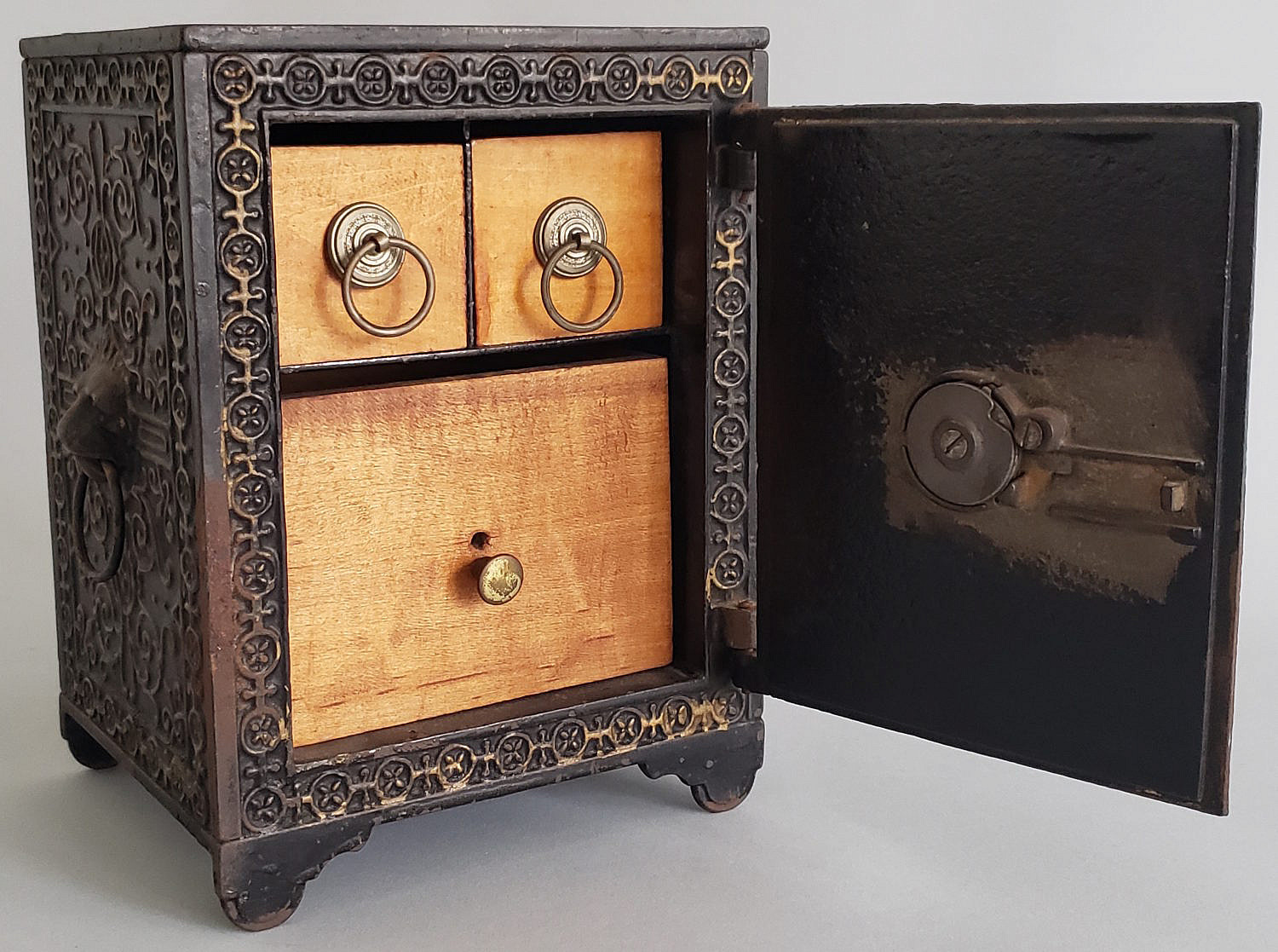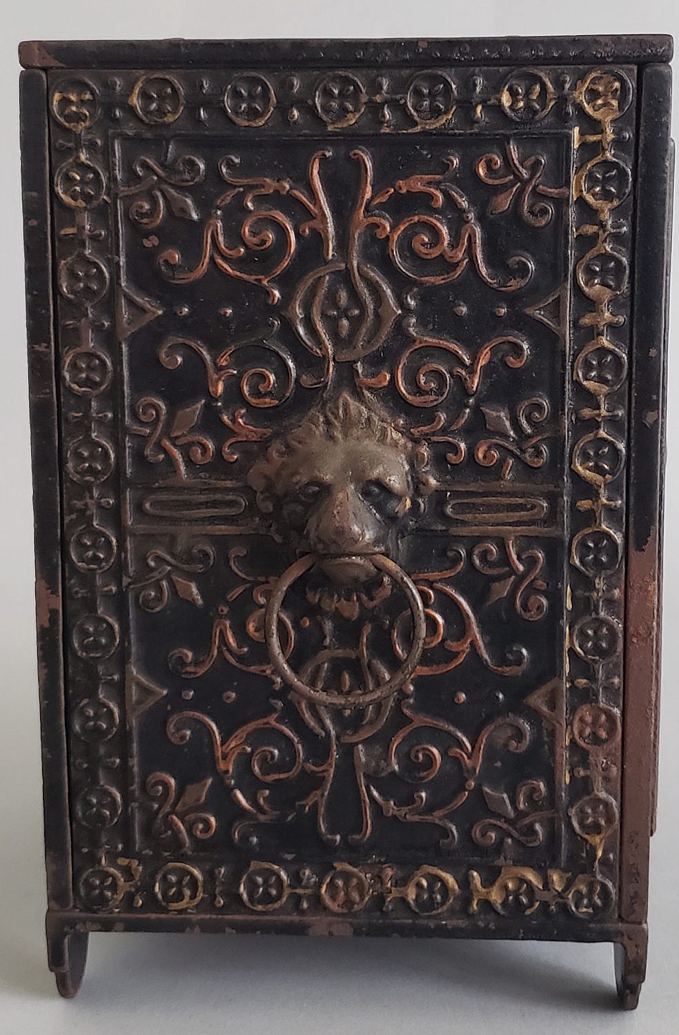 19th Century Cast Iron Safe Still Bank Consign Now DeptCollections, Furniture/Decorative ArtsSizeHeight 8.25 in. Width 7 in. Depth 5.5 in. 19th Century Cast Iron Safe Still Bank, hinged door exposing three sliding drawers, dual flanking lion’s head carrying handles, embossed on the front, “Security Safe Deposit.’ Height 8.25 in. Width 7 in. Depth 5.5 in. Please note that this auction has ended. Click here for an overview of this auction.