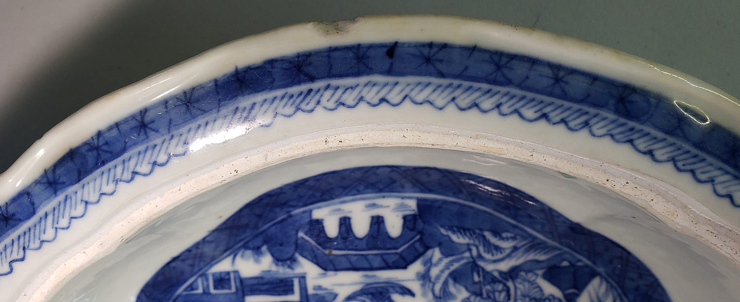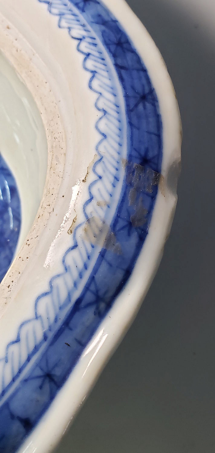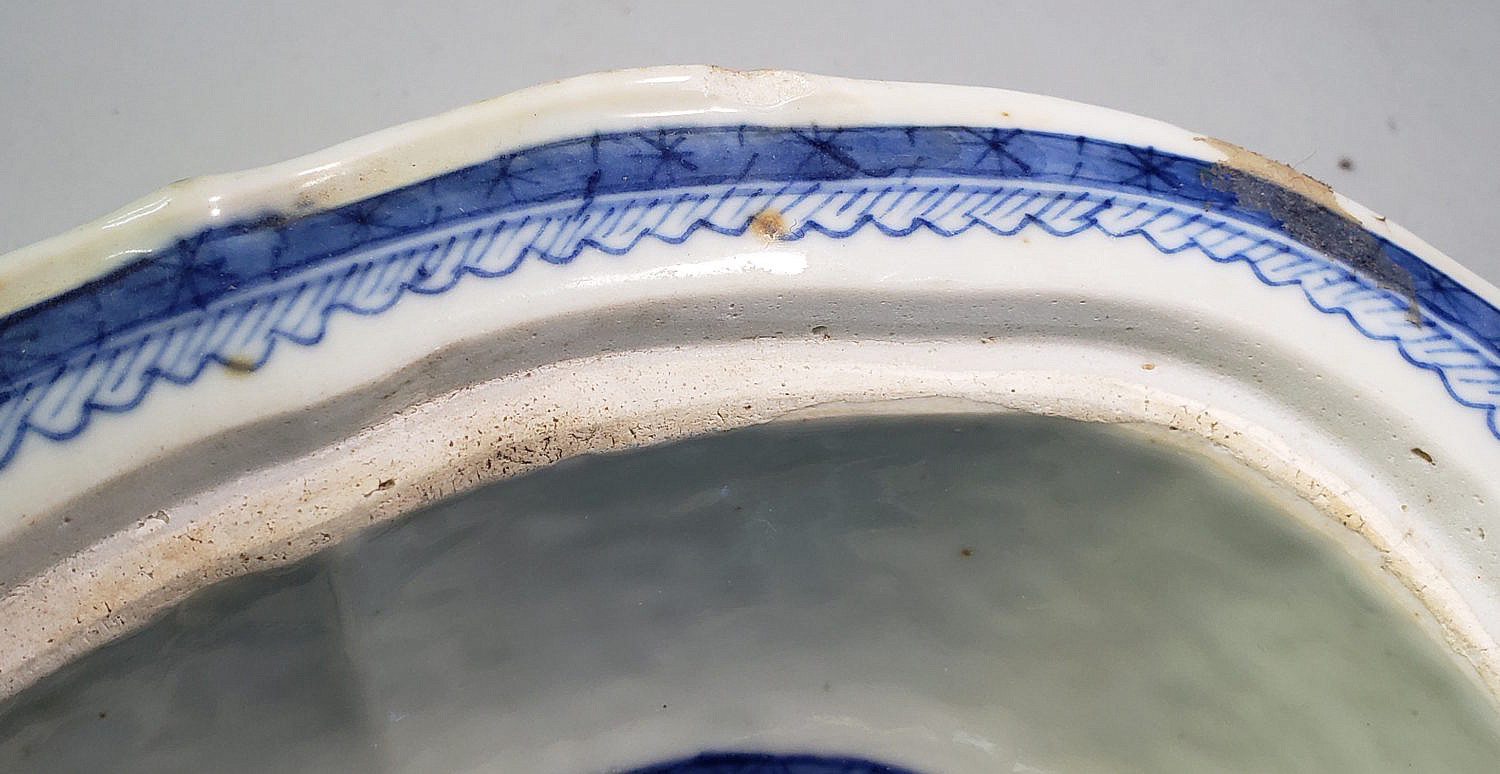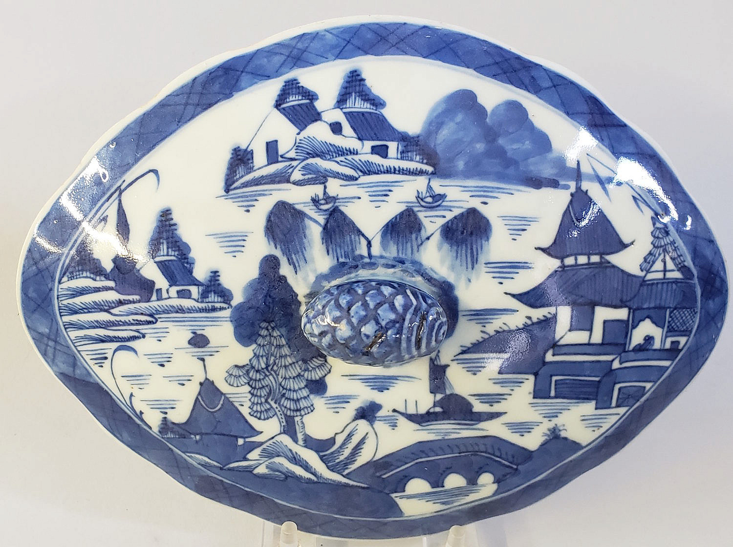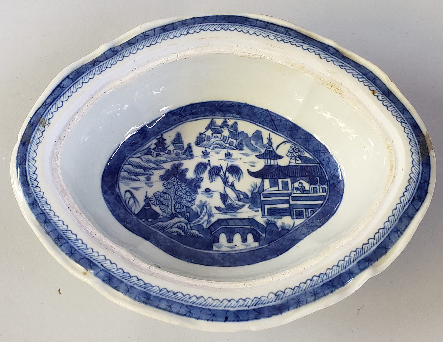 19th Century Chinese Canton Blue and White Covered Vegetable Dish Consign Now DeptAsian Arts/China Trade, Ceramics & Glass, CollectionsSizeHeight 4.25 in. Width 11 in. Depth 8.75 in. 19th Century Chinese Canton Blue and White Covered Vegetable Dish, with rain and cloud decorated border and river landscape decoration on lid and interior. Three small chips on outer rim of base as seen in photos. Height 4.25 in. Width 11 in. Depth 8.75 in. Please note that this auction has ended. Click here for an overview of this auction.