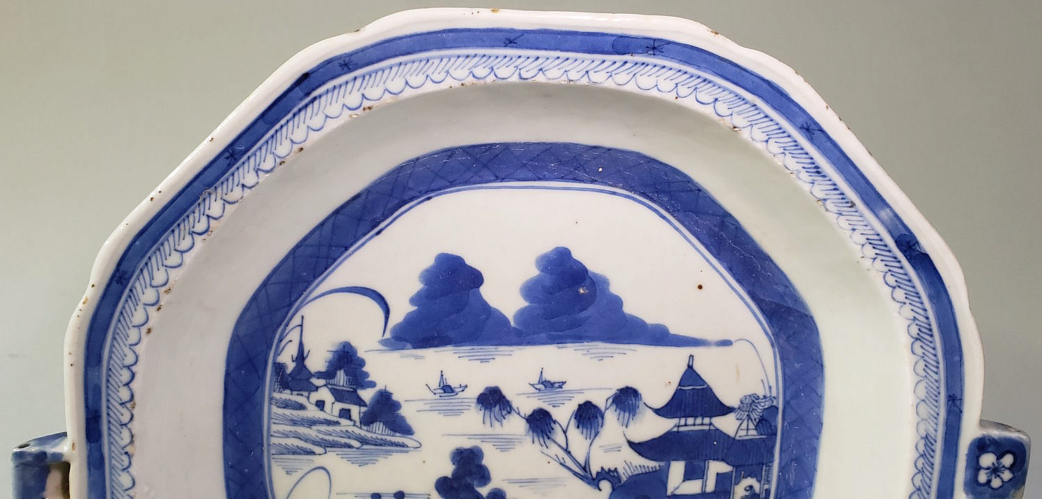 19th Century Chinese Canton Blue and White Hot Water Dish Consign Now DeptAsian Arts/China Trade, Ceramics & Glass, CollectionsSizeHeight 2.5 in. Width 10.75 in. Depth 9.5 in. 19th Century Chinese Canton Blue and White Hot Water Dish, with rain and cloud border and river landscape decoration. Height 2.5 in. Width 10.75 in. Depth 9.5 in. Please note that this auction has ended. Click here for an overview of this auction.