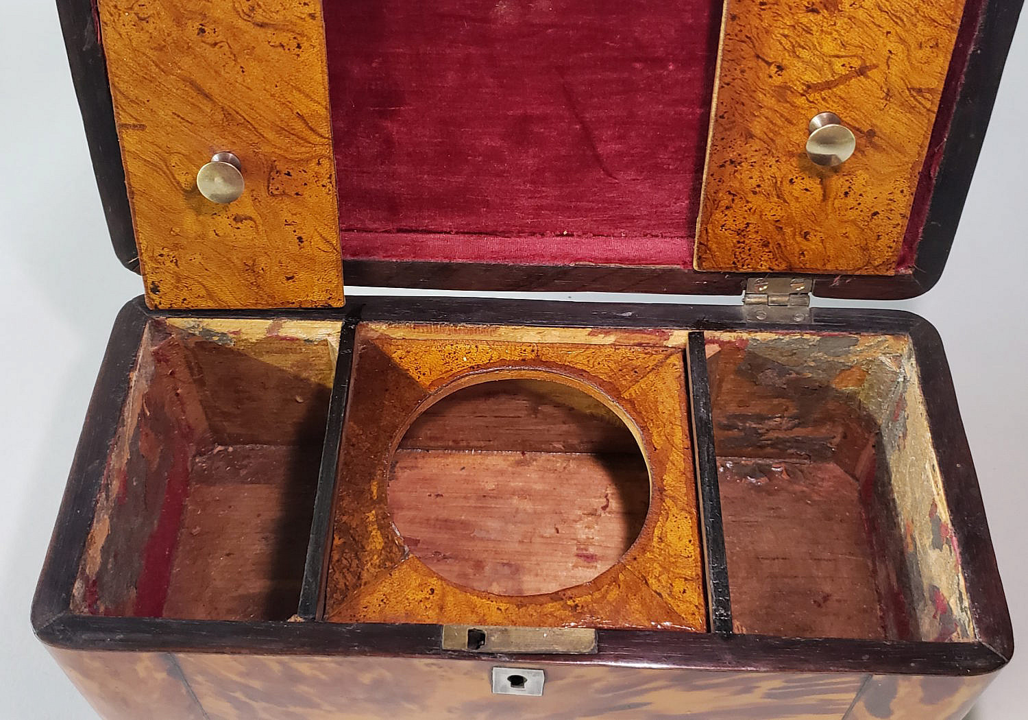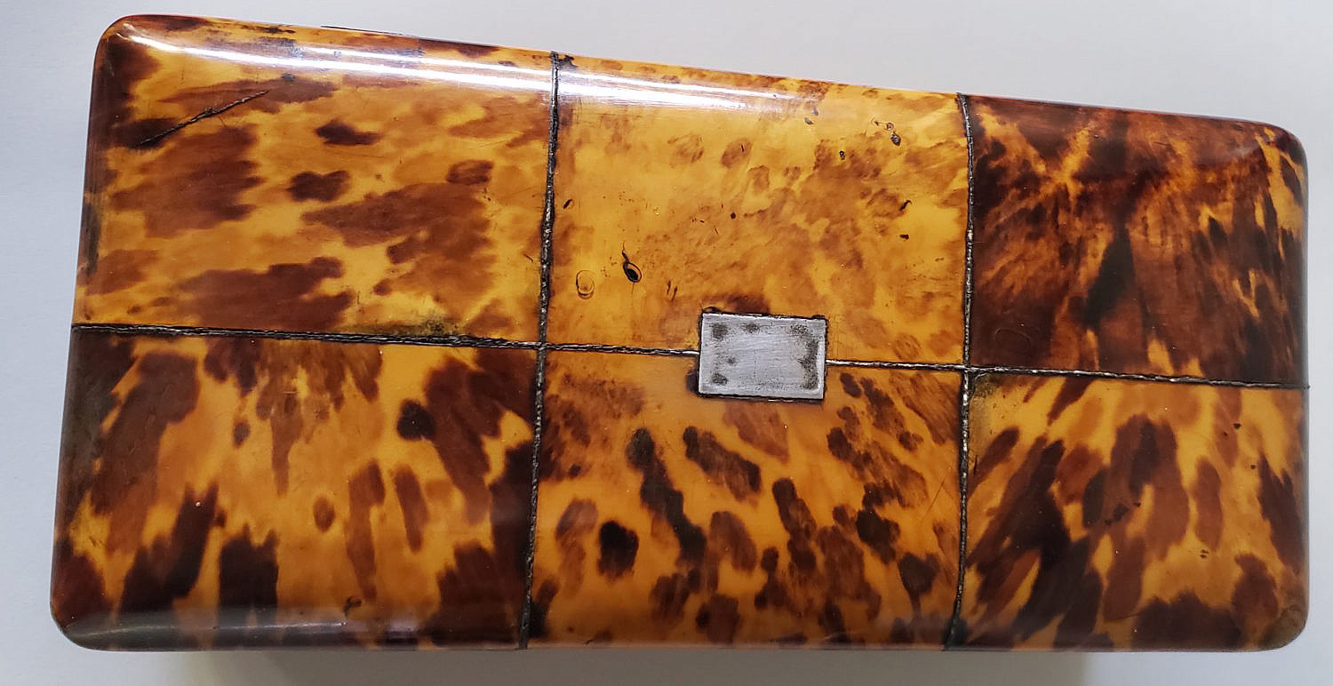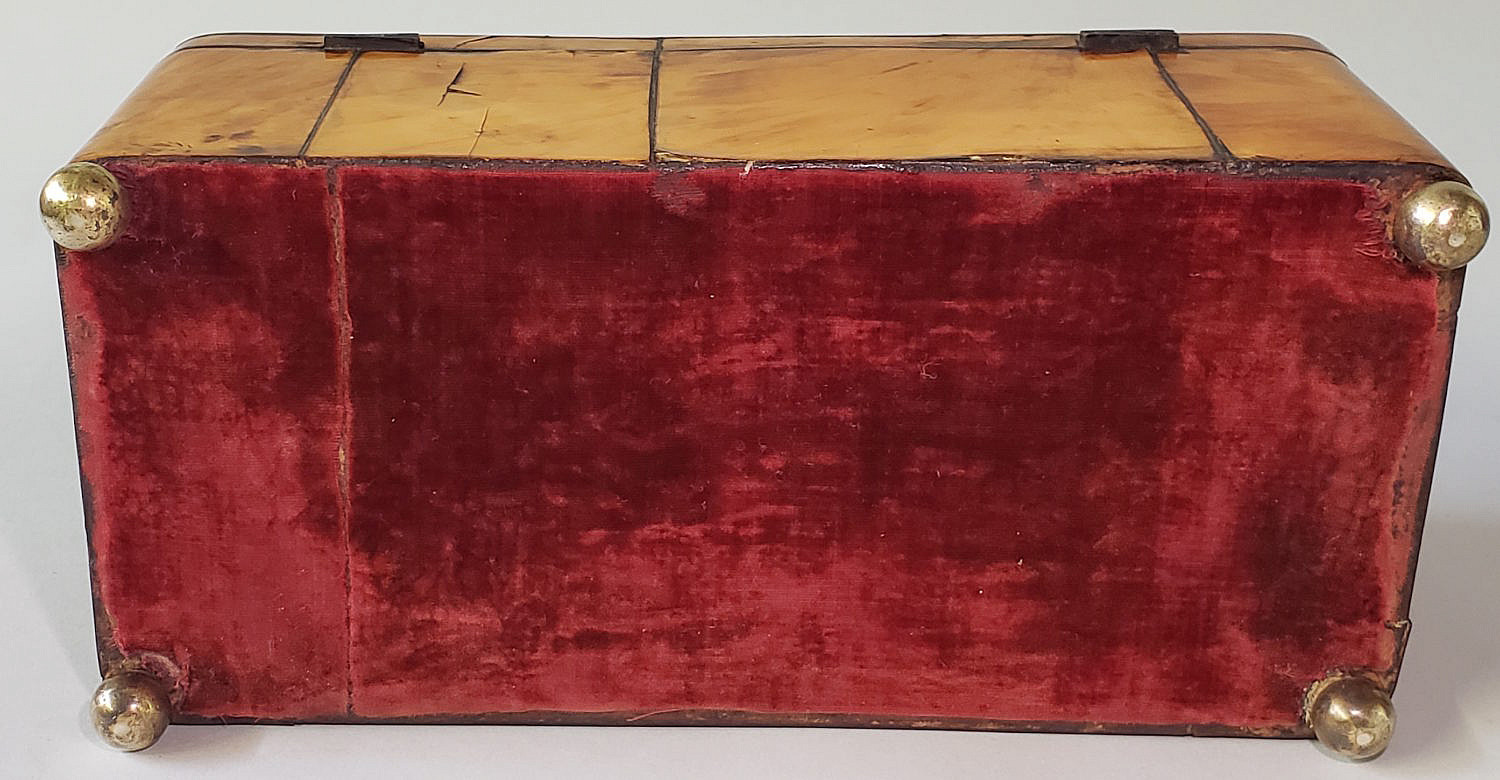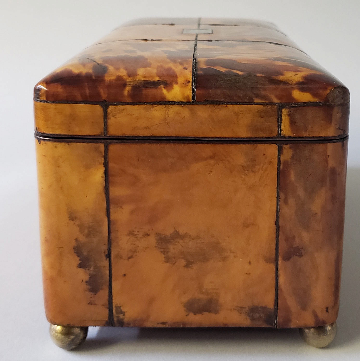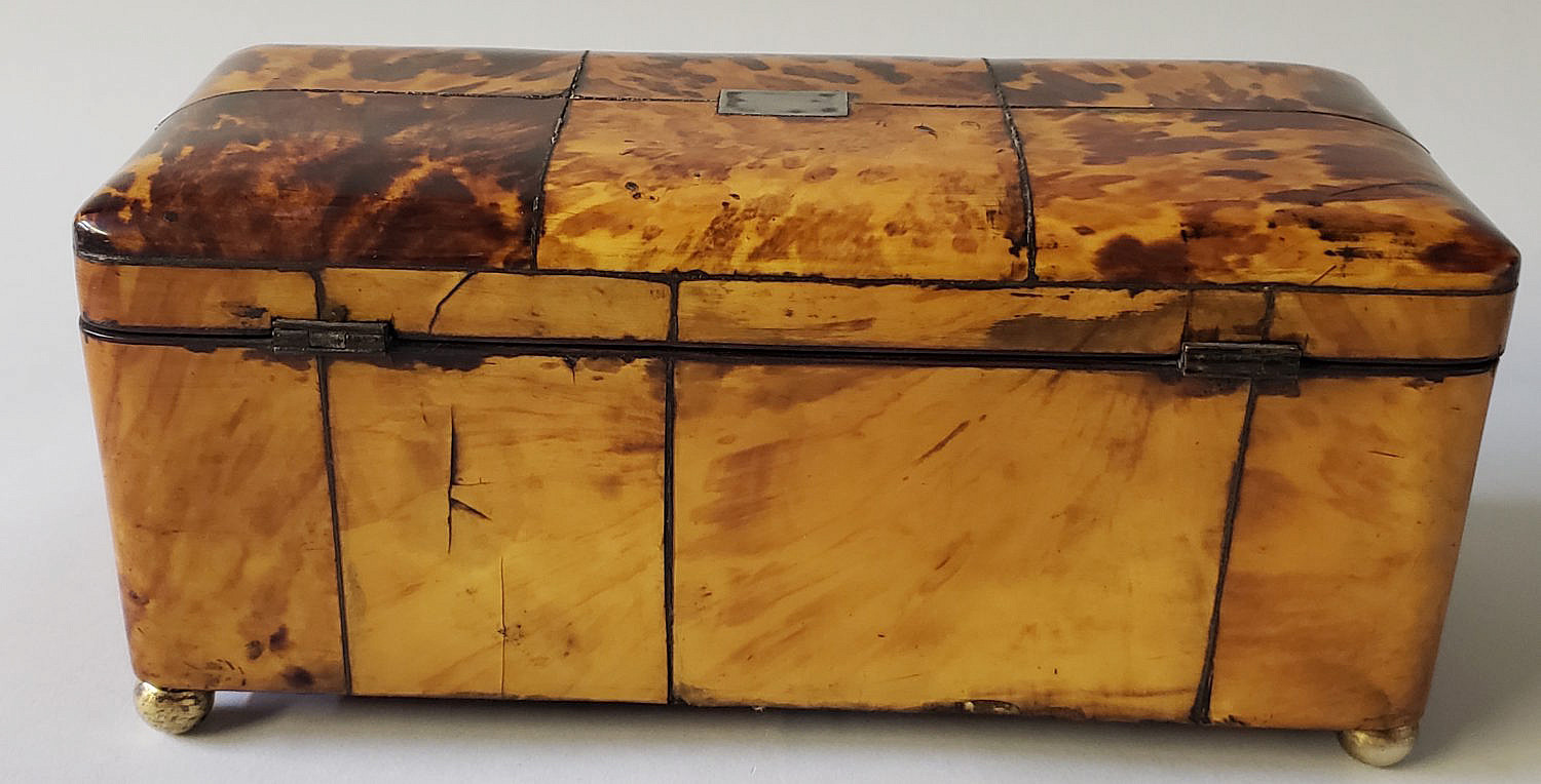 English Regency Tortoiseshell Double Compartment Tea Caddy, 19th Century, with blank sterling silver name plate and escutcheon on ball feet, hinged top exposing two lidded storage compartments with center mixing bay.
