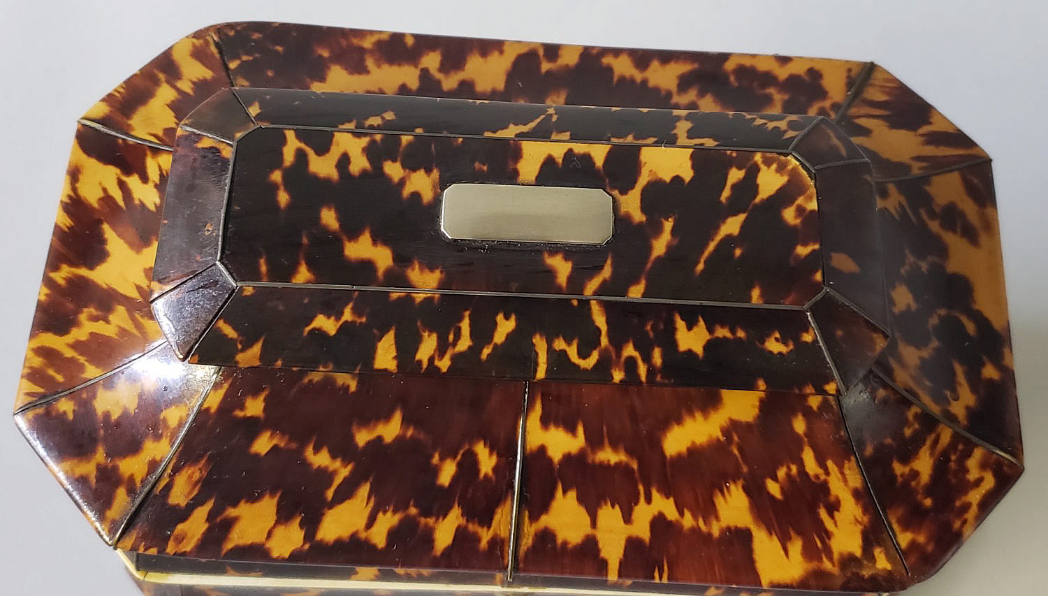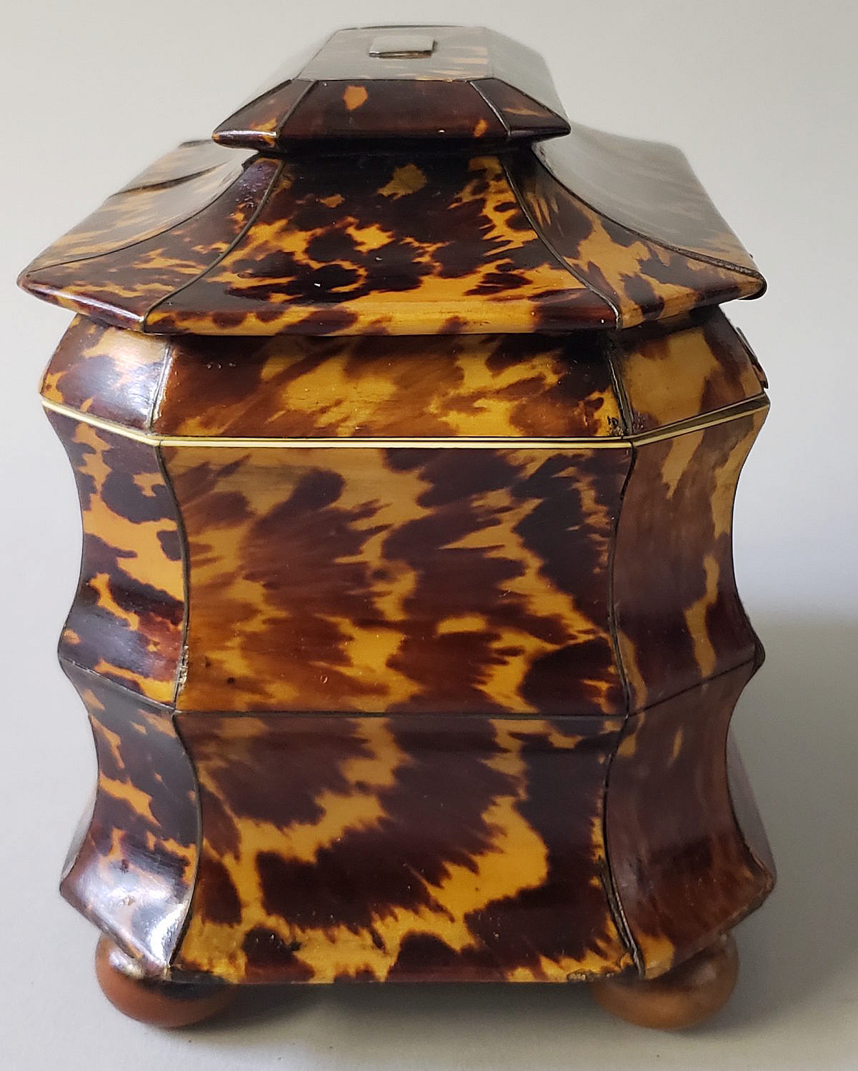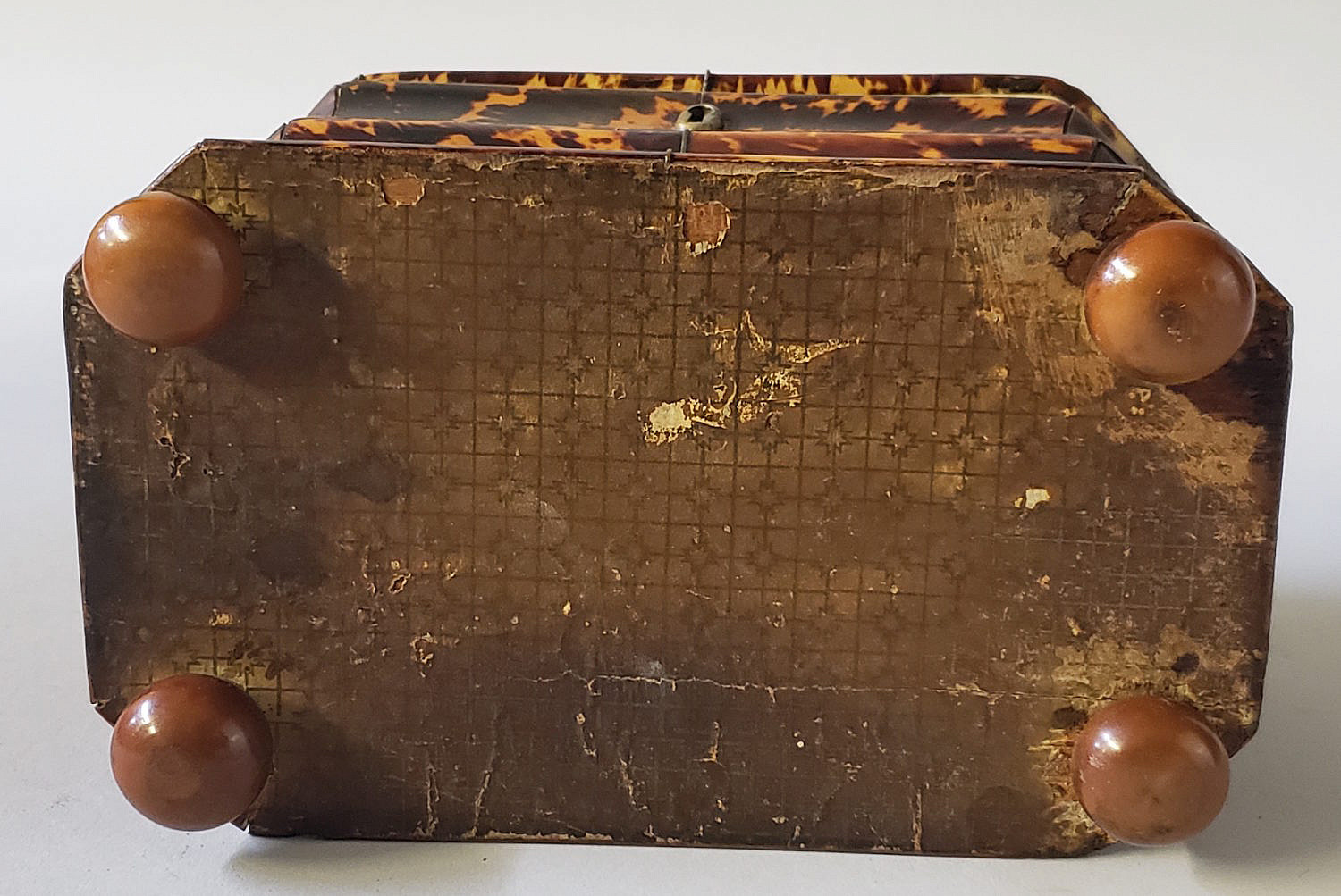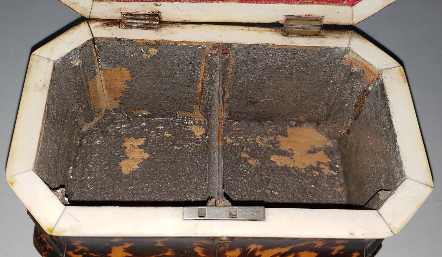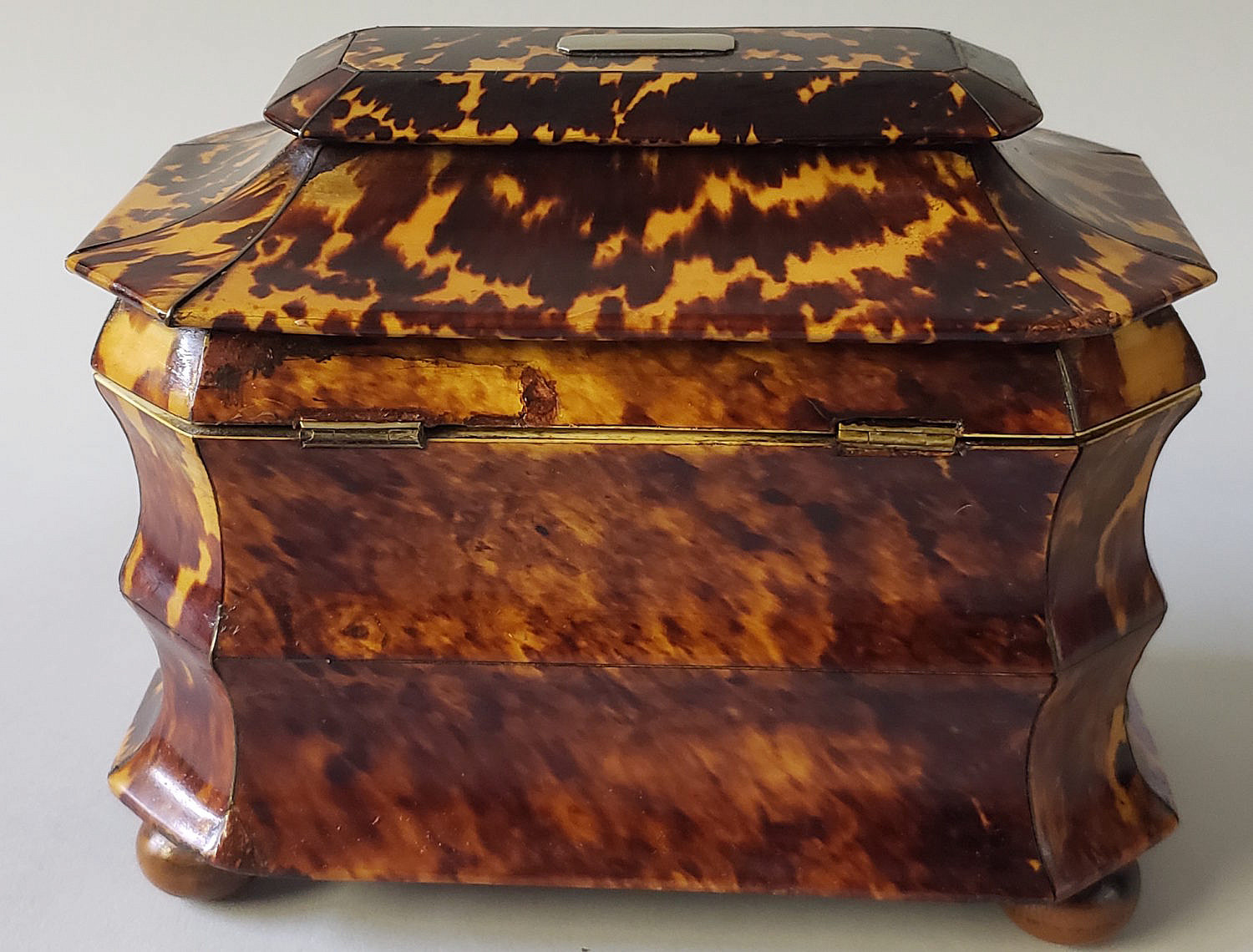 English Regency Tortoiseshell Double Compartment Tea Caddy, 19th Century Consign Now DeptCollections, Furniture/Decorative ArtsSizeHeight 6 in. Width 7 in. Depth 4.5 in. English Regency Tortoiseshell Double Compartment Tea Caddy, 19th Century, pagoda shaped top, blank sterling silver nameplate and escutcheon on bun feet. Hinged top exposing two lidded interior compartments. Height 6 in. Width 7 in. Depth 4.5 in. Please note that this auction has ended. Click here for an overview of this auction.