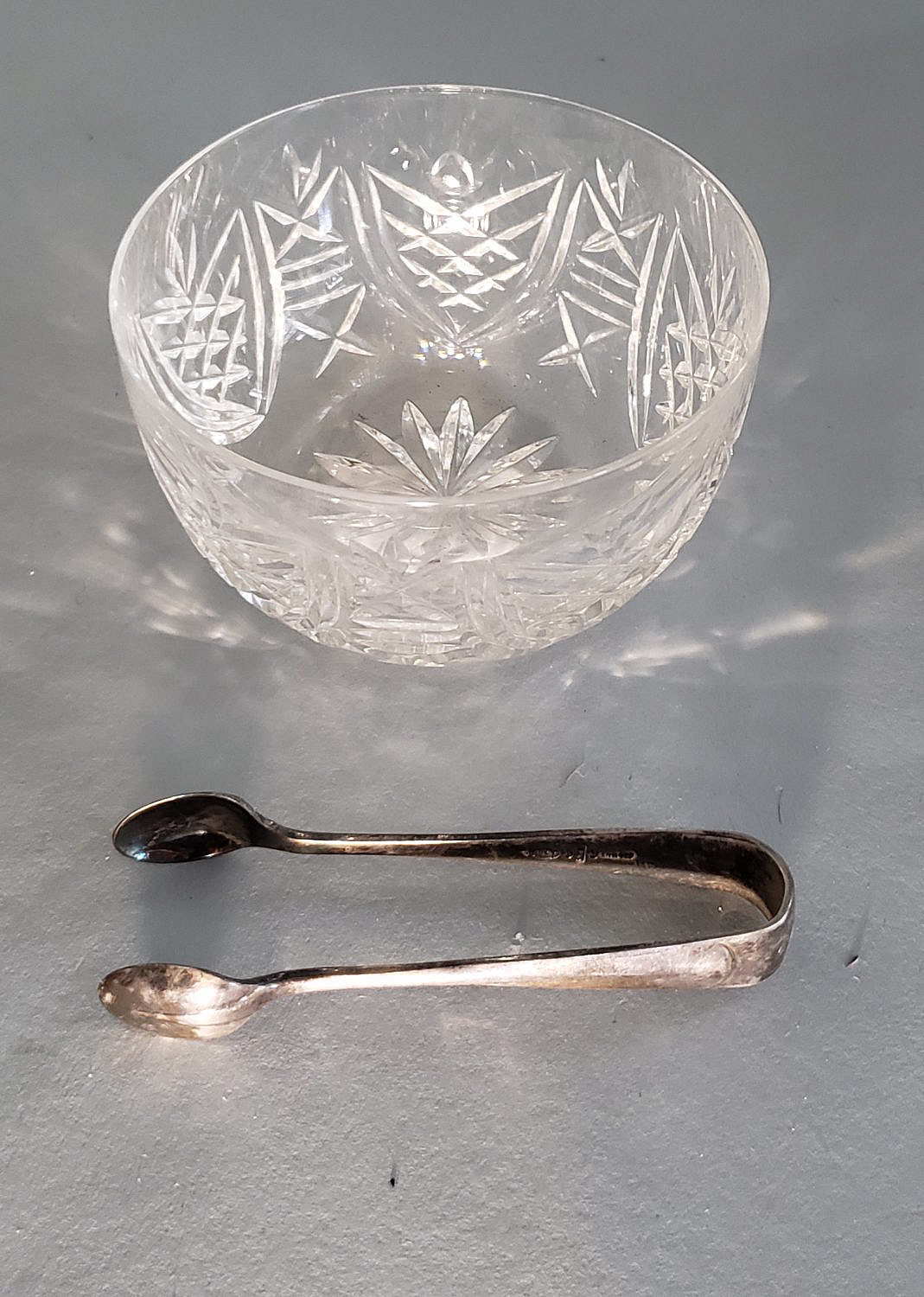 19th Century Mahogany Single Compartment Tea Caddy, with original crystal mixing bowl and sterling silver servings tongs.