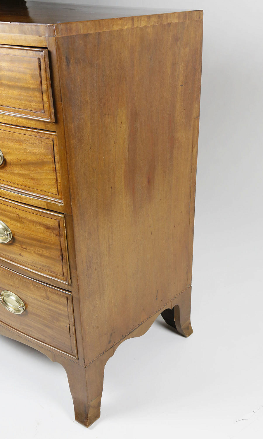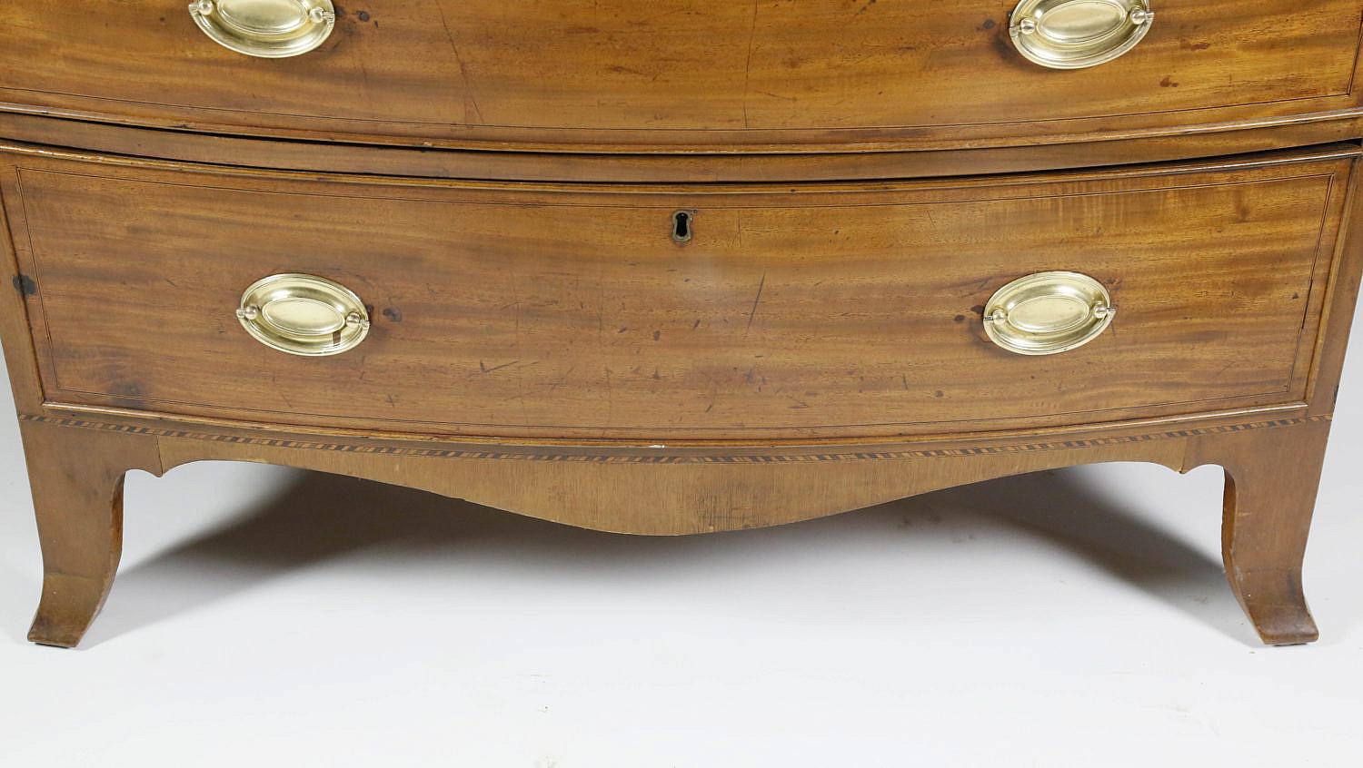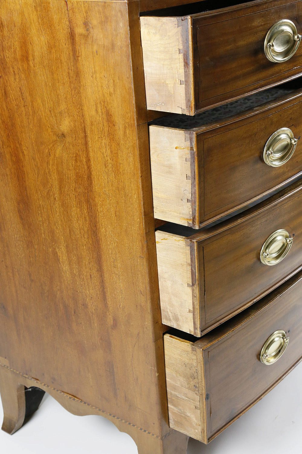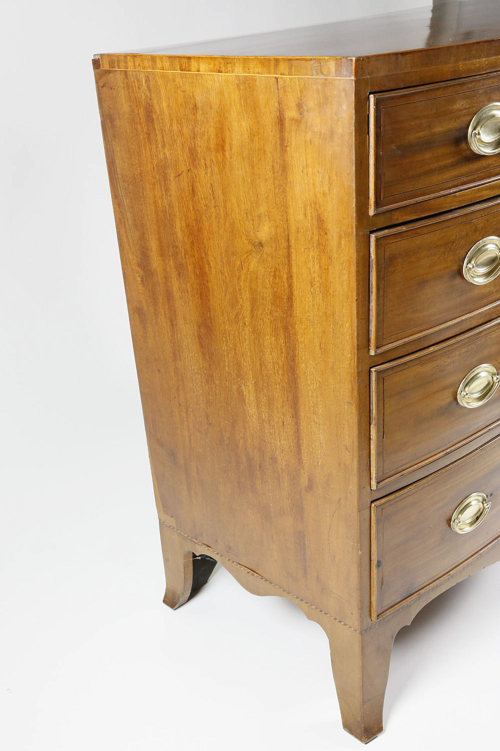 American Hepplewhite Inlaid Mahogany Chest of Drawers, circa 1800 Consign Now DeptAmericana and Folk Arts, Furniture/Decorative ArtsSizeHeight 38 in. Width 36 in. Depth 20 in. American Hepplewhite Inlaid Mahogany Chest of Drawers, circa 1800, four graduating cockbeaded drawers, inlaid apron, post and bale hardware on French bracket feet. Height 38 in. Width 36 in. Depth 20 in. Please note that this auction has ended. Click here for an overview of this auction.