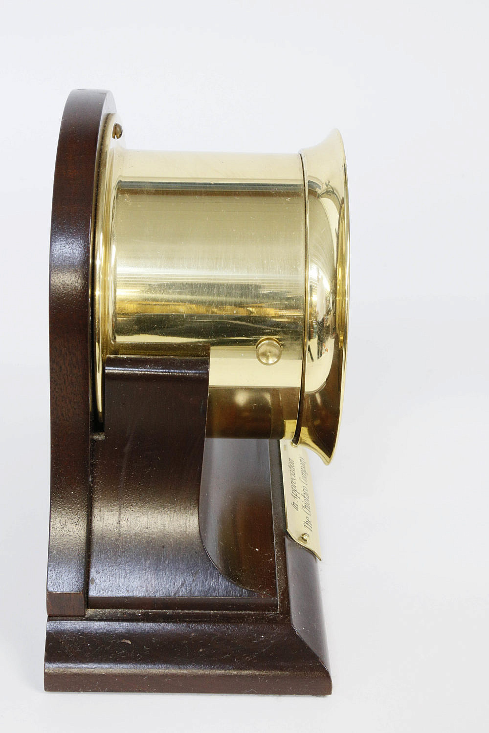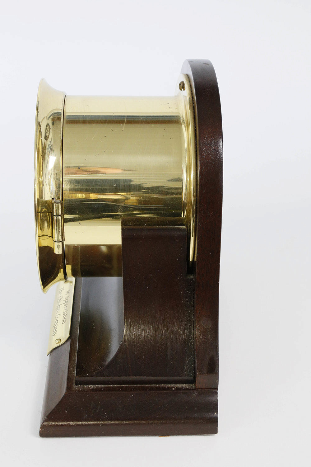 Chelsea Shipstrike Brass Mantel Clock, 20th Century, set in a conforming mahogany stand with engraved plaque “In Appreciation the Chiofaro Company”, accompanied with key, and in working condition