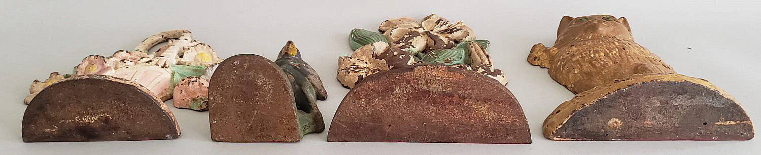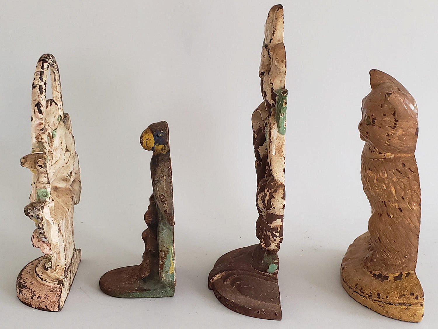 Four Antique Hubley Cast Iron Figural Doorstops Consign Now Dept20th Century Design, Collections, Furniture/Decorative ArtsSizeHeight From 10.5 in. to 6.25 in. Four Antique Hubley Cast Iron Figural Doorstops, circa 1920, a parrot marked 25, a cat marked 38, and two flower basket doorstops marked 472 and 182, all with original paint some worn more than others as seen in photos. Height From 10.5 in. to 6.25 in. Please note that this auction has ended. Click here for an overview of this auction.