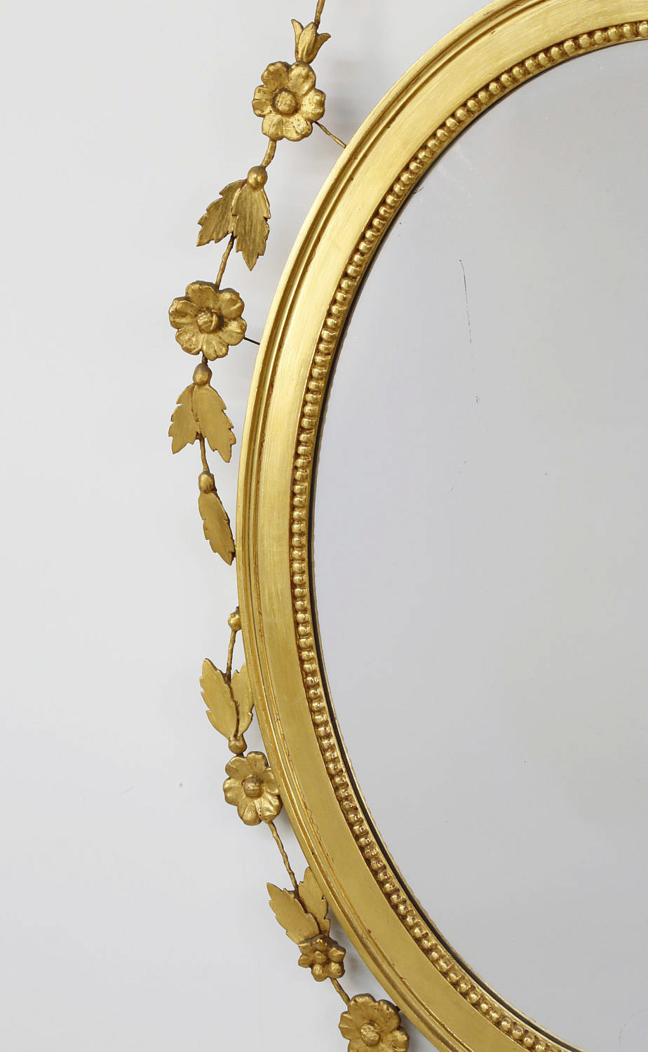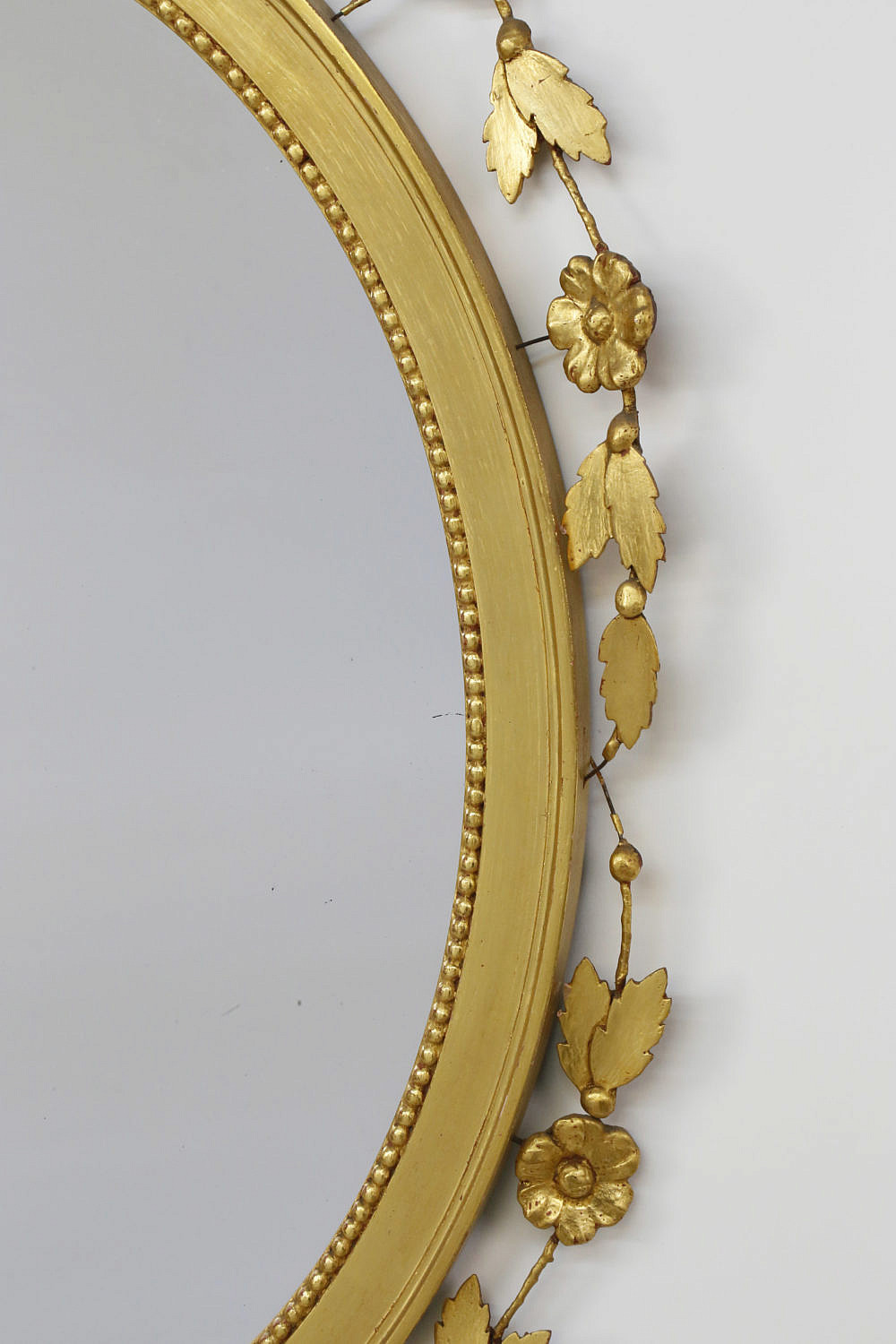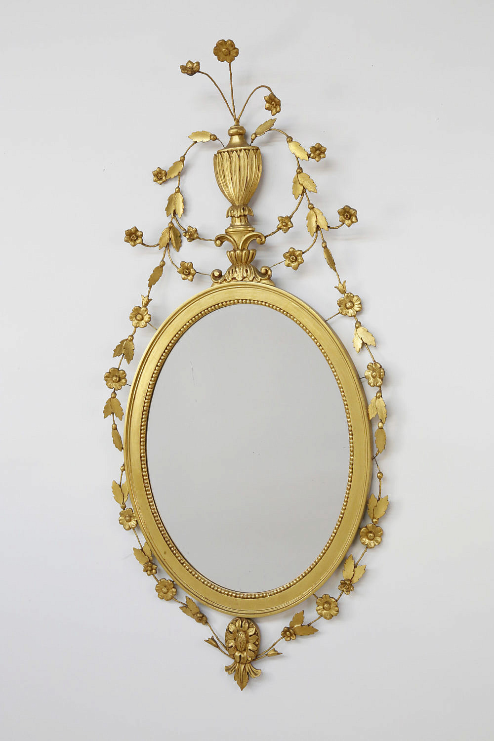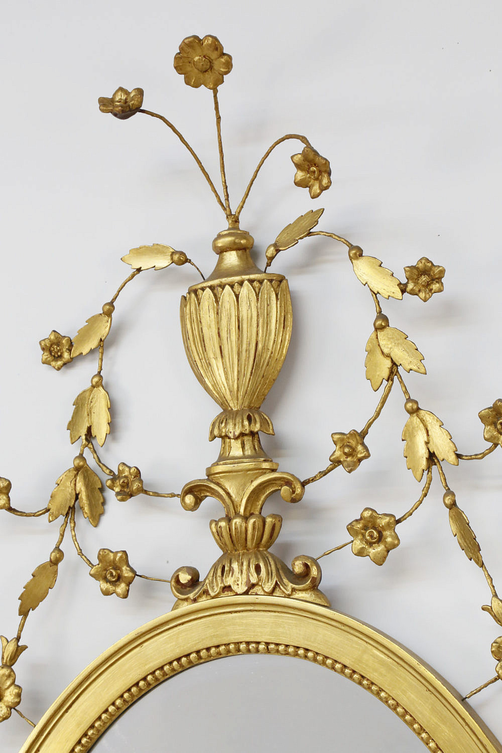 Sheraton Style Carved and Gilt Mirror, 20th Century, with floral urn pediment cascading down to the drop pediment