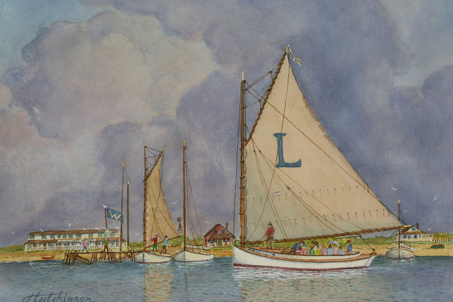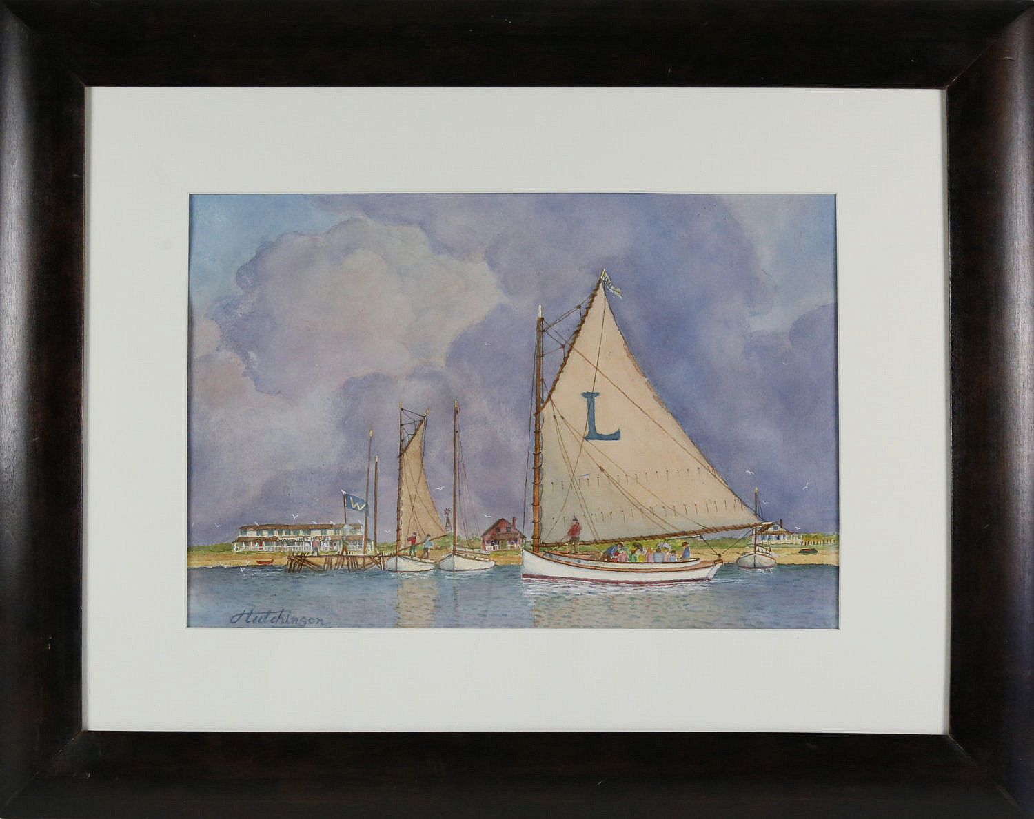 John Hutchinson Watercolor “Beating the Squall — The Lillian Arrives at the Wauwinet House”, signed lower left Hutchinson, walnut molded frame with mat.