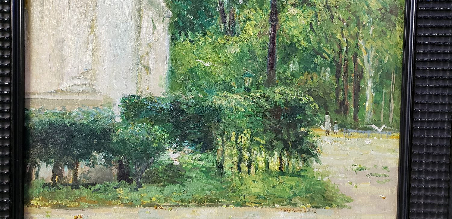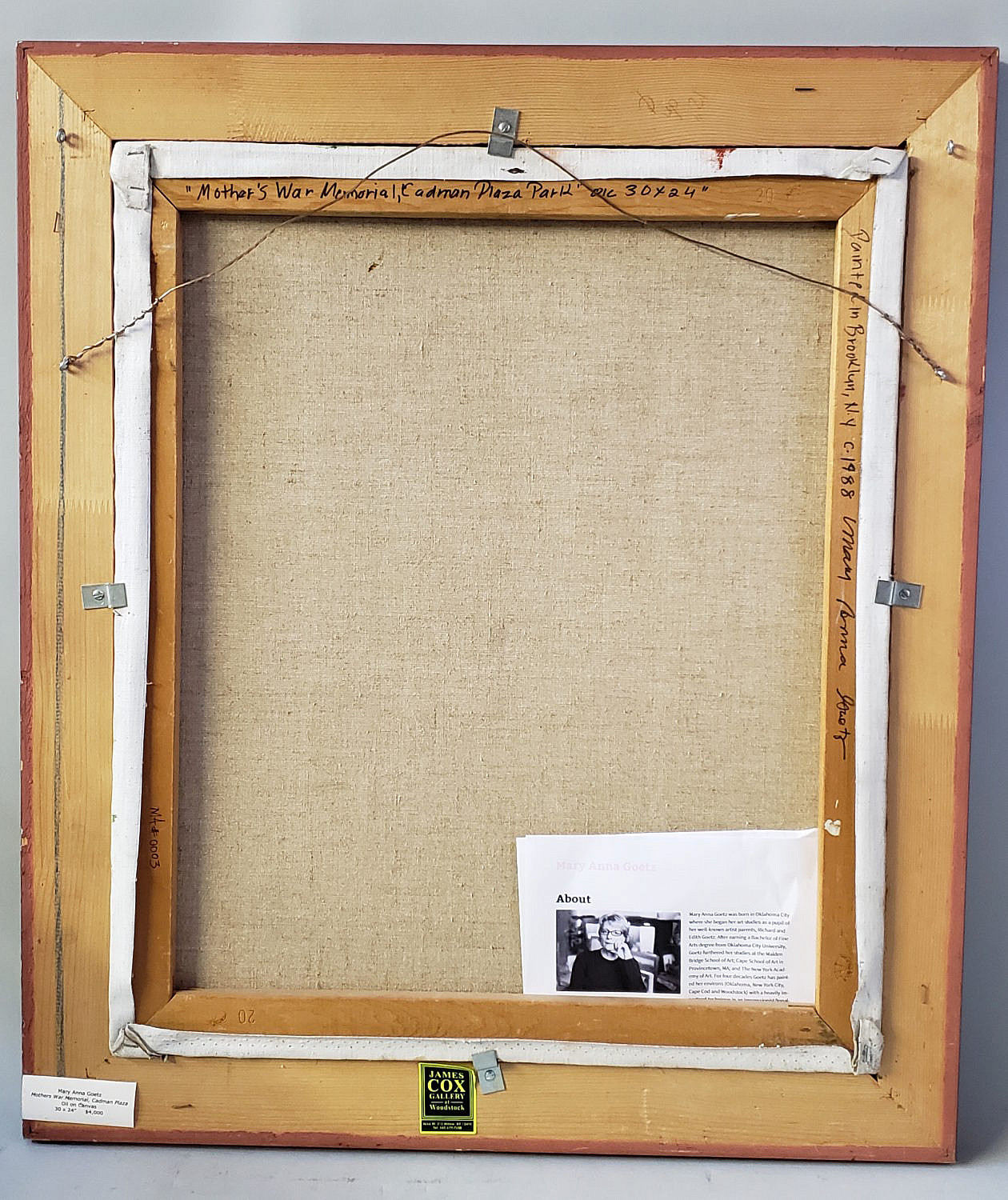 Mary Anna Goetz Oil on Canvas, Mother’s War Memorial, Coldman Plaza” Consign Now DeptCollections, Fine ArtsSize24 in. x 20.5 in. Overall 30 in. x 40 in. Mary Anna Goetz (American b. 1946) Oil on Canvas, Mother’s War Memorial, Coldman Plaza”, circa 1988, signed lower right, “Mary Anna Goetz”. Written on back of frame, “Painted in Brooklyn, N.Y. 1988”. 24 in. x 20.5 in. Overall 30 in. x 40 in. Please note that this auction has ended. Click here for an overview of this auction.
