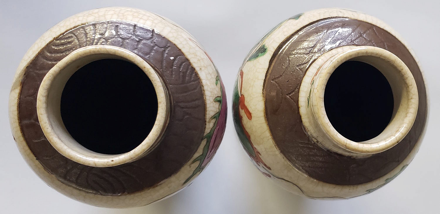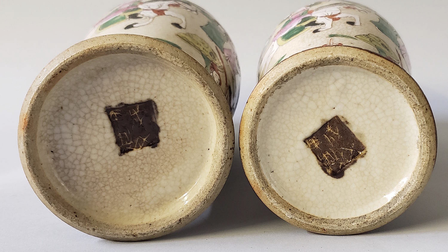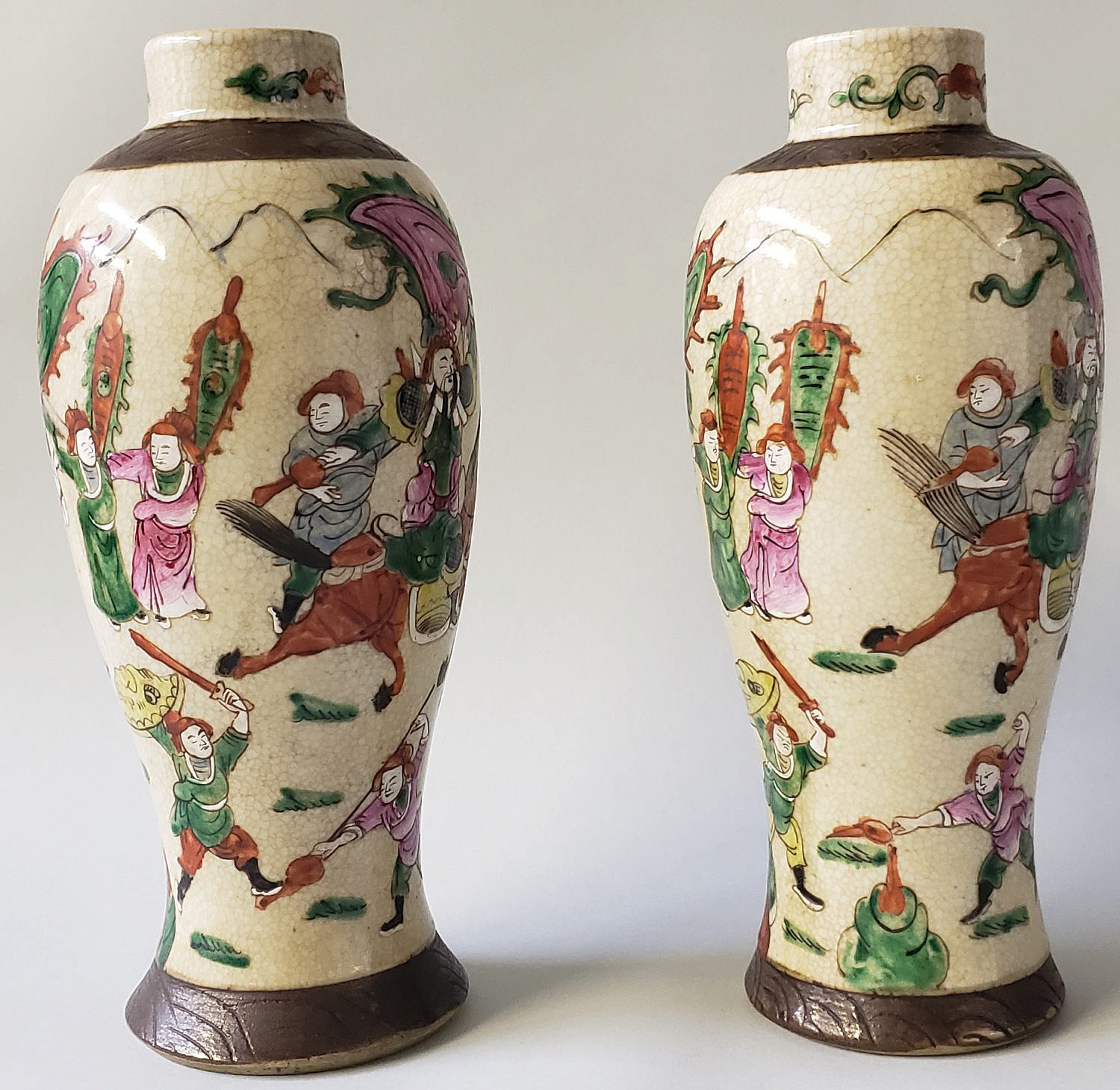 Pair of 19th Century Korean Porcelain Decorated Vase, with warrior and ceremonial decoration, signed upon the base. One vase seems to be slightly larger in some areas than the other. Both are the same height but the diameter of the base and width of the collar are slightly different.