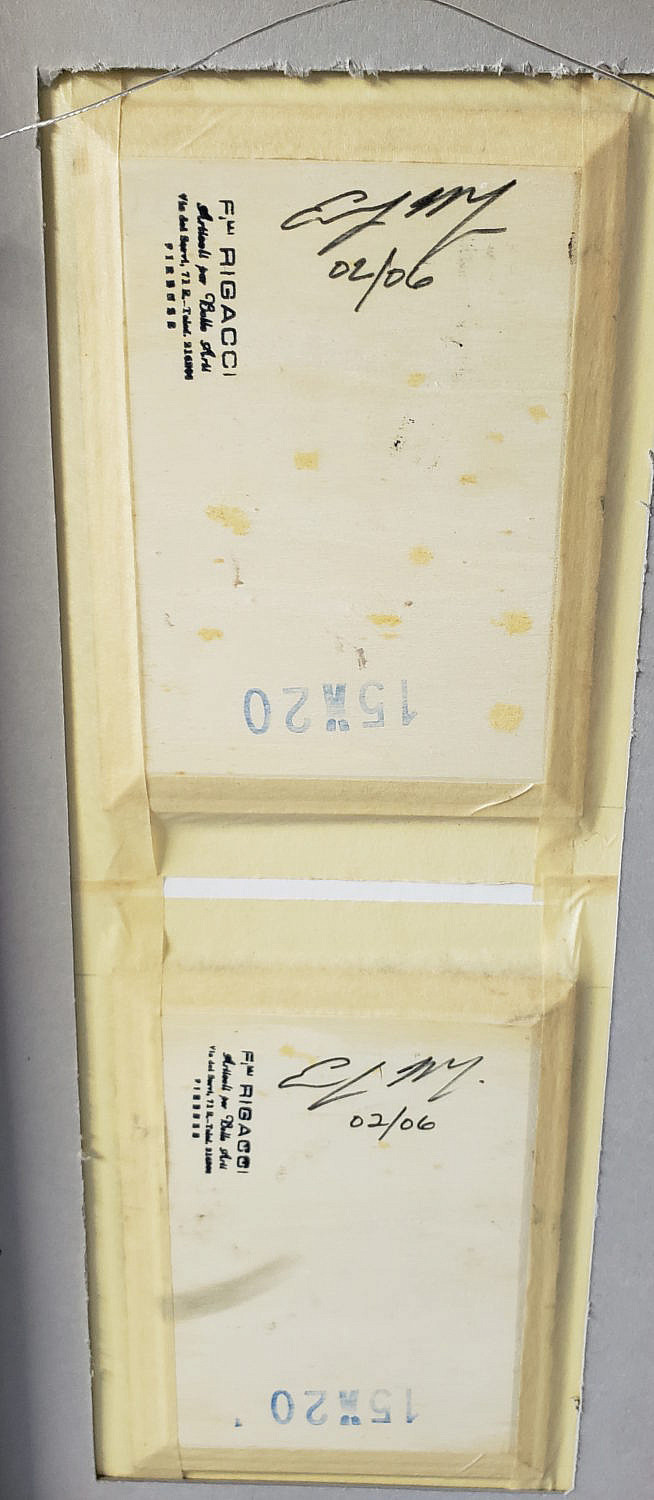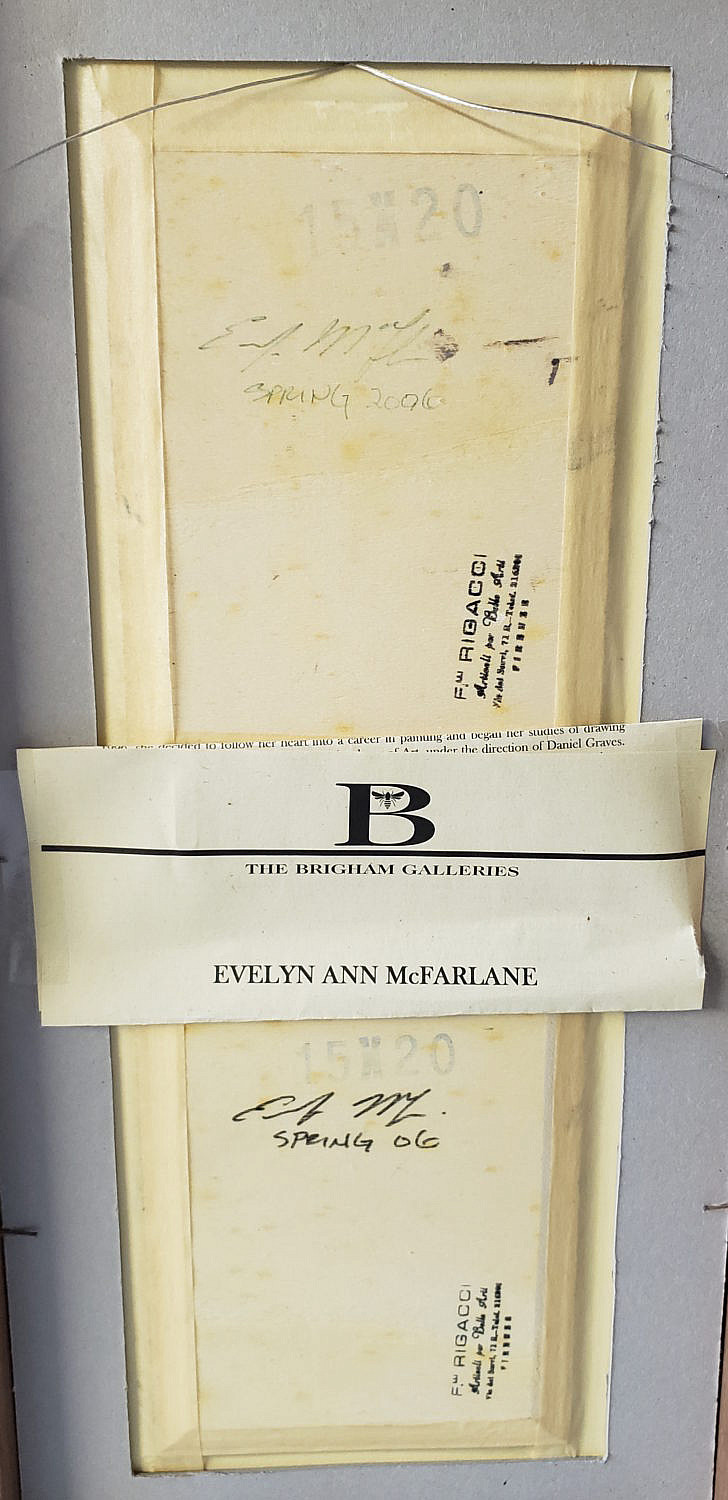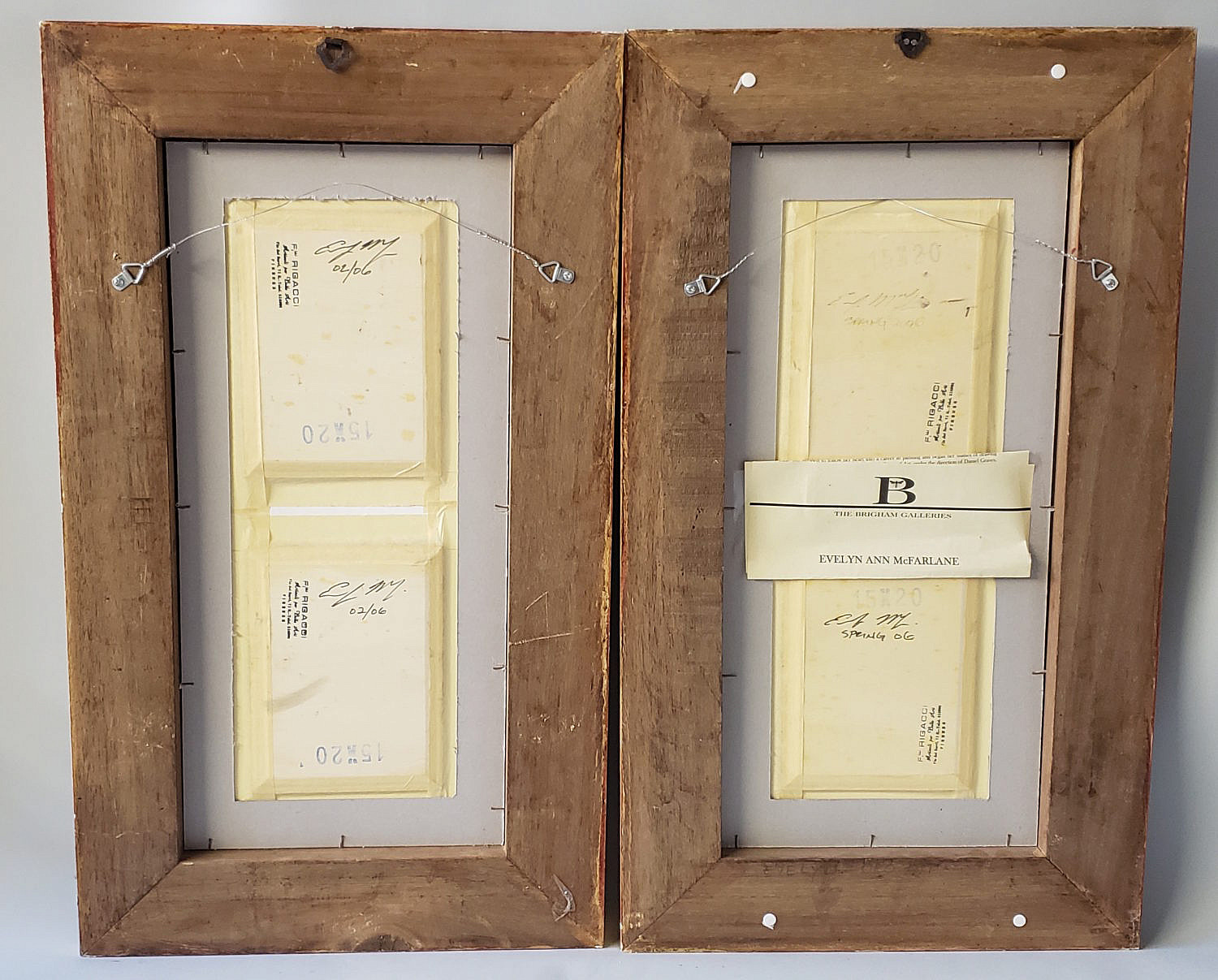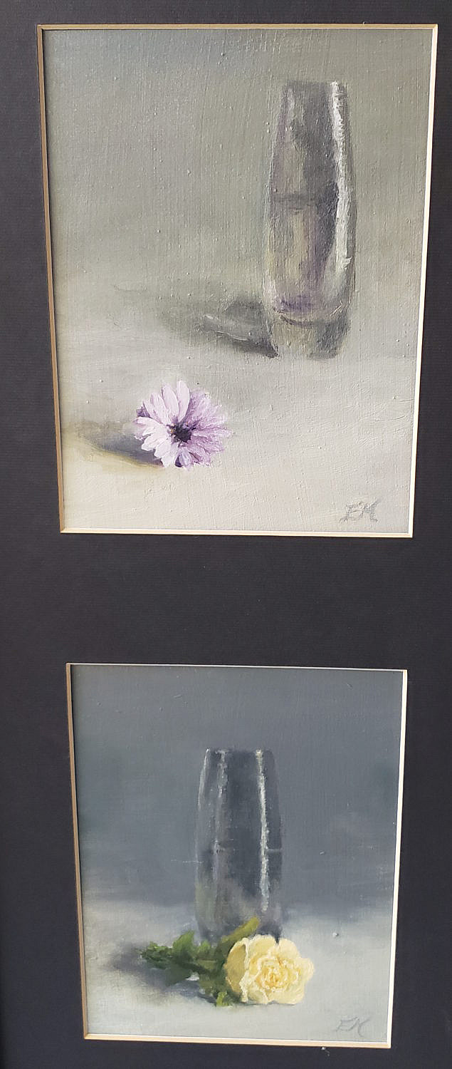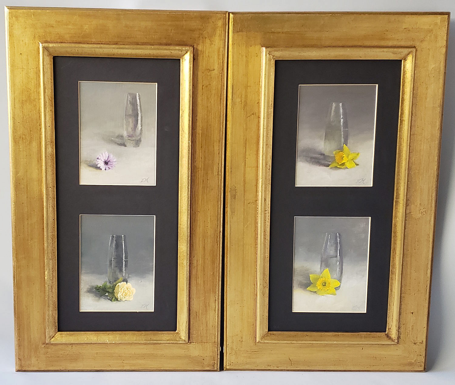 Pair of Evelyn Ann McFarlane Contemporary Oil on Board Bud Vase Still Life Paintings, each frame housing two individual paintings, each signed lower right, “EM”.