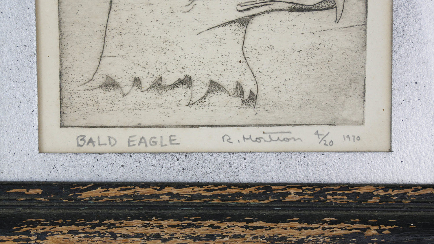 R. Mortross Limited Edition Etching “Bald Eagle”, circa 1970 Consign Now DeptFine ArtsSize4.5" x 5.5" Overall 7.5" x 9.5" R. Mortross Limited Edition Etching “Bald Eagle”, circa 1970 Ed. # 4/20, pencil titled and signed indistinctly lower right R. Mortross 4/20, 1970, in distressed wood frame 4.5″ x 5.5″ Overall 7.5″ x 9.5″ Please note that this auction has ended. Click here for an overview of this auction.