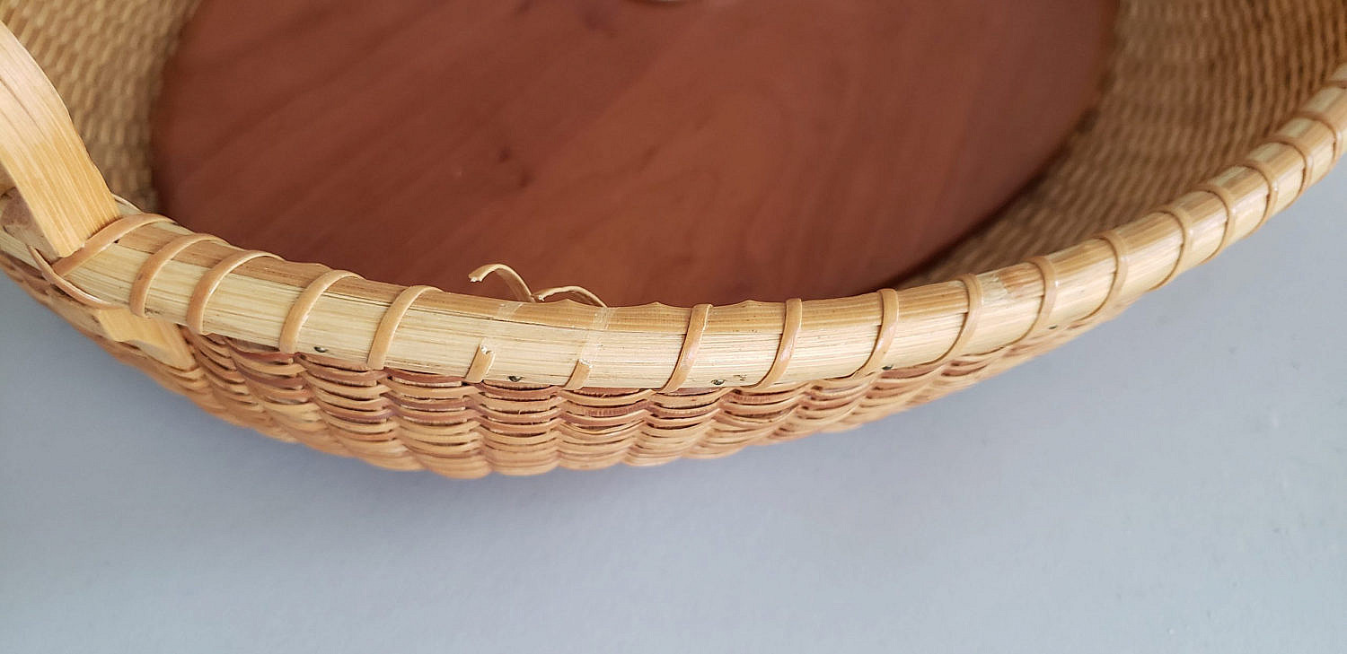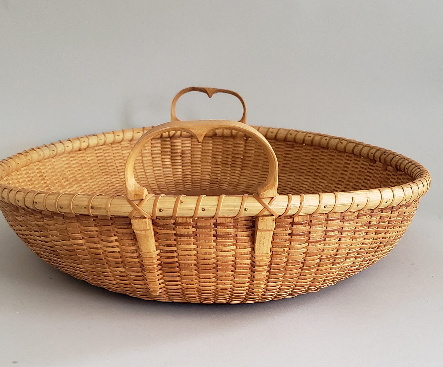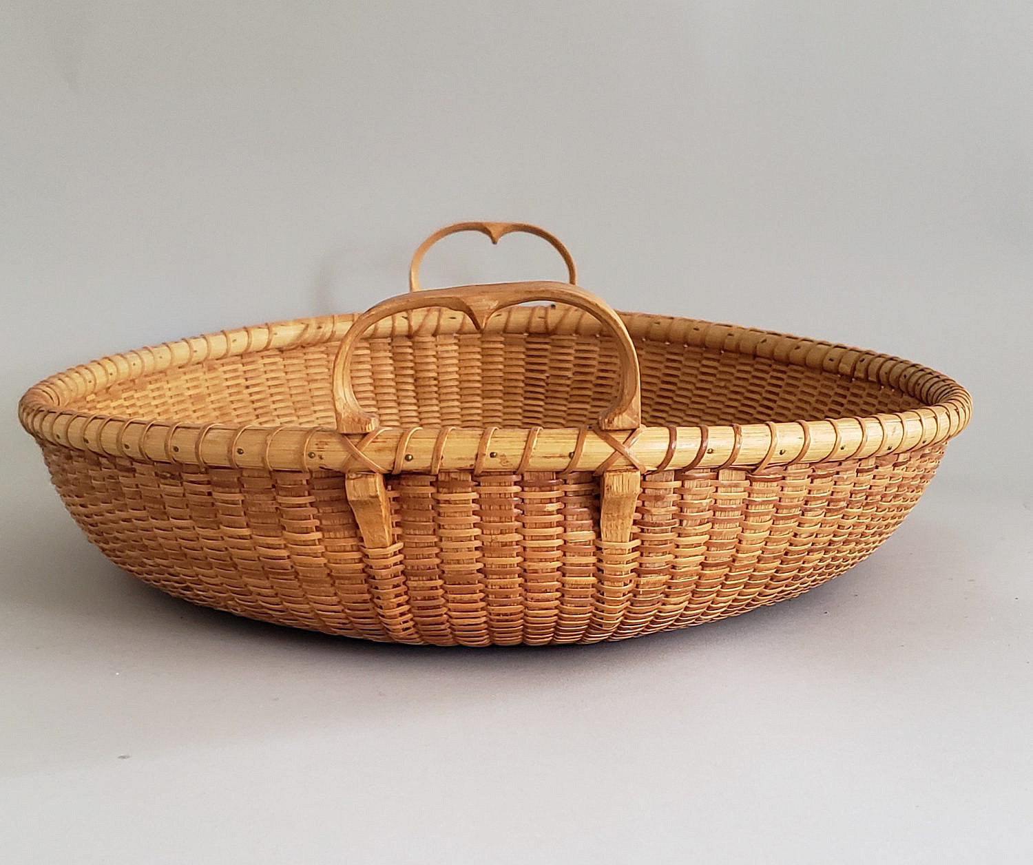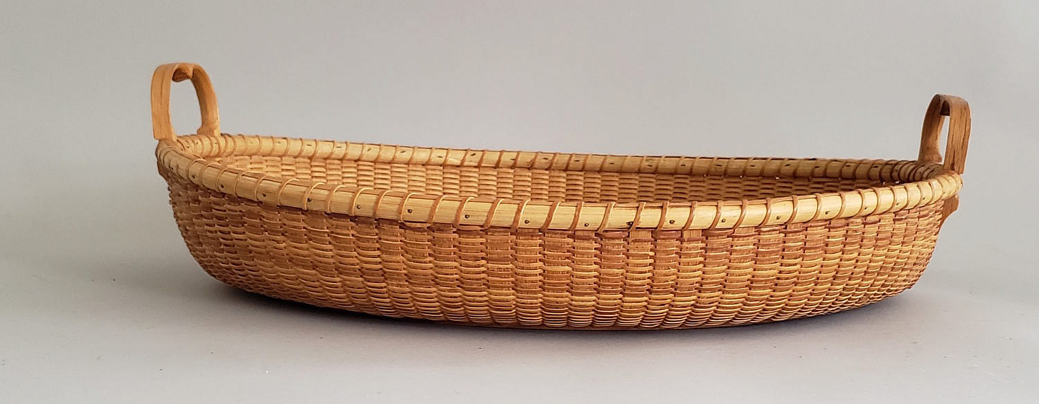 Susanne Loveland Contemporary Nantucket Basket Serving Tray, dual flanking carrying handles, name plaque affixed to front,”Levi Starbuck House October 30, 2002″, signed upon the base, “Susanne Loveland, 5/02”. Two small portions of rim wrap have been separated as seen in photos.