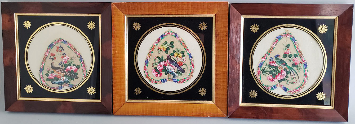 Three Framed China Trade Painted Pith Paper Fans, circa 1860 Consign Now DeptAsian Arts/China Trade, Fine ArtsSizeOverall 11.25 in. x 11.25 in. Three Framed China Trade Painted Pith Paper Fans, circa 1860, floral and phoenix bird decoration, each housed in a wooden frame with a reverse painting on glass matting. Overall 11.25 in. x 11.25 in. Please note that this auction has ended. Click here for an overview of this auction.